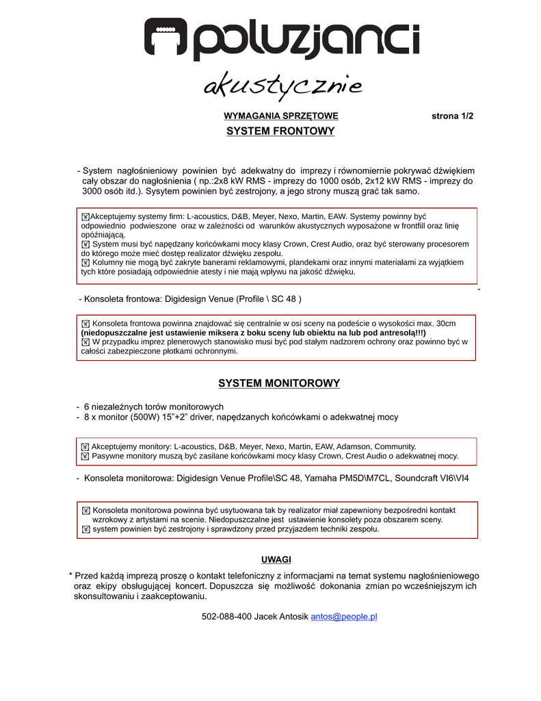 akustycznie WYMAGANIA SPRZĘTOWE strona 1/2 SYSTEM FRONTOWY - System nagłośnieniowy powinien być adekwatny do imprezy i równomiernie pokrywać dźwiękiem cały obszar do nagłośnienia ( np.:2x8 kW RMS - imprezy do 1000 osób, 2x12 kW RMS - imprezy do 3000 osób itd.). Sysytem powinien być zestrojony, a jego strony muszą grać tak samo. Akceptujemy systemy firm: Lacoustics, D&B, Meyer, Nexo, Martin, EAW. Systemy powinny być odpowiednio podwieszone oraz w zależności od warunków akustycznych wyposażone w frontfill oraz linię opóźniającą. System musi być napędzany końcówkami mocy klasy Crown, Crest Audio, oraz być sterowany procesorem do którego może mieć dostęp realizator dźwięku zespołu. Kolumny nie mogą być zakryte banerami reklamowymi, plandekami oraz innymi materiałami za wyjątkiem tych które posiadają odpowiednie atesty i nie mają wpływu na jakość dźwięku. - Konsoleta frontowa: Digidesign Venue (Profile \ SC 48 ) Konsoleta frontowa powinna znajdować się centralnie w osi sceny na podeście o wysokości max. 30cm (niedopuszczalne jest ustawienie miksera z boku sceny lub obiektu na lub pod antresolą!!!) W przypadku imprez plenerowych stanowisko musi być pod stałym nadzorem ochrony oraz powinno być w całości zabezpieczone płotkami ochronnymi. SYSTEM MONITOROWY - 6 niezależnych torów monitorowych - 8 x monitor (500W) 15”+2” driver, napędzanych końcówkami o adekwatnej mocy Akceptujemy monitory: Lacoustics, D&B, Meyer, Nexo, Martin, EAW, Adamson, Community. Pasywne monitory muszą być zasilane końcówkami mocy klasy Crown, Crest Audio o adekwatnej mocy. - Konsoleta monitorowa: Digidesign Venue Profile\SC 48, Yamaha PM5D\M7CL, Soundcraft VI6\VI4 Konsoleta monitorowa powinna być usytuowana tak by realizator miał zapewniony bezpośredni kontakt wzrokowy z artystami na scenie. Niedopuszczalne jest ustawienie konsolety poza obszarem sceny. system powinien być zestrojony i sprawdzony przed przyjazdem techniki zespołu. UWAGI * Przed każdą imprezą proszę o kontakt telefoniczny z informacjami na temat systemu nagłośnieniowego oraz ekipy obsługującej koncert. Dopuszcza się możliwość dokonania zmian po wcześniejszym ich skonsultowaniu i zaakceptowaniu. 502-088-400 Jacek Antosik [email protected] akustycznie Strona 2/2 Input list Rodzaj źródła set 1 set 1 set 1 set 1 set 1 set 2 set 2 set 2 set 2 ND 868 Beta 56a / SM 57 SM 81/ 451EB EB 451B / SM 81 SM 81/ 451EB ATM 35x / 350 ATM 35x / 350 ATM 35x / 350 ATM 35x / 350 D.I. active D.I. active D.I. active D.I. active SM 81/ 451EB D.I. D.I. D.I. D.I. D.I. D.I. SM 58 SM 58 KSM 9 --Mini Jack / Vo c R 2 AUX 5 BASS Acc. 220v 1 /2 /3 DRU M set S 2 MONIT O 220v GITARA ROL AND No rd 2 AUX 6 o/ Bo ng AU DRUMS set 1 D1 NOR Voc 1 220v R AU OR MONIT X4 220v OR MONIT X5 Stopa Werbel (góra) Werbel (dół) Hi-Hat Overhead Stopa 2 Werbel 2 Udu Cajon Bass 1 Bass 2 Bass 3 Gitara Acc. Bongosy Nord 1 (L) Nord 1 (R) Roland (L) Roland (R) Nord 2 (L) Nord 2 (R) Voc 1 Mały Voc 2 Japco Voc 3 Kuba zapas i-Pod 1. 2. 3. 4. 5. 6. 7. 8. 9. 10. 11. 12. 13. 14. 15. 16. 17. 18. 19. 20. 21. 22. 23. 24. 25/26 Mic / D.I. MONIT O Numer kanału KUBA voc AUX 1 MONITOR AUX 3 OR NIT MO AUX 2 MONITOR AU IT OR X2 MO N