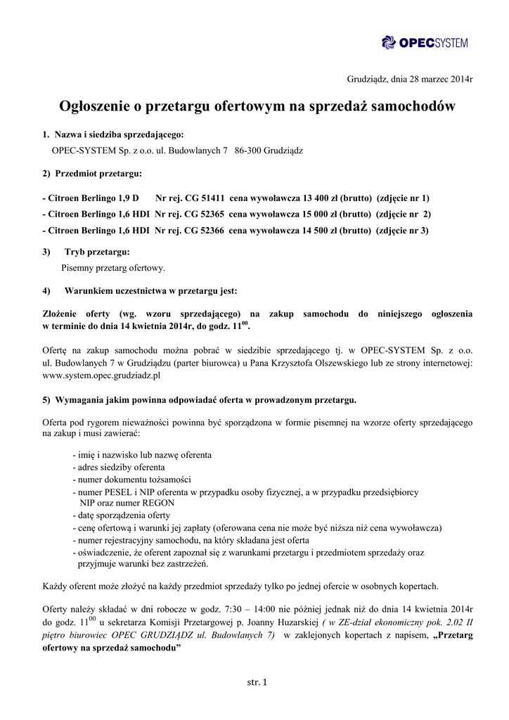 Grudziądz, dnia 28 marzec 2014r Ogłoszenie o przetargu ofertowym na sprzedaż samochodów 1. Nazwa i siedziba sprzedającego: OPEC-SYSTEM Sp. z o.o. ul. Budowlanych 7 86-300 Grudziądz 2) Przedmiot przetargu: - Citroen Berlingo 1,9 D Nr rej. CG 51411 cena wywoławcza 13 400 zł (brutto) (zdjęcie nr 1) - Citroen Berlingo 1,6 HDI Nr rej. CG 52365 cena wywoławcza 15 000 zł (brutto) (zdjęcie nr 2) - Citroen Berlingo 1,6 HDI Nr rej. CG 52366 cena wywoławcza 14 500 zł (brutto) (zdjęcie nr 3) 3) Tryb przetargu: Pisemny przetarg ofertowy. 4) Warunkiem uczestnictwa w przetargu jest: Złożenie oferty (wg. wzoru sprzedającego) na w terminie do dnia 14 kwietnia 2014r, do godz. 1100. zakup samochodu do niniejszego ogłoszenia Ofertę na zakup samochodu można pobrać w siedzibie sprzedającego tj. w OPEC-SYSTEM Sp. z o.o. ul. Budowlanych 7 w Grudziądzu (parter biurowca) u Pana Krzysztofa Olszewskiego lub ze strony internetowej: www.system.opec.grudziadz.pl 5) Wymagania jakim powinna odpowiadać oferta w prowadzonym przetargu. Oferta pod rygorem nieważności powinna być sporządzona w formie pisemnej na wzorze oferty sprzedającego na zakup i musi zawierać: - imię i nazwisko lub nazwę oferenta - adres siedziby oferenta - numer dokumentu tożsamości - numer PESEL i NIP oferenta w przypadku osoby fizycznej, a w przypadku przedsiębiorcy NIP oraz numer REGON - datę sporządzenia oferty - cenę ofertową i warunki jej zapłaty (oferowana cena nie może być niższa niż cena wywoławcza) - numer rejestracyjny samochodu, na który składana jest oferta - oświadczenie, że oferent zapoznał się z warunkami przetargu i przedmiotem sprzedaży oraz przyjmuje warunki bez zastrzeżeń. Każdy oferent może złożyć na każdy przedmiot sprzedaży tylko po jednej ofercie w osobnych kopertach. Oferty należy składać w dni robocze w godz. 7:30 – 14:00 nie później jednak niż do dnia 14 kwietnia 2014r do godz. 1100 u sekretarza Komisji Przetargowej p. Joanny Huzarskiej ( w ZE-dział ekonomiczny pok. 2.02 II piętro biurowiec OPEC GRUDZIĄDZ ul. Budowlanych 7) w zaklejonych kopertach z napisem, „Przetarg ofertowy na sprzedaż samochodu” str. 1 Warunkiem przyjęcia oferty jest wpłata wadium w wysokości 10% ceny wywoławczej przedmiotu przetargu, którego dotyczy składana oferta. Wpłata wadium w kasie siedziby sprzedającego w Grudziądzu ul. Budowlanych 7 (parter biurowca). 6) Miejsce i termin przeprowadzenia przetargu: Otwarcie ofert nastąpi w dniu 14 kwietnia 2014r w siedzibie spółki o godz. 1130 w Sali Konferencyjnej (biurowiec I piętro). 7) Miejsce i termin, w którym można obejrzeć przedmiot przetargu. Przedmiot przetargu można oglądać w siedzibie sprzedającego tj. w OPEC-SYSTEM Sp. z o.o. ul. Budowlanych 7 w Grudziądzu w dni robocze od godz. 8:00 do 14:00 od dnia 31 marca 2014r oraz w dniu przetargu tj. 14 kwietnia 2014r od godz. 800 do godz. 1100 po wcześniejszym uzgodnieniu telefonicznym terminu z Panem Krzysztofem Olszewskim pod numerem telefonu 56 4506-203 (Wydział Sieci). 8). Termin sprzedaży: 1. Wyłonienie przez Komisję Przetargową najkorzystniejszej oferty. 2. Faktura VAT zostanie wystawiona przez sprzedającego w terminie 3 dni od dnia zakończenia przetargu. 3. Kupujący zobowiązany jest do uiszczenia kwoty zakupu w kasie spółki OPEC-SYSTEM przy ul. Budowlanych 7 (parter biurowca), w ciągu 7 dni licząc od dnia dostarczenia faktury. 4. Sprzedający zastrzega sobie własność pojazdu do chwili uiszczenia przez Kupującego kwoty nabycia. 9). Inne informacje: a) Przetarg odbędzie się chociażby złożono tylko jedną ofertę na przedmiot przetargu b) Komisja przetargowa wybierze oferenta, który zaoferuje najwyższą cenę na wybrany pojazd objęty przedmiotem przetargu. c) W przypadku złożenia równorzędnych ofert o najwyższej wartości, komisja przetargowa zorganizuje dodatkowy przetarg w formie aukcji dla oferentów , którzy złożyli te oferty, z kwotą postąpienia nie niższą niż 100,00 zł. d) Sprzedający zastrzega sobie możliwość zmiany lub odwołania warunków przetargu. e) Organizatorowi przetargu przysługuje prawo zamknięcia przetargu bez wybrania którejkolwiek oferty. f) Sprzedający nie udziela gwarancji na stan samochodu objętego przetargiem ani nie odpowiada za wady ukryte. 10). Komisja przetargowa odrzuca ofertę jeżeli: - została złożona po wyznaczonym terminie lub niewłaściwym miejscu - nie zawiera danych i dokumentów o których mowa w pkt. 5 lub są one niekompletne, nieczytelne lub budzą inne wątpliwości, zaś złożenie wyjaśnień mogłoby prowadzić do uznania jej za nową ofertę. 11). O odrzuceniu oferty komisja przetargowa zawiadamia niezwłocznie oferenta. str. 2