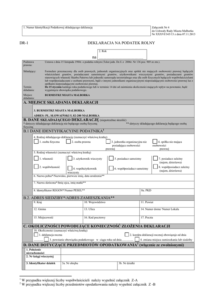 1. Numer Identyfikacji Podatkowej składającego deklarację DR-1 Załącznik Nr 4 do Uchwały Rady Miasta Malborka Nr XXXVI/345/13 z dnia 07.11.2013 DEKLARACJA NA PODATEK ROLNY 2. Rok na ………………………………………. Podstawa prawna: Ustawa z dnia 15 listopada 1984r. o podatku rolnym (Tekst jedn. Dz.U.z 2006r. Nr 136 poz. 969 ze zm.). Składający: Formularz przeznaczony dla osób prawnych, jednostek organizacyjnych oraz spółek nie mających osobowości prawnej będących właścicielami gruntów, posiadaczami samoistnymi gruntów, użytkownikami wieczystymi gruntów, posiadaczami gruntów stanowiących własność Skarbu Państwa lub jednostki samorządu terytorialnego oraz dla osób fizycznych będących współwłaścicielami lub współposiadaczami z osobami prawnymi, bądź z innymi jednostkami organizacyjnymi nieposiadającymi osobowości prawnej luz z spółkami nieposiadającymi osobowości prawnej. Do 15 stycznia każdego roku podatkowego lub w terminie 14 dni od zaistnienia okoliczności mających wpływ na powstanie, bądź wygaśnięcie obowiązku podatkowego. Termin składania: Miejsce składania: BURMISTRZ MIASTA MALBORKA A. MIEJSCE SKŁADANIA DEKLARACJI 3. BURMISTRZ MIASTA MALBORKA ADRES: PL. SŁOWAIŃSKI 5, 82-200 MALBORKA B. DANE SKŁADAJĄCEGO DEKLARACJĘ (niepotrzebne skreślić) *-dotyczy składającego deklarację nie będącego osobą fizyczną fizyczną **-dotyczy składającego deklarację będącego osobą B.1 DANE IDENTYFIKACYJNE PODATNIKA1 4. Rodzaj składającego deklarację (zaznaczyć właściwą kratkę) 1. osoba fizyczna 2. osoba prawna 3. jednostka organizacyjna nie posiadająca osobowości prawnej 4. spółka nie mająca osobowości prawnej 5. Rodzaj własności (zaznaczyć właściwą kratkę) 1. własność 3. użytkownik wieczysty 2. współwłasność 4. współużytkownik wieczysty 6. Nazwa pełna*/Nazwisko, pierwsze imię, data urodzenia** 5. posiadacz samoistny 6. współposiadacz samoistny 7. posiadacz zależny (najem, dzierżawa) 8. współposiadacz zależny (najem, dzierżawa) 7. Nazwa skrócona*/Imię ojca, imię matki** 8. Identyfikator REGON*/Numer PESEL** 8a. PKD B.2. ADRES SIEDZIBY*/ADRES ZAMIESZKANIA** 9. Kraj 10. Województwo 11. Powiat 12. Gmina 13. Ulica 14. Numer domu/ Numer Lokalu 15. Miejscowość 16. Kod pocztowy 17. Poczta C. OKOLICZNOŚCI POWODUJĄCE KONIECZNOŚĆ ZŁOŻENIA DEKLARACJI 18. Okoliczności (zaznaczyć właściwą kratkę) 1. deklaracja roczna ............. 2. korekta deklaracji rocznej obowiązuje od dnia 3. powstanie obowiązku podatkowego w ciągu roku od dnia………… 4. zmiana miejsca zamieszkania lub siedziby D. DANE DOTYCZĄCE PRZEDMIOTÓW OPODATKOWANIA2 (włącznie ze zwolnionymi) 1. Położenie nieruchomości 2. Nr księgi wieczystej 3. Identyfikator działek 1 2 3a. Nr obrębu 3b. Nr działki W przypadku większej liczby współwłaścicieli należy wypełnić załącznik Z-A W przypadku większej liczby przedmiotów opodatkowania należy wypełnić załącznik Z -B Klasy użytków wynikające z ewidencji gruntów Powierzchnia gruntów w hektarach fizycznych ( z dokładnością do czterech miejsc po przecinku) Ogółem Nie podlegające przeliczeniu na ha przeliczeniowe Podlegające przeliczeniu na ha przeliczeniowe Grunty orne (R) I II IIIa IIIb IVa IVb V VI VIz Sady (S-R,S-Ł,SPs) I II IIIa IIIb IVa IVb V VI VIz Użytki zielone (Ps, Ł) I II III IV V VI VIz Grunty rolne zabudowane (B/R, B/Ps ,B/Ł) I II IIIa III IIIb IVa IV IVb V VI VIz 3 Należy podać z dokładnością do czterech miejsc po przecinku Liczba hektarów 3 przeliczeniowych Stawka z 1ha (przeliczeniowego lub fizycznego w zł, gr) Wymiar podatku rolnego w zł, gr Grunty pod stawami a)zarybione, łososiem, trocią,głowacicą, palią i pstrągiem b) zarybione, innymi gatunkami ryb niż w poz.a) c) grunty pod stawami niezarybionymi Rowy Grunty zadrzewione i zakrzaczone położone na UR I II IIIa III IIIb IVa IV V VI VIz RAZEM (bez zwolnień) E. INNE ZWOLNIENIA W PODATKU ROLNYM OD GRUNTÓW 1. 2. 3. 4. RAZEM F. ULGI W PODATKU ROLNYM OD GRUNTÓW 1. z tytułu nabycia lub objęcia w zagospodarowanie gruntów 2. inwestycyjne 3. górskie 4. inne RAZEM G. ŁĄCZNA KWOTA PODATKU 19. Kwota podatku ( po zaokrągleniu do pełnych złotych) (różnica kwot z D-(E+F) 20. Kwota miesięcznych rat ( art. 6, ust. 9, pkt 3 ustawy z dnia 12 stycznia 1991r. o podatkach i opłatach lokalnych). Kwotę miesięcznych rat należy zaokrąglić do pełnych złotych ( zgodnie z art. 63 § 1 ustawy z dnia 29 sierpnia 1997r. – Ordynacja podatkowa) ostatnia rata jest ratą wyrównawczą. I II III IV H. INFORMACJA O ZAŁĄCZNIKACH (do niniejszej deklaracji załączono) 21. Liczba załączników Z-A ………………………………….. 22. Liczba załączników Z -B ………………………………….. I. ADRES DO KORESPONDENCJI 23. Kraj 24. Województwo 25. Powiat 26. Gmina 27. Ulica 28. Numer domu/ numer lokalu 29. Miejscowość 30. Kod pocztowy 31. Poczta 32. Adres e-mail/ nr telefonu kontaktowego ( pole nieobowiązkowe ) H. OŚWIADCZENIE I PODPIS SKŁADAJĄCEGO/OSOBY REPREZENTUJĄCEJ SKŁADAJĄCEGO 34. Imię 35. Nazwisko 36. Data wypełnienia (dzień-miesiąc-rok) 37. Podpis (pieczęć składającego/osoby reprezentującej składającego I. ADNOTACJE ORGANU PODATKOWEGO 38. Uwagi organu podatkowego 39. Przypis 40. Odpis 41. Podpis przyjmującego formularz POUCZENIE: W przypadku nie wpłacenia w obowiązujących terminach kwot poszczególnych rat podatku lub wpłacenia ich w niepełnej wysokości niniejsza deklaracja stanowi podstawę do wystawienia tytułu wykonawczego, zgodnie przepisami ustawy z dnia 17 czerwca 1966r. o postępowaniu egzekucyjnym w administracji (Dz.U. z 2012 poz. 1015 ze zm.) Podatnik, który nie dopełnia obowiązku złożenia deklaracji na podatek rolny, podaje nieprawdę, podlega sankcjom określonym w art.54, art.55 oraz w art.56 Kodeksu karno-skarbowego – ustawy z dnia 10.09.1999r. (Dz.U. z 2013 poz.186 ze zm ). Zg