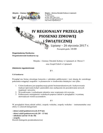 Miejsko – Gminny Ośrodek Kultury w Lipianach ul. Okrzei 5 74-240 Lipiany tel./fax: (091) 564-10-91 e-mail: [email protected] http://www.mgoklipiany.pl IV REGIONALNY PRZEGLĄD PIOSENKI ZIMOWEJ i ŚWIĄTECZNEJ Lipiany – 26 stycznia 2017 r. Początek godz. 10:00 Organizatorzy Konkursu Organizatorami konkursu są: Miejsko - Gminny Ośrodek Kultury w Lipianach ul. Okrzei 5 oraz Zespół Szkół w Lipianach Założenia regulaminowe § 1. Cel konkursu Przegląd ma formę otwartego koncertu z udziałem publiczności i jest okazją do szerokiego pokazania osiągnięć zespołów i wykonawców w środowisku lokalnym i nie tylko. 1. Celem konkursu jest popularyzacja pieśni bożonarodzeniowych i kultywowanie tradycji śpiewania kolęd i pastorałek oraz zachęcenie do poszukiwania nowych inspiracji i utworów. 2. Wyszukiwanie i rozbudzanie talentów oraz wspieranie ich rozwoju. 3. Podnoszenie umiejętności wokalnych poprzez udział w przeglądzie i wymianę doświadczeń wśród uczestników. § 2. W przeglądzie biorą udział soliści, zespoły wokalne, zespoły wokalno – instrumentalne oraz chóry w czterech kategoriach: - dzieci szkół podstawowych (5-9 lat) - dzieci szkół podstawowych (10 - 13 lat) - młodzież (od lat 14 do 18) - zespoły. Dorośli (kategoria pozakonkursowa) § 3. 1. Wykonawcy prezentują się w jednym utworze. Wykonawcom może towarzyszyć akompaniament „na żywo” lub podkład muzyczny (półplayback) nagrany na opisanych płytach CD (płyty nagrane z prędkością max 12x) lub na nośnikach USB (FAT / FAT 32). Soliści mogą być wspierani chórkiem na żywo. § 4. Kryteria oceny: - dobór repertuaru, - emisja głosu, - opracowanie muzyczne, - dykcja, rytmika, - interpretacja (frazowanie, dynamika), - poziom zespołowego warsztatu wykonawców, - ogólny wyraz artystyczny. § 5. 1. Konkurs odbywa się 26 stycznia 2017r. godz. 10:00 w Miejsko-Gminnym Ośrodku Kultury w Lipianach ul. Okrzei 5 2. Informacji na temat konkursu udziela kierownik organizacyjny: Michał Jura - tel. 533 220 222 3. W przypadku małej ilości uczestników organizatorzy zastrzegają sobie prawo do zmian podziałów na inne kategorie. 4. Komisję konkursową powołują organizatorzy. 5. Kartę zgłoszenia wg wzoru należy dostarczyć do 20 stycznia 2017 r. (poczta, [email protected], fax 91 564 16 66) § 6. Nagrody 1. Jury przyznaje w każdej z kategorii nagrodę główną oraz za drugie i trzecie miejsca (przewidziano nagrody rzeczowe). 2. Jury może przyznać dodatkowo wyróżnienia w każdej kategorii. §8 Uwagi końcowe 1. Organizatorzy nie pokrywają kosztów dojazdu uczestników konkursu i ich opiekunów. 2. Organizator nie ponosi odpowiedzialności za ewentualne wypadki i szkody powstałe w czasie trwania konkursu. 3. Ubezpieczenie uczestników należy do jednostki delegującej. 4. Organizatorzy zapewniają posiłek oraz gorące napoje. Sprawy nieujęte w regulaminie rozstrzyga Organizator Przeglądu. Godzinowy rozkład przeglądu dostępny będzie w dniu przeglądu. Serdecznie zapraszamy! IV REGIONALNY PRZEGLĄD PIOSENKI ZIMOWEJ i ŚWIĄTECZNEJ Lipiany – 26 stycznia 2017 r. KARTA UCZESTNICTWA 1. Imię i nazwisko wokalisty / wokalistki / wiek / lub nazwa zespołu. .......................................................................................................................... 2. Adres/Tel. kontaktowy/email ........................................................................................................................... 3. Kategorie a) b) c) d) dzieci szkół podstawowych (5-9 lat), dzieci szkół podstawowych (10 – 13 lat), młodzież szkół gimnazjalnych i ponadgimnazjalnych zespół 4. Repertuar ( tytuł, kompozytor, autor tekstu ) 1.…………………………………………………………………………………………… …………………………………………………………………………………………….. 5. Forma akompaniamentu: a) półplayback – CD, inne: ………………………………………….. b) zespół/liczba wykonawców w zespole oraz rodzaj instrumentów ………………………………………………………………………………………… ………………………………………………………………………………………… 6. Wymagania techniczne ................................................................................................................................................. ................................................................................................................................................. ................................................................................................................................................. 7. Osoba odpowiedzialna, opiekun /kontakt tel./ ………………………………………………………………………………………………. 8. Instytucja delegująca ……………………………………………………………………………………………….