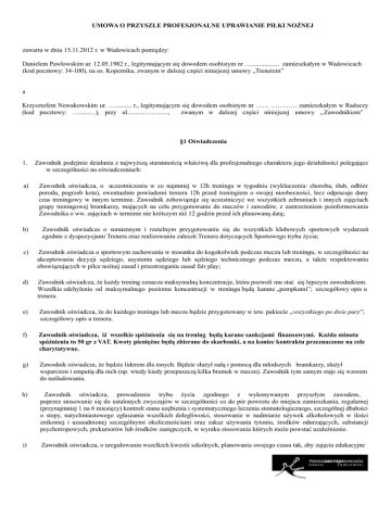 UMOWA O PRZYSZŁE PROFESJONALNE UPRAWIANIE PIŁKI NOŻNEJ zawarta w dniu 15.11.2012 r. w Wadowicach pomiędzy: Danielem Pawłowskim ur. 12.05.1982 r., legitymującym się dowodem osobistym nr …................. zamieszkałym w Wadowicach (kod pocztowy: 34-100), na os. Kopernika, zwanym w dalszej części niniejszej umowy „Trenerem” a Krzysztofem Nowakowskim ur. ….......... r., legitymującym się dowodem osobistym nr …… ………… zamieszkałym w Radoczy (kod pocztowy: …..........), przy ul........................., zwanym w dalszej części niniejszej umowy „ Zawodnikiem” §1 Oświadczenia 1. Zawodnik podejmie działania z najwyższą starannością właściwą dla profesjonalnego charakteru jego działalności polegające w szczególności na oświadczeniach: a) Zawodnik oświadcza, o uczestniczeniu w co najmniej w 12h treningu w tygodniu (wykluczenia: choroba, ślub, odbiór porodu, pogrzeb kota), ewentualnie powiadomi trenera 12h przed treningiem o swojej nieobecności, lecz odpracuje dany czas treningowy w innym terminie. Zawodnik zobowiązuje się uczestniczyć we wszystkich zebraniach i innych zajęciach grupy treningowej bramkarzy, mających na celu przygotowanie do meczów i zawodów, z zastrzeżeniem poinformowania Zawodnika o ww. zajęciach w terminie nie krótszym niż 12 godzin przed ich planowaną datą; b) Zawodnik oświadcza o sumiennym i rzetelnym przygotowaniu się do wszystkich klubowych sportowych wydarzeń zgodnie z dyspozycjami Trenera oraz realizowaniu zaleceń Trenera dotyczących Sportowego trybu życia; c) Zawodnik oświadcza o sportowym zachowaniu w stosunku do kogokolwiek podczas meczu lub treningu, w szczególności na akceptowaniu decyzji sędziego, asystenta sędziego lub sędziego technicznego podczas meczu, a także respektowaniu obowiązujących w piłce nożnej zasad i przestrzeganiu zasad fair play; d) Zawodnik oświadcza, że każdy trening oznacza maksymalną koncentracje, która pozwoli mu stać się lepszym zawodnikiem. Wszelkie odchylenia od maksymalnego poziomu koncentracji w treningu będą karane „pompkami”; szczegółowy opis u trenera. e) Zawodnik oświadcza, że do każdego treningu lub meczu będzie przygotowany w tzw. pakiecie „wszystkiego po dwie pary”; szczegółowy opis u trenera. f) Zawodnik oświadcza, iż wszelkie spóźnienia się na trening będą karane sankcjami finansowymi. Każda minuta spóźnienia to 50 gr z VAT. Kwoty pieniężne będą zbierane do skarbonki, a na koniec kontraktu przeznaczone na cele charytatywne. g) Zawodnik oświadcza, że będzie liderem dla innych. Będzie służył radą i pomocą dla młodszych bramkarzy, służył wsparciem i empatią dla nich (np. wtedy kiedy przepuszczą kilka bramek w meczu). Zawodnik tym samym staje się wzorem do naśladowania. h) Zawodnik oświadcza, prowadzenie trybu życia zgodnego z wykonywanym przyszłym zawodem, poprzez stosowanie się do ustalonych zwyczajów w szczególności co do pór powrotu do miejsca zamieszkania, regularnej (przynajmniej 1 na 6 miesięcy) kontroli stanu uzębienia i systematycznego leczenia stomatologicznego, szczególnej dbałości o stopy, natychmiastowego zgłaszania wszelkich dolegliwości, stosowanie w nadmiarze używek alkoholowych w ilości znikomej i uzasadnionej szczególnymi okolicznościami oraz zakaz używania tytoniu, środków odurzających, substancji psychotropowych, prekursorów lub środków zastępczych, w wyniku stosowania których może powstać uzależnienie. i) Zawodnik oświadcza, o uregulowaniu wszelkich kwestii szkolnych, planowaniu swojego czasu tak, aby zajęcia edukacyjne zachowały swój należyty prymat oraz aby wszelkiej maści pedagodzy nie wydzwaniali do Trenera, w kwestiach ewentualnego opuszczania ich lekcji przez Zawodnika; j) Zawodnik oświadcza o nieudzielaniu informacji o wewnętrznych sprawach bramkarzy osobom trzecim; k) Zawodnik oświadcza o powstrzymywaniu się od indywidualnego uprawiania dyscyplin sportowych i rekreacji ruchowej szczególnie w zakresie alpinizmu, skateboardingu, skoków spadochronowych, kajakarstwa górskiego, parkour, skoków bazowych, sportów motorowych, narciarskich, łyżwiarskich, lotniczych, dalekowschodnich sztuk walki, a także innych stwarzających potencjalne zagrożenia dla życia i zdrowia Zawodnika; 2. Trener podejmie działania z najwyższą starannością właściwą dla profesjonalnego charakteru jego działalności polegające w szczególności na oświadczeniach: a) Trener oświadcza o sumiennym przygotowaniu do treningu, przygotowaniu wszystkich niezbędnych pomocy służących dalszemu rozwojowi zawodnika oraz rzetelnemu udzielaniu informacji zwrotnej dla Zawodnika. b) c) d) Trener oświadcza, że służy pomocą transportowo-logistyczną na terenie gminy Tomice (tzw. forma „na i z treningu”). Trener oświadcza o dostępie do 24h infolinii kontaktowej. Koszt połączenia określa operator. Trener oświadcza o 24h dostępie na trening. Jakikolwiek dzień (oprócz niedzieli 13:30-17.00 „obiad u mamy”) oraz pora dnia (oprócz zaplanowanych już zajęć z innymi grupami). §2 Przedmiot umowy Zawodnik zobowiązuje się do reprezentowania barw Klubu Karol Wadowice w charakterze piłkarza w krajowych i międzynarodowych zawodach sportowych oraz do wykonywania innych zobowiązań wynikających z niniejszej umowy (tj. przygotowania do dalszych etapów kariery zawodniczej). §3 Okres obowiązywania umowy Niniejsza umowa zostaje zawarta na czas określony od dnia 15.11.2012 r. do dnia 30 czerwca 2013 r. §4 Zawieszenia oraz rozwiązanie umowy Umowa może zostać rozwiązana za porozumieniem Stron. 1. Trener wystąpi o zawieszenie Zawodnika, a w ostatecznym etapie rozwiązaniem niniejszej umowy z winy Zawodnika w razie ciężkiego naruszenia przez Zawodnika podstawowych obowiązków zawodniczych określonych niniejszą umową, w szczególności w przypadku: a) nieregularnym uczestniczeniu w zajęciach treningowych oraz meczach. b) braku powia