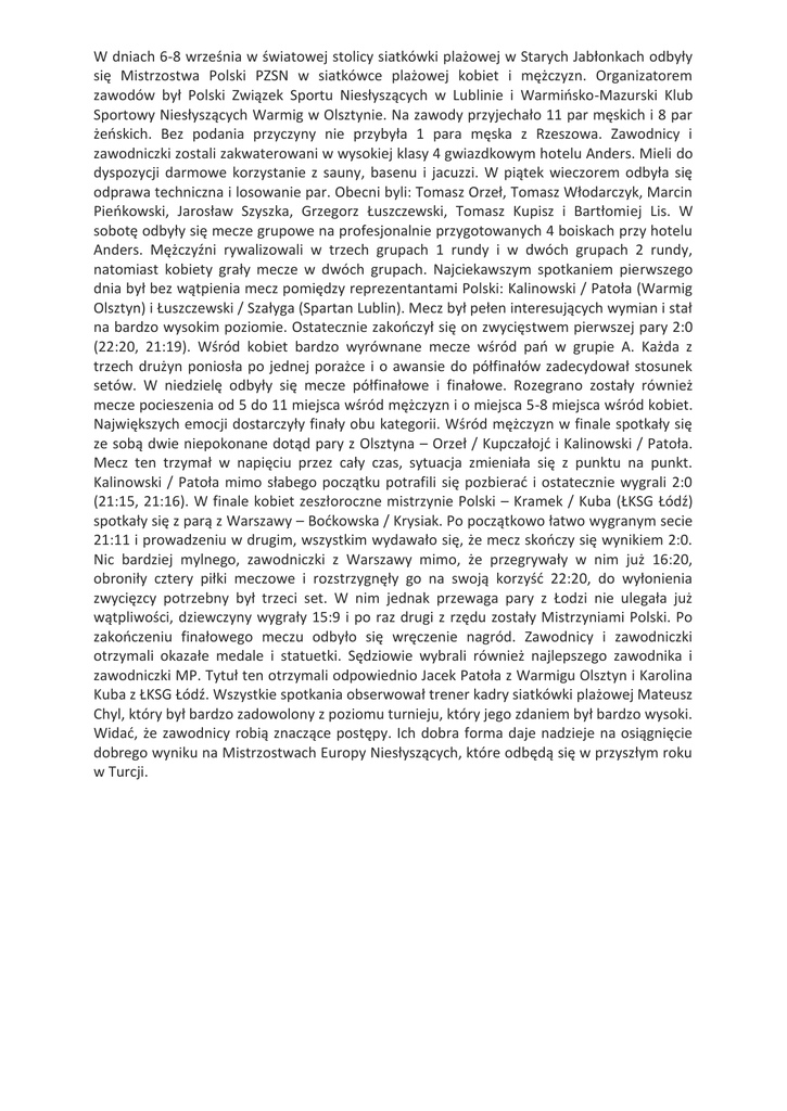 W dniach 6-8 września w światowej stolicy siatkówki plażowej w Starych Jabłonkach odbyły się Mistrzostwa Polski PZSN w siatkówce plażowej kobiet i mężczyzn. Organizatorem zawodów był Polski Związek Sportu Niesłyszących w Lublinie i Warmińsko-Mazurski Klub Sportowy Niesłyszących Warmig w Olsztynie. Na zawody przyjechało 11 par męskich i 8 par żeńskich. Bez podania przyczyny nie przybyła 1 para męska z Rzeszowa. Zawodnicy i zawodniczki zostali zakwaterowani w wysokiej klasy 4 gwiazdkowym hotelu Anders. Mieli do dyspozycji darmowe korzystanie z sauny, basenu i jacuzzi. W piątek wieczorem odbyła się odprawa techniczna i losowanie par. Obecni byli: Tomasz Orzeł, Tomasz Włodarczyk, Marcin Pieńkowski, Jarosław Szyszka, Grzegorz Łuszczewski, Tomasz Kupisz i Bartłomiej Lis. W sobotę odbyły się mecze grupowe na profesjonalnie przygotowanych 4 boiskach przy hotelu Anders. Mężczyźni rywalizowali w trzech grupach 1 rundy i w dwóch grupach 2 rundy, natomiast kobiety grały mecze w dwóch grupach. Najciekawszym spotkaniem pierwszego dnia był bez wątpienia mecz pomiędzy reprezentantami Polski: Kalinowski / Patoła (Warmig Olsztyn) i Łuszczewski / Szałyga (Spartan Lublin). Mecz był pełen interesujących wymian i stał na bardzo wysokim poziomie. Ostatecznie zakończył się on zwycięstwem pierwszej pary 2:0 (22:20, 21:19). Wśród kobiet bardzo wyrównane mecze wśród pań w grupie A. Każda z trzech drużyn poniosła po jednej porażce i o awansie do półfinałów zadecydował stosunek setów. W niedzielę odbyły się mecze półfinałowe i finałowe. Rozegrano zostały również mecze pocieszenia od 5 do 11 miejsca wśród mężczyzn i o miejsca 5-8 miejsca wśród kobiet. Największych emocji dostarczyły finały obu kategorii. Wśród mężczyzn w finale spotkały się ze sobą dwie niepokonane dotąd pary z Olsztyna – Orzeł / Kupczałojć i Kalinowski / Patoła. Mecz ten trzymał w napięciu przez cały czas, sytuacja zmieniała się z punktu na punkt. Kalinowski / Patoła mimo słabego początku potrafili się pozbierać i ostatecznie wygrali 2:0 (21:15, 21:16). W finale kobiet zeszłoroczne mistrzynie Polski – Kramek / Kuba (ŁKSG Łódź) spotkały się z parą z Warszawy – Boćkowska / Krysiak. Po początkowo łatwo wygranym secie 21:11 i prowadzeniu w drugim, wszystkim wydawało się, że mecz skończy się wynikiem 2:0. Nic bardziej mylnego, zawodniczki z Warszawy mimo, że przegrywały w nim już 16:20, obroniły cztery piłki meczowe i rozstrzygnęły go na swoją korzyść 22:20, do wyłonienia zwycięzcy potrzebny był trzeci set. W nim jednak przewaga pary z Łodzi nie ulegała już wątpliwości, dziewczyny wygrały 15:9 i po raz drugi z rzędu zostały Mistrzyniami Polski. Po zakończeniu finałowego meczu odbyło się wręczenie nagród. Zawodnicy i zawodniczki otrzymali okazałe medale i statuetki. Sędziowie wybrali również najlepszego zawodnika i zawodniczki MP. Tytuł ten otrzymali odpowiednio Jacek Patoła z Warmigu Olsztyn i Karolina Kuba z ŁKSG Łódź. Wszystkie spotkania obserwował trener kadry siatkówki plażowej Mateusz Chyl, który był bardzo zadowolony z poziomu turnieju, który jego zdaniem był bardzo wysoki. Widać, że zawodnicy robią znaczące postępy. Ich dobra forma daje nadzieje na osiągnięcie dobrego wyniku na Mistrzostwach Europy Niesłyszących, które odbędą się w przyszłym roku w Turcji. MISTRZOSTWA POLSKI NIESŁYSZĄCYCH W SIATKÓWCE PLAŻOWEJ STARE JABŁONKI, dn. 06-08.09.2013r. WYNIKI Kobiety: GRUPA A: Troszczyńska / Bieńkowska – Szarowolec / Puszczyńska Figiel / Sobolak – Suchorowska / Kołtun Troszczyńska / Bieńkowska – Suchorowska / Kołtun Szarowolec / Puszczyńska – Figiel / Sobolak Troszczyńska / Bieńkowska – Figiel / Sobolak Szarowolec / Puszczyńska – Suchorowska / Kołtun 0:2 (11:21, 11:21) 1:2 (21:18, 19:21, 13:15) 0:2 (14:21, 15:21) 0:2 (11:21, 17:21) 0:2 (9:21, 6:21) 2:1 (21:17, 18:21, 15:13) Tabela grupy ,,A’’: 1.Figiel / Sobolak (Spartan Lublin) 2.Suchorowska / Kołtun (Spartan Lublin) 3.Szarowolec / Puszczyńska (ŁKSG Łódź) 4.Troszczyńska / Bieńkowska (Mazowsze Warszawa) 4 5:2 (awans do półfinału) 4 5:3 (awans do półfinału) 4 4:3 (mecz o 5-6 miejsce) 0 0:6 (mecz o 7-8 miejsce) GRUPA B: Kramek / Kuba – Boćkowska / Krysiak Maziarz / Ozga – Lachowska / Michalczyk Kramek / Kuba – Lachowska / Michalczyk Boćkowska / Krysiak – Maziarz / Ozga Kramek / Kuba – Maziarz / Ozga Boćkowska / Krysiak – Lachowska / Michalczyk 2:0 (21:18, 21:18) 0:2 (5:21, 16:21) 2:0 (21:10, 21:17) 2:0 (21:18, 21:18) 2:0 (21:7, 21:12) 2:0 (21:8, 21:14) Tabela grupy ,,B’’: 1.Kramek / Kuba (ŁKSG Łódź) 2.Boćkowska / Krysiak (Mazowsze Warszawa) 3.Lachowska / Michalczyk (Spartan Lublin) 4.Maziarz / Ozga (Res-Gest Rzeszów) 6 6:0 (awans do półfinału) 4 4:2 (awans do półfinału) 2 2:4 (mecz o 5-6 miejsce) 0 0:6 (mecz o 7-8 miejsce) PÓŁFINAŁ: Figiel / Sobolak – Boćkowska / Krysiak 2:0 (21:6, 21:1) mecz przyznany walkowerem 0:2 dla Boćkowska / Krysiak za posiadanie aparatu słuchowego w trakcie gry zawodniczki Sobolak. Kramek / Kuba – Suchorowska / Kołtun 2:0 (22:20, 21:16) Mecz o 7-8 miejsce: Troszczyńska / Bieńkowska – Maziarz / Ozga 2:0 (21:15, 21:12) Mecz o o 5-6 miejsce: Szarowolec / Puszczyńska – Lachowska / Michalczyk 2:0 (21:9, 21:15) Mecz o 3 miejsce: Figiel / Sobolak – Suchorowska / Kołtun 2:0 (21:15, 22:20) FINAŁ: Kramek / Kuba – Boćkowska / Krysiak 2:1 (21:11, 20:22, 15:9) Tabela kolejność końcowa: 1.Kramek / Kuba ŁKSG Łódź Mistrzynie Polski 2013 2.Boćkowska / Krysiak Mazowsze Warszawa Wicemistrzynie Polski 2013 3.Figiel / Sobolak Spartan Lublin Brązowe medalistki MP 2013 4.Suchorowska / Kołtun Spartan Lublin 5.Szarowolec / Puszczyńska ŁKSG Łódź 6.Lachowska / Michalczyk Spartan Lublin 7.Troszczyńska / Bieńkowska Mazowsze Warszawa 8.Maziarz / Ozga Res-Gest Rzeszów
