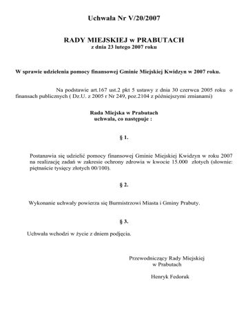 Uchwała Nr V/20/2007 RADY MIEJSKIEJ w PRABUTACH z dnia 23 lutego 2007 roku W sprawie udzielenia pomocy finansowej Gminie Miejskiej Kwidzyn w 2007 roku. Na podstawie art.167 ust.2 pkt 5 ustawy z dnia 30 czerwca 2005 roku o finansach publicznych ( Dz.U. z 2005 r Nr 249, poz.2104 z późniejszymi zmianami) Rada Miejska w Prabutach uchwala, co następuje : § 1. Postanawia się udzielić pomocy finansowej Gminie Miejskiej Kwidzyn w roku 2007 na realizację zadań w zakresie ochrony zdrowia w kwocie 15.000 złotych (słownie: piętnaście tysięcy złotych 00/100). § 2. Wykonanie uchwały powierza się Burmistrzowi Miasta i Gminy Prabuty. § 3. Uchwała wchodzi w życie z dniem podjęcia. Przewodniczący Rady Miejskiej w Prabutach Henryk Fedoruk