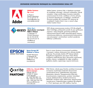 ZESTAWIENIE DoSTAWCóW RoZWIĄZAŃ DLA NoWoCZESNEGo DZIAłu DTP Adobe Systems Sp. z o.o. ul. Prusa 2 00-493 Warszawa tel. 22 657 01 73 [email protected] www.adobe.com/pl 44 Adobe Systems, światowy lider w dziedzinie rozwiązań do marketingu cyfrowego i cyfrowych multimediów, oferuje narzędzia i usługi umożliwiające tworzenie materiałów przeznaczonych do druku i publikacji w formie cyfrowej, na stronach internetowych, na tabletach i smartfonach. Kluczowe produkty dla rozwiązań DTP mieszczą się w pakietach Creative Suite 6 oraz w ramach usługi Adobe Creative Cloud. EIZO oferuje zaawansowane monitory LCD dla poligrafii. Alstor Sp.J. Seria ColorEdge, profesjonalne panele do prac graficznych, (dystrybutor rozwiązań prepressu i edycji fotografii, gwarantują perfekcyjne EIZO w Polsce) odwzorowanie kolorów dzięki najwyższej jakości matrycy, ul. Wenecka 12 rozbudowanej elektronice, zaawansowanej funkcjonalności 03-244 Warszawa oraz precyzyjnym i powtarzalnym wynikom sprzętowej tel. 22 510 24 00 kalibracji i profilowania. faks 22 675 43 10 [email protected] www.eizo.pl M A I N TDoSTAWCóW O P I C S N E W S ZESTAWIENIE RoZWIĄZAŃ DLA NoWoCZESNEGo DZIAłu DTP ś W I A T D R U K U 7-8/ 2 0 1 2 02-690 Warszawa ul. Bokserska 66 tel. 22 357 75 00 [email protected] www.epson.pl Epson to znany dostawca innowacyjnych produktów i rozwiązań z zakresu drukowania oraz cyfrowej obróbki graficznej. Na potrzeby działów DTP oferuje drukarki fotograficzne (nagradzana seria Epson Stylus Photo), urządzenia wielofunkcyjne (druk, skanowanie, kopiowanie), proofery, skanery i przeglądarki do zdjęć, projektory, replikatory dysków, zapewniając wsparcie techniczne. X-Rite Inc., Branch Office Eastern Europe Palánek 374/1a CZ-682 01 Vyskov Czech Republic tel. +420 283 883 113 faks +420 517 332 335 mob. +420 602 554 145 [email protected] www.xrite.com X-Rite Pantone, członek grupy Danaher, produkuje innowacyjne rozwiązania umożliwiające doskonałe odwzorowanie i powtarzalność barwy: spektrofotometry, kolorymetry, densytometry, akcesoria. Oprogramowanie X-Rite służy do porównywania, recepturowania, symulacji i komunikacji o barwie. Międzynarodowy standard porównawczy PANTONE® umożliwia wybór, definiowanie, dopasowywanie i kontrolę barwy. Najpopularniejsze urządzenia dla poligrafii to: i1Pro2, Spectroeye, seria 500, Intellitrax, EasyTrax. Epson Europe BV Oddział w Polsce