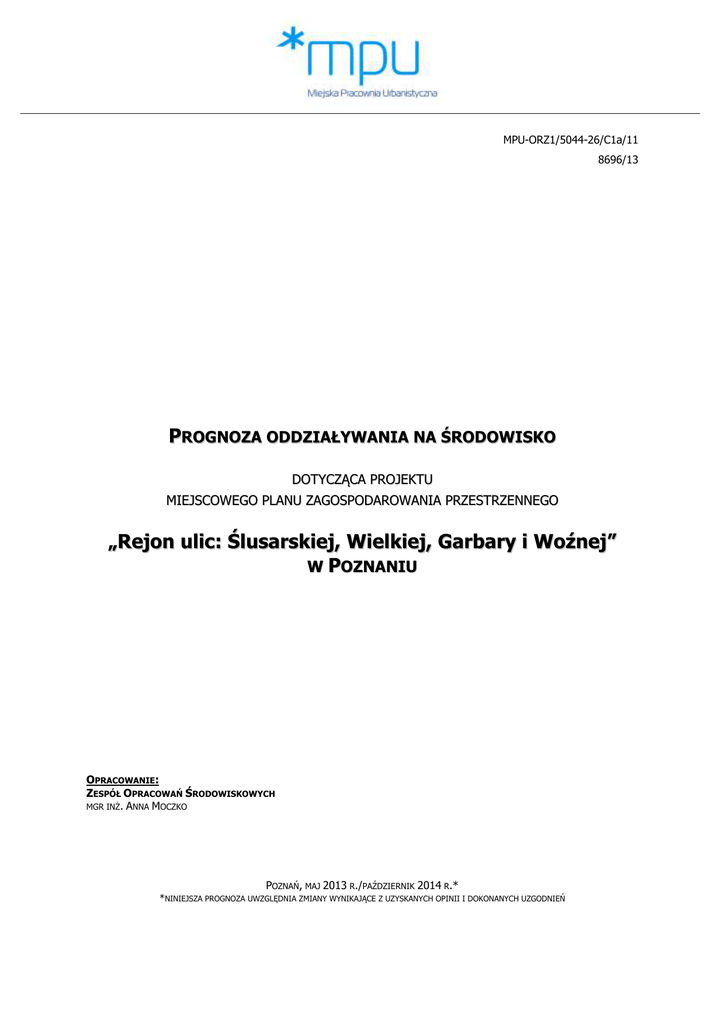 MPU-ORZ1/5044-26/C1a/11 8696/13 PROGNOZA ODDZIAŁYWANIA NA ŚRODOWISKO DOTYCZĄCA PROJEKTU MIEJSCOWEGO PLANU ZAGOSPODAROWANIA PRZESTRZENNEGO „Rejon ulic: Ślusarskiej, Wielkiej, Garbary i Woźnej” W POZNANIU OPRACOWANIE: ZESPÓŁ OPRACOWAŃ ŚRODOWISKOWYCH MGR INŻ. ANNA MOCZKO POZNAŃ, MAJ 2013 R./PAŹDZIERNIK 2014 R.* *NINIEJSZA PROGNOZA UWZGLĘDNIA ZMIANY WYNIKAJĄCE Z UZYSKANYCH OPINII I DOKONANYCH UZGODNIEŃ PROGNOZA ODDZIAŁYWANIA NA ŚRODOWISKO DOTYCZĄCA PROJEKTU MPZP „REJON ULIC: ŚLUSARSKIEJ, WIELKIEJ, GARBARY I WOŹNEJ” W POZNANIU SPIS TREŚCI 1. WPROWADZENIE ............................................................................................................. 3 1.1. Informacje wstępne .........................................................................................................3 1.2. Podstawy formalno-prawne opracowania ..........................................................................3 1.3. Cel i zakres merytoryczny opracowania .............................................................................3 1.4 Wykorzystane materiały i metody pracy ............................................................................4 2. CHARAKTERYSTYKA ORAZ STAN ŚRODOWISKA PRZYRODNICZEGO.............................. 6 2.1. Położenie, użytkowanie i zagospodarowanie terenu ...........................................................6 2.2. Rzeźba terenu .................................................................................................................7 2.3. Budowa geologiczna i warunki gruntowe ...........................................................................7 2.4. Zasoby naturalne.............................................................................................................7 2.5. Warunki wodne ...............................................................................................................7 2.6. Szata roślinna .................................................................................................................8 2.7. Świat zwierzęcy ...............................................................................................................8 2.8. Powierzchnia ziemi ..........................................................................................................8 2.9. Klimat lokalny .................................................................................................................9 2.10. Dziedzictwo kulturowe ................................................................................................... 10 2.11. Jakość powietrza atmosferycznego ................................................................................. 11 2.12. Klimat akustyczny .......................................................................................................... 13 2.13. Jakość wód ................................................................................................................... 14 3. ISTNIEJĄCE PROBLEMY OCHRONY ŚRODOWISKA ISTOTNE Z PUNKTU WIDZENIA REALIZACJI PROJEKTU PLANU, W SZCZEGÓLNOŚCI DOTYCZĄCE OBSZARÓW CHRONIONYCH NA PODSTAWIE USTAWY O OCHRONIE PRZYRODY ............................ 14 4. INFORMACJA O GŁÓWNYCH CELACH I ZAWARTOŚCI PROJEKTU PLANU ..................... 15 4.1. Cel opracowania projektu planu ..................................................................................... 15 4.2. Ustalenia projektu planu ................................................................................................ 16 4.3. Powiązanie ustaleń projektu planu z innymi dokumentami ............................................... 17 4.4. Potencjalne zmiany stanu środowiska w przypadku braku realizacji ustaleń projektu planu 19 5. CELE OCHRONY ŚRODOWISKA USTANOWIONE NA SZCZEBLU MIĘDZYNARODOWYM, KRAJOWYM I LOKALNYM ISTOTNE Z PUNKTU WIDZENIA PROJEKTOWANEGO DOKUMENTU .................................................................................................................. 20 6. PRZEWIDYWANE ODDZIAŁYWANIA USTALEŃ PROJEKTU PLANU NA ŚRODOWISKO .. 22 6.1. Oddziaływanie na powierzchnię ziemi ............................................................................. 22 6.2. Oddziaływanie na wody powierzchniowe i podziemne ...................................................... 23 6.3. Oddziaływanie na zasoby naturalne ................................................................................ 24 6.4. Oddziaływanie na różnorodność biologiczną .................................................................... 24 6.5. Oddziaływanie na szatę roślinną i zwierzęta .................................................................... 24 6.6. Oddziaływanie na ludzi .................................................................................................. 24 6.7. Oddziaływanie na krajobraz ........................................................................................... 26 6.8. Oddziaływanie na klimat akustyczny ............................................................................... 27 6.9. Oddziaływanie na powietrze atmosferyczne .................................................................... 28 6.10. Oddziaływanie na dziedzictwo kulturowe ......................................................................... 29 6.11. Oddziaływanie na klimat lokalny ..................................................................................... 30 6.12. Oddziaływanie na dobra materialne ................................................................................ 30 6.13. Oddziaływanie na obszary chronione, w tym obszary Natura 2000 .................................... 31 6.14. Pola elektromagnetyczne ............................................................................................... 31 6.15. Oddziaływanie transgraniczne ........................................................................................ 31 7. PROPOZYCJE DOTYCZĄCE PRZEWIDYWANYCH METOD ANALI