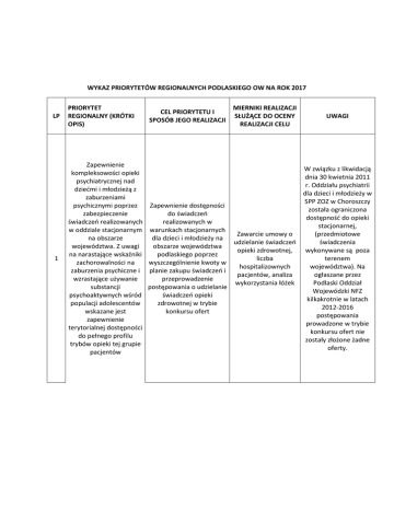 WYKAZ PRIORYTETÓW REGIONALNYCH PODLASKIEGO OW NA ROK 2017 LP PRIORYTET REGIONALNY (KRÓTKI OPIS) CEL PRIORYTETU I SPOSÓB JEGO REALIZACJI MIERNIKI REALIZACJI SŁUŻĄCE DO OCENY REALIZACJI CELU 1 Zapewnienie kompleksowości opieki psychiatrycznej nad dziećmi i młodzieżą z zaburzeniami psychicznymi poprzez zabezpieczenie świadczeń realizowanych w oddziale stacjonarnym na obszarze województwa. Z uwagi na narastające wskaźniki zachorowalności na zaburzenia psychiczne i wzrastające używanie substancji psychoaktywnych wśród populacji adolescentów wskazane jest zapewnienie terytorialnej dostępności do pełnego profilu trybów opieki tej grupie pacjentów W związku z likwidacją dnia 30 kwietnia 2011 r. Oddziału psychiatrii dla dzieci i młodzieży w SPP ZOZ w Choroszczy Zapewnienie dostępności została ograniczona do świadczeń dostępność do opieki realizowanych w stacjonarnej, warunkach stacjonarnych Zawarcie umowy o (przedmiotowe dla dzieci i młodzieży na udzielanie świadczeń świadczenia obszarze województwa opieki zdrowotnej, wykonywane są poza podlaskiego poprzez liczba terenem wyszczególnienie kwoty w hospitalizownych województwa). Na planie zakupu świadczeń i pacjentów, analiza ogłaszane przez przeprowadzenie wykorzystania łóżek Podlaski Oddział postępowania o udzielanie Wojewódzki NFZ świadczeń opieki kilkakrotnie w latach zdrowotnej w trybie 2012-2016 konkursu ofert postępowania prowadzone w trybie konkursu ofert nie zostały złożone żadne oferty. UWAGI 2 3 4 Z uwagi na starzenie się Zapewnienie bliższego społeczeństwa i miejscu zamieszkania oraz narastającą liczbę większego dostępu do hospitalizacji z przyczyn świadczeń udzielanych w społeczno- opiekuńczych zakładach pielęgnacyjno- dążenie do opiekuńczych/opiekuńczoprzenoszenia obciążenia leczniczych poprzez z opieki szpitalnej na zwiększenie nakładów na rzecz opieki stacjonarnej przedmiotowe poza szpitalnej świadczenia. Analiza wzrostu nakładów na świadczenia w ZOL/ZPO od 2015 r. - liczba pacjentów leczonych w ramach przedmiotowego programu - liczba osób oczekujących na leczenie -średni czas oczekiwania na leczenie Leczenie szpitalne programy zdrowotne (lekowe) - "Leczenie przewlekłego wirusowego zapalenia wątroby typu C terapia bezinterferonową" Zwiększenie dostępności do innowacyjnych metod leczenia wskazanych w programie lekowym leczenie WZW C terapią bezinterferonową Lecznictwo uzdrowiskowe uzdrowiskowe leczenie sanatoryjne dorosłych Skrócenie okresu oczekiwania na potwierdzenie skierowań na leczenie uzdrowiskowe w zakresie - liczba osób uzdrowiskowego leczenia oczekujących, - liczba sanatoryjnego dorosłych zakupionych oraz utrzymanie kolejki skierowań oczekujących na poziomie 18 miesięcy poprzez zwiększenie środków w planie finansowym na rok 2017 Dane z list oczekujących potwierdzają, że na leczenie w ramach programu lekowego "Leczenie przewlekłego wirusowego zapalenia wątroby typu C terapią bezinterferonową" oczekuje coraz większa liczba osób, wydłużając jednocześnie średni czas oczekiwania na kwalifikację do programu. Pomimo dużego nakładu finansowego na leczenie oraz sukcesywnego zwiększania wartości umowy na realizację programu okazuje się, że jest niewystarcząjący w stosunku do potrzeb osób oczekujących.