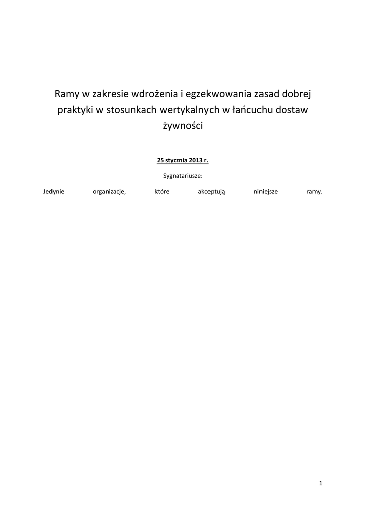 Ramy w zakresie wdrożenia i egzekwowania zasad dobrej praktyki w stosunkach wertykalnych w łańcuchu dostaw żywności 25 stycznia 2013 r. Sygnatariusze: Jedynie organizacje, które akceptują niniejsze ramy. 1 I — Wstęp Na posiedzeniu w dniu 29 listopada 2011 r. Forum Wysokiego Szczebla do spraw Poprawy Funkcjonowania Łańcucha Dostaw Żywności z zadowoleniem przyjęło zbiór zasad dobrej praktyki w stosunkach wertykalnych w łańcuchu dostaw żywności przedstawiony przez grupę zainteresowanych stron obejmujących organizacje z wszystkich etapów łańcucha. Komisja Europejska upoważniła następnie wspomniane organizacje do przedstawienia do końca czerwca 2012 r. ram w zakresie wdrożenia i egzekwowania tych zasad. Grupa obejmująca szereg zainteresowanych stron natychmiast rozpoczęła dyskusje, których wynikiem jest niniejszy dokument. Przedstawiono w nim przegląd ogólnej charakterystyki ram w zakresie wdrożenia i egzekwowania zasad wraz z konkretnymi narzędziami operacyjnymi; w przeglądzie tym wskazano wymagane działania, odpowiedzialne za nie podmioty oraz harmonogram ich realizacji. Zawarto w nim opis zarządzania, w tym kwestii monitorowania i oceny; wskaźniki skuteczności działania; krótką ocenę powiązań z istniejącymi zasadami i przepisami krajowymi oraz dobrowolnymi programami, a także ocenę skutków transgranicznych; krótki przegląd finansowania; oraz ocenę spełnienia kryteriów określonych wcześniej przez komisarza Barniera w kontekście Forum Wysokiego Szczebla. Sygnatariusze uznają, że ramy stanowią kompromis między różnymi interesami, który jest wynikiem długich i żmudnych negocjacji. Niniejsze ramy obejmują podmioty w całym łańcuchu dostaw żywności. Oczekuje się, że ramy proponowane poniżej pomogą w osiągnięciu celu uczciwych stosunków handlowych na rynku i ostatecznie uzyskaniu lepiej funkcjonującego łańcucha wartości, przynoszącego w zrównoważony sposób większą wartość całemu łańcuchowi dostaw, w tym konsumentom. Ramy mają stanowić uzupełnienie zasad i przepisów krajowych i unijnych oraz innych dobrowolnych programów i w związku z tym nie zastępują ich. II — Ogólna charakterystyka 1. Przegląd Ramy składają się z systemu rejestracji, za pomocą którego podmioty gospodarcze, w tym MŚP 1, dobrowolnie zobowiązują się do wdrażania zasad i przyjmowania różnych wariantów rozstrzygania sporów. Są to ramy dobrowolne, których sukces zależy od woli uczestnictwa masy krytycznej przedsiębiorstw w całym łańcuchu dostaw na wszystkich etapach łańcucha dostaw żywności. Przedsiębiorstwa te 1 Definicja MŚP w UE: http://eurlex.europa.eu/LexUriServ/LexUriServ.do?uri=OJ:L:2003:124:0036:0041:EN:PDF. 2 zobowiązują się do przestrzegania zasad dobrej praktyki w stosunkach wertykalnych w łańcuchu dostaw żywności, które to zasady będą stanowić podstawę ich relacji handlowych. Przedmiotowe ramy obejmują obowiązkowe elementy po rejestracji i są połączone ze wspólnym zarządzaniem przez wiele zainteresowanych stron, wskaźnikami skuteczności działania i nadzorem publicznym. Przed rozpoczęciem rejestracji konieczny jest etap przygotowań. Narzędzie internetowe wraz z innymi narzędziami informacyjnymi i komunikacyjnymi przygotowanymi przez grupę obejmującą szereg zainteresowanych stron zapewni informacje niezbędne do rejestracji oraz promocję mającą na celu zwiększenie świadomości na temat przedmiotowych ram wśród przedsiębiorstw, stowarzyszeń przedstawicielskich i ogółu społeczeństwa. Po przygotowaniu narzędzia rozpocznie się proces rejestracji. Przedsiębiorstwa, które chcą się zarejestrować, będą musiały spełnić określone wymogi przed uzyskaniem uprawnienia do rejestracji. Po zarejestrowaniu będą zobowiązane przestrzegać procedur określonych w niniejszym dokumencie dotyczących wdrożenia i egzekwowania. Przedmiotowe procedury zostały opisane w rozdziale poświęconym kwestii ram operacyjnych i zostaną uzupełnione wytycznymi dotyczącymi wdrożenia opracowanymi w stosownym czasie przez sygnatariuszy niniejszego dokumentu. Podczas etapu przygotowań w ramach okresu przejściowego przedsiębiorstwa będą jednak miały możliwość rejestrowania się bez spełnienia wszystkich wymogów w celu zachęcenia „pionierów”. 2. Zakres geograficzny Niniejsze ramy obejmują wszystkie państwa członkowskie UE. Oczekuje się, że zarejestrowane przedsiębiorstwa wdrożą przedmiotowe zasady w całych swoich organizacjach niezależnie od pochodzenia geograficznego ich partnera handlowego, pod warunkiem że zobowiązania umowne będą wykonywane na terenie UE. Małe i średnie przedsiębiorstwa z siedzibą poza UE mogą korzystać z wariantów rozstrzygania sporów ujętych w niniejszych ramach w stosunkach ze swoimi partnerami handlowymi, którzy się zarejestrowali, o ile zobowiązania umowne będą wykonywane na terenie UE. 3. Zakres pod względem produktu Niniejsze ramy odnoszą się jedynie do żywności (świeżej i przetworzonej) i napojów. Przedsiębiorstwa, które są częścią łańcucha żywności i napojów, zachęca się jednak do stosowania zasad w całych swoich organizacjach niezależnie od charakteru produktu, jeżeli istnieją podobne warunki (np. podobna struktura łańcucha; podobne grupy produktów lub podobna polityka w zakresie zamówień). Ramy te nie mają zastosowania do świadczenia usług wnoszących wkład w łańcuch żywności, które mają w nim jednak charakter jedynie instrumentalny (np. logistyka, pakowanie). III — Ramy operacyjne i harmonogram 3 Dla przejrzystości ramy operacyjne zostały podzielone na cztery filary. Ich kolejność niekoniecznie odzwierciedla porządek chronologiczny, a podane daty mają charakter orientacyjny. Filar 1: Przygotowanie systemu rejestracji i budowanie świadomości W celu zapewnienia sprawnego funkcjonowania procesu rejestracji konieczne jest ukończenie szeregu zada