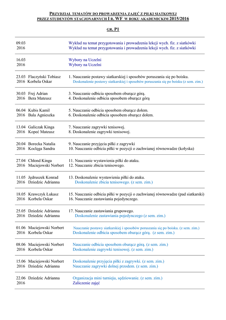 PRZYDZIAŁ TEMATÓW DO PROWADZENIA ZAJĘĆ Z PIŁKI SIATKOWEJ PRZEZ STUDENTÓW STACJONARNYCH I R. WF W ROKU AKADEMICKIM 2015/2016 GR. P1 09.03 2016 Wykład na temat przygotowania i prowadzenia lekcji wych. fiz. z siatkówki Wykład na temat przygotowania i prowadzenia lekcji wych. fiz. z siatkówki 16.03 2016 Wybory na Uczelni Wybory na Uczelni 23.03 Flaczyński Tobiasz 2016 Korbela Oskar 1. Nauczanie postawy siatkarskiej i sposobów poruszania się po boisku. 30.03 Frej Adrian 2016 Bera Mateusz 3. Nauczanie odbicia sposobem oburącz górą. 4. Doskonalenie odbicia sposobem oburącz górą 06.04 Kubis Kamil 2016 Bala Agnieszka 5. Nauczanie odbicia sposobem oburącz dołem. 6. Doskonalenie odbicia sposobem oburącz dołem. 13.04 Galiczak Kinga 2016 Kopeć Mateusz 7. Nauczanie zagrywki tenisowej. 8. Doskonalenie zagrywki tenisowej. 20.04 Borecka Natalia 2016 Koclęga Sandra 9. Nauczanie przyjęcia piłki z zagrywki 10. Nauczanie odbicia piłki w pozycji o zachwianej równowadze (kołyska) 27.04 Chłond Kinga 2016 Maciejowski Norbert 11. Nauczanie wystawienia piłki do ataku. 12. Nauczanie zbicia tenisowego. 11.05 Jędruszek Konrad 2016 Dziedzic Adrianna 13. Doskonalenie wystawienia piłki do ataku. Doskonalenie zbicia tenisowego. (z sem. zim.) 18.05 Krawczyk Łukasz 2016 Korbela Oskar 15. Nauczanie odbicia piłki w pozycji o zachwianej równowadze (pad siatkarski) 16. Nauczanie zastawiania pojedynczego. 25.05 Dziedzic Adrianna 2016 Dziedzic Adrianna 17. Nauczanie zastawiania grupowego. Doskonalenie zastawiania pojedynczego (z sem. zim.) Doskonalenie postawy siatkarskiej i sposobów poruszania się po boisku (z sem. zim.) 01.06 Maciejowski Norbert 2016 Korbela Oskar Doskonalenie odbicia sposobem oburącz górą. (z sem. zim.) 08.06 Maciejowski Norbert 2016 Korbela Oskar Nauczanie odbicia sposobem oburącz górą. (z sem. zim.) Doskonalenie zagrywki tenisowej. (z sem. zim.) 15.06 Maciejowski Norbert 2016 Dziedzic Adrianna Doskonalenie przyjęcia piłki z zagrywki. (z sem. zim.) Nauczanie zagrywki dolnej przodem. (z sem. zim.) 22.06 Dziedzic Adrianna 2016 Organizacja mini turnieju, sędziowanie. (z sem. zim.) Zaliczenie zajęć Nauczanie postawy siatkarskiej i sposobów poruszania się po boisku. (z sem. zim.) PRZYDZIAŁ TEMATÓW DO PROWADZENIA ZAJĘĆ Z PIŁKI SIATKOWEJ PRZEZ STUDENTÓW STACJONARNYCH I R. WF W ROKU AKADEMICKIM 2015/2016 GR. P3 09.03 2016 Wykład na temat przygotowania i prowadzenia lekcji wych. fiz. z siatkówki Wykład na temat przygotowania i prowadzenia lekcji wych. fiz. z siatkówki 14.03 Tkacz Patrycja 2016 Przygoda Aleksandra 3. Nauczanie odbicia sposobem oburącz górą. 4. Doskonalenie odbicia sposobem oburącz górą 16.03 2016 Wybory na Uczelni Wybory na Uczelni 21.03 Świtoń Marta 2016 Rychter Barbara 5. Nauczanie odbicia sposobem oburącz dołem. 6. Doskonalenie odbicia sposobem oburącz dołem. 30.03 Krawczykowski Robert 7. Nauczanie zagrywki tenisowej. 2016 Szczepaniak Karolina 8. Doskonalenie zagrywki tenisowej. 04.04 Lemyshevskyi Denys 2016 Rybak Dawid 9. Nauczanie przyjęcia piłki z zagrywki 10. Nauczanie odbicia piłki w pozycji o zachwianej równowadze (kołyska) 11.04 Smoleń Wojciech 2016 Sokołowski Mateusz 11. Nauczanie wystawienia piłki do ataku. 12. Nauczanie zbicia tenisowego. 13.04 Walaszczyk Michał 2016 Krawczykowski Robert 13. Doskonalenie wystawienia piłki do ataku. Doskonalenie zbicia tenisowego. (z sem. zim.) 18.04 Włodarczyk Weronika 2016 Ślęzak Sylwia 15. Nauczanie odbicia piłki w pozycji o zachwianej równowadze (pad siatkarski) 16. Nauczanie zastawiania pojedynczego. 27.04 Wiśniewska Martyna 2016 Zając Piotr 17. Nauczanie zastawiania grupowego. 18. Doskonalenie zastawiania pojedynczego 11.05 Ratman Żaneta 2016 Psiuk Samuel 1. Nauczanie postawy siatkarskiej i sposobów poruszania się po boisku. 2. Doskonalenie postawy siatkarskiej i sposobów poruszania się po boisku. 25.05 2016 Termin zapasowy realizacji tematu na zaliczenie nieobecności / gra Termin zapasowy realizacji tematu na zaliczenie nieobecności / gra 08.06 2016 Termin zapasowy realizacji tematu na zaliczenie nieobecności / gra Termin zapasowy realizacji tematu na zaliczenie nieobecności / gra 15.06 2016 Termin zapasowy realizacji tematu na zaliczenie nieobecności / gra Termin zapasowy realizacji tematu na zaliczenie nieobecności / gra 22.06 2016 Termin zapasowy realizacji tematu na zaliczenie nieobecności / gra Zaliczenie zajęć