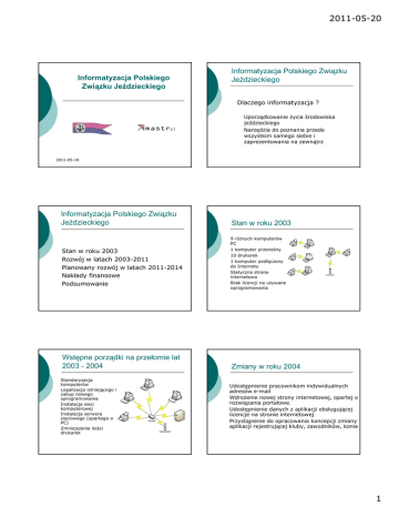 2011-05-20 Informatyzacja Polskiego Związku Jeździeckiego Informatyzacja Polskiego Związku Jeździeckiego Dlaczego informatyzacja ? Uporządkowanie Ŝycia środowiska jeździeckiego Narzędzia do poznania przede wszystkim samego siebie i zaprezentowania na zewnątrz 2011-05-18 Informatyzacja Polskiego Związku Jeździeckiego Stan w roku 2003 Rozwój w latach 2003-2011 Planowany rozwój w latach 2011-2014 Nakłady finansowe Podsumowanie Wstępne porządki na przełomie lat 2003 - 2004 Standaryzacja komputerów Legalizacja istniejącego i zakup nowego oprogramowania Instalacja sieci komputerowej Instalacja serwera sieciowego (opartego o PC) Zmniejszenie ilości drukarek Stan w roku 2003 9 róŜnych komputerów PC 1 komputer przenośny 10 drukarek 1 komputer podłączony do Internetu Statyczna strona internetowa Brak licencji na uŜywane oprogramowania Zmiany w roku 2004 Udostępnienie pracownikom indywidualnych adresów e-mail WdroŜenie nowej strony internetowej, opartej o rozwiązania portalowe. Udostępnienie danych z aplikacji obsługującej licencje na stronie internetowej Przystąpienie do opracowania koncepcji zmiany aplikacji rejestrującej kluby, zawodników, konie 1 2011-05-20 Strona internetowa – dlaczego zmiany w 2004 roku? Strona istniejąca Statyczna Trudne dokonywanie zmian i zamieszczanie komunikatów oraz ogłoszeń Problemy z umieszczaniem plików Brak aktualnych zestawień licencyjnych Aplikacja rejestrująca dlaczego zmiany w 2004 roku? Aplikacja istniejąca Rejestracja tylko zawodników, koni i klubów Brak historii zarejestrowanych danych Brak skalowalności aplikacji Praca pod DOS Tylko 1 stanowisko w biurze Zmiany w roku 2005 WdroŜenie nowego programu rejestracji danych „Aplikacja SD” i centralnej bazy danych Pełna konwersja danych ze starego oprogramowania rejestrującego Modyfikacja oprogramowania pod kątem zmian organizacyjnych w biurze PZJ i zakresu rejestracji danych Uzyskano: Uszczelnienie systemu zarządzania licencjami sportowymi Strona internetowa – dlaczego zmiany w 2004 roku? Strona nowa Strona w formie portalu MoŜliwość łatwej aktualizacji treści przez uŜytkowników W ramach strony udostępniane są dane z aplikacji rejestrującej Prostsze udostępnianie plików Aplikacja rejestrująca dlaczego zmiany w 2004 roku? Aplikacja projektowana o o o o Przygotowana do rejestracji zawodników, koni i klubów Posiadająca pełną historię danych Wykonana w architekturze klientserwer umoŜliwiającej pracę grupową Przygotowana do rozszerzenia istniejącej funkcjonalności Zmiany w latach 2006-2007 Dostosowywanie aplikacji SD do zmieniających się przepisów związkowych Zmiany w sposobie drukowania licencji (wprowadzenie kart plastikowych) WdroŜenie automatycznych aktualizacji wyszukiwarek internetowych, w części danych obsługiwanych przez aplikację WdroŜenie modułu do rejestracji odznak jeździeckich Przygotowanie aplikacji do rozproszonej rejestracji danych (rejestracja zawodników regionalnych) Zakup sprzętu komputerowego Serwer bazodanowy Laptopy na potrzeby WZJ wraz z oprogramowaniem MS Office i antywirusowym 2 2011-05-20 Prace rozwojowe 2008 WdroŜenie rozproszonej rejestracji danych - zawodnicy. WdroŜenie elektronicznego archiwum dokumentów WdroŜenie modułu scalającego dane osobowe Zmiany wynikające ze zmieniających się przepisów związkowych WdroŜenie modułów obsługi: Szkoleniowców Konferencji i szkoleń Korespondencji e-mail Prace rozwojowe 2009 - Kalendarz Wprowadzenie Centralnego Kalendarza Zawodów w wersji dynamicznej Rozszerzenie kalendarza o kalendarz zawodów regionalnych i kalendarz zaproszeń na zawody zagraniczne Przygotowanie dedykowanej aplikacji do obsługi kalendarzy i przekazanie jej do WZJ-tów w zakresie kalendarzy regionalnych System informatyczny PZJ na tle innych polskich związków sportowych Prace rozwojowe 2009 Przygotowanie i wdroŜenie modułu obsługi lekarzy weterynarii i sędziów oraz pozostałych osób oficjalnych Przygotowanie i wdroŜenie modułu obsługi ośrodków certyfikowanych Przygotowanie i wdroŜenie modułu obsługi egzaminów jeździeckich Zmiany w wyszukiwarkach związane z rozwojem Aplikacji SD i bazy danych PZJ Przygotowanie elektronicznego sekretariatu Prace 2009 - problemy techniczne Zmiana wersji oprogramowania serwerowego MySql Likwidacja skutków ataków hackerskich na portal PZJ Niemiecki system informatyczny Konferencja Ministerstwa Sportu i Turystyki „Systemy informatyczne w sporcie” w Warszawie 9 grudnia 2009 roku 3 2011-05-20 Aplikacja SD – Architektura obecna Aplikacja SD – Architektura planowana Prace rozwojowe 2010 Prace rozwojowe 2011 - wdroŜone WdroŜenie modułu obsługującego kursy osób oficjalnych Zbudowanie modułu aplikacji do obsługi Powszechnej Odznaki Jeździeckiej Zmiany w eksporcie danych na stronę – automatyzacja, zmiany zakresu danych Dodanie moŜliwości rejestracji diagramów koni Zmiany w egzaminach na odznaki jeździecki i kartotece odznak – spięcie kartotek, zmiany wydruków Zmiany w obsłudze szkoleniowców dla Instruktora Szkolenia Podstawowego Zmiany w module obsługi osób oficjalnych – zmiany w systemie licencjonowania Prace rozwojowe 2011 - w trakcie realizacji Rozproszona rejestracja koni regionalnych Przygotowanie licencji Młodzika Przygotowanie modułu raportowego Moduł uprawnień dla osób oficjalnych Wydruki legitymacji dla osób oficjalnych Zmiany w licencjonowaniu osób oficjalnych zgodnie z Uchwałami Zarządu z grudnia 2010 Opieka informatyczna i bieŜące zmiany Sprzęt i sieć komputerowa Serwery pocztowe i serwisy internetowe Pomoc techniczna uŜytkownikom aplikacji Drobne modyfikacje „Aplikacji SD” Modyfikacje wyszukiwarek internetowych rozszerzenie prezentowanych danych Zlecenia bieŜące np. KFT dla GUS i inne zestawienia 4 2011-05-20 Plany 2011-2014 – nowe oprogramowanie MoŜliwości aplikacji Toris Scalenie aplikacji Kalendarz z aplikacją SD (w części obsługiwanej przez biuro) Budo