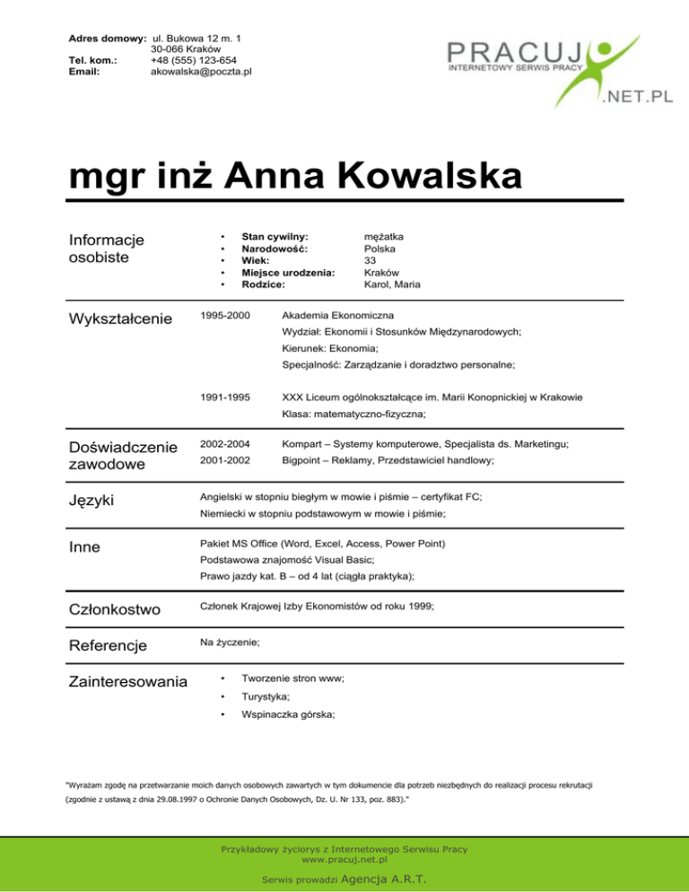 Adres domowy: ul. Bukowa 12 m. 1 30-066 Kraków Tel. kom.: +48 (555) 123-654 Email: [email protected] mgr inż Anna Kowalska Informacje osobiste Wykształcenie • • • • • Stan cywilny: Narodowość: Wiek: Miejsce urodzenia: Rodzice: 1995-2000 mężatka Polska 33 Kraków Karol, Maria Akademia Ekonomiczna Wydział: Ekonomii i Stosunków Międzynarodowych; Kierunek: Ekonomia; Specjalność: Zarządzanie i doradztwo personalne; 1991-1995 XXX Liceum ogólnokształcące im. Marii Konopnickiej w Krakowie Klasa: matematyczno-fizyczna; Doświadczenie zawodowe 2002-2004 Kompart – Systemy komputerowe, Specjalista ds. Marketingu; 2001-2002 Bigpoint – Reklamy, Przedstawiciel handlowy; Języki Angielski w stopniu biegłym w mowie i piśmie – certyfikat FC; Inne Pakiet MS Office (Word, Excel, Access, Power Point) Niemiecki w stopniu podstawowym w mowie i piśmie; Podstawowa znajomość Visual Basic; Prawo jazdy kat. B – od 4 lat (ciągła praktyka); Członkostwo Członek Krajowej Izby Ekonomistów od roku 1999; Referencje Na życzenie; Zainteresowania • Tworzenie stron www; • Turystyka; • Wspinaczka górska; "Wyrażam zgodę na przetwarzanie moich danych osobowych zawartych w tym dokumencie dla potrzeb niezbędnych do realizacji procesu rekrutacji (zgodnie z ustawą z dnia 29.08.1997 o Ochronie Danych Osobowych, Dz. U. Nr 133, poz. 883)." Przykładowy życiorys z Internetowego Serwisu Pracy www.pracuj.net.pl Serwis prowadzi Agencja A.R.T.