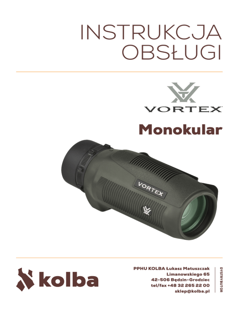 INSTRUKCJA OBSŁUGI Monokular DYSTRYBUTOR PPHU KOLBA Łukasz Matuszczak Limanowskiego 65 42-506 Będzin-Grodziec tel/fax +48 32 265 22 00 [email protected] 2 Gumowe wykończenie obudowy Obiektyw Ustawienie ostrości obrazu Szlufka na pasek Klips Czynności podstawowe Zakładanie paska 1. Przełóż pętlę paska przez szlufkę. 2. Przełóż klips przez pętlę i naciągnij pasek. 3. Przypnij klips do paska. 1. 2. Okular 3. Regulowana muszla oczna 3 Ustawianie ostrości Jak dbać o szkła Pokrętło służy do ustawienia ostrości obrazu. Przekręcenie pokrętła w prawo lub w lewo zmienia ustawienie ostrości. Należy czyścić szklane powierzchnie, tak aby nie było na nich kurzu, brudu lub substancji oleistych. Przed wycieraniem szkieł, należy usunąć z nich kurz i pył. Można to zrobić za pomocą szczoteczki z bardzo miękkim włosiem lub za pomocą sprężonego powietrza. Następnie wystarczy delikatnie chuchnąć na szkła i wytrzeć je miękką szmatką, załączoną do produktu. Nie należy używać chusteczek nawilżanych, grubej bawełny lub flaneli, ponieważ te materiały mogą porysować powierzchnie szklane. Regulowanie muszli ocznej Muszlę oczną można regulować w górę lub w dół poprzez ich pokręcenie. Dla osób noszących okulary zalecane jest wkręcenie muszli w dół. Osoby, które nie noszą okularów powinny odkręcić muszlę. Akcesoria Klips (Solo 10×36 i 8×36) Pozwala na szybkie umocowanie urządzenia na pasku, kieszeni lub innym miejscu. Pokrowiec Pokrowiec, wykonany miękkiego materiału, pozwala na przenoszenie mono-okularu w bezpieczny sposób. 4 KARTA GWARANCYJNA Nazwa towaru Typ Monokular Solo Numer fabryczny Data sprzedaży Pieczątka i podpis punktu sprzedaży Data przyjęcia Data wydania Opis usterki Pieczęć serwisu 5 PRAWO DO REKLAMACJI ORAZ WARUNKI GWARANCJI 1. PPHU Kolba Łukasz Matuszczak z siedzibą w Będzinie ponosi odpowiedzialność w okresie 24 miesięcy od daty sprzedaży w myśl ustawy z dnia 27 lipca 2002 roku o szczególnych warunkach sprzedaży konsumenckiej. 2. Producent, firma Vortex, udziela wieczystej gwarancji na produkt, w ramach poniższych warunków: • firma Vortex zobowiązuje się do naprawy lub wymiany produktu na nowy, jeżeli ulegnie on uszkodzeniu lub będzie miał wadę fabryczną, na własny koszt • prawo do gwarancji przechodzi na kolejnych właścicieli produktu • nie ma potrzeby przedstawienia karty gwarancyjnej • nie ma potrzeby posiadania dowodu zakupu • gwarancja nie obejmuje zgubienia, kradzieży lub celowego uszkodzenia • uszkodzeń kosmetycznych nie mających wpływu na działanie produktu OŚWIADCZAM, ŻE ZAPOZNAŁEM SIĘ I AKCEPTUJĘ WARUNKI NINIEJSZEJ GWARANCJI PODPIS I DATA ___________________________________________ PUNKT SERWISU GWARANCYJNEGO PPHU Kolba Matuszczak Łukasz ul. Limanowskiego 65; 42-506 BędzinGrodziec tel/fax 32 265 22 00 wew. 24 www.kolba.pl [email protected] 6 NOTATKI 7 NOTATKI DYSTRYBUTOR PPHU KOLBA Łukasz Matuszczak Limanowskiego 65 42-506 Będzin-Grodziec tel/fax +48 32 265 22 00 [email protected]