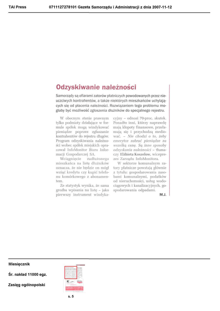 TAI Press 0711127278101 Gazeta Samorządu i Administracji z dnia 2007-11-12 Odzyskiwanie należności Samorządy są ofiarami zatorów płatniczych powodowanych przez nieuczciwych kontrahentów, a także niektórych mieszkańców uchylających się od płacenia należności. Rozwiązaniem tego problemu mogłaby być możliwość zgłoszenia dłużników do specjalnego rejestru. W obecnym stanie prawnym tylko podmioty działające w formule spółek mogą windykować pieniądze poprzez zgłaszanie kontrahentów do rejestru długów. Program odzyskiwania należności wobec spółek miejskich opracował InfoMonitor Biuro Informacji Gospodarczej SA. Wciągnięcie zadłużonego mieszkańca na listę dłużników oznacza, że nie będzie on mógł wziąć kredytu czy kupić telefonu komórkowego z abonamentem. Ze statystyk wynika, że sama groźba wpisania na listę - jako pierwszy instrument windyka- Miesięcznik Śr. nakład HOOOegz. Zasięg ogólnopolski s. 5 cyjny - odnosi 70-proc. skutek. Ponadto inni, którzy naprawdę mają kłopoty finansowe, przełamują się i przychodzą mediować. -- Me chodzi o to, żeby emerytce zabrać pieniądze za wszelką cenę. Są inne sposoby odzyskania należności - tłumaczy Elżbieta Koszelow, wiceprezes Zarządu InfoMonitora. W sektorze komunalnym zatory płatnicze powstają głównie z tytułu: gospodarowania zasobami komunalnymi, podatków od nieruchomości, usług wodociągowych i kanalizacyjnych, gospodarowania odpadami. M.J.