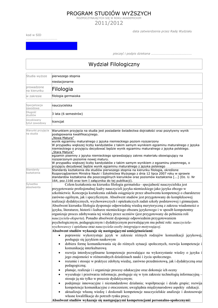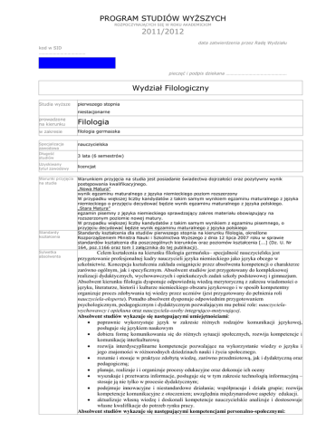 PROGRAM STUDIÓW WYŻSZYCH ROZPOCZYNAJĄCYCH SIĘ W ROKU AKADEMICKIM 2011/2012 kod w SID ………………………………… data zatwierdzenia przez Radę Wydziału pieczęć i podpis dziekana …………………………………………… Wydział Filologiczny Studia wyższe pierwszego stopnia niestacjonarne prowadzone na kierunku Filologia w zakresie filologia germańska Specjalizacja zawodowa nauczycielska Długość studiów 3 lata (6 semestrów) Uzyskiwany tytuł zawodowy licencjat Warunki przyjęcia na studia Standardy kształcenia Sylwetka absolwenta Warunkiem przyjęcia na studia jest posiadanie świadectwa dojrzałości oraz pozytywny wynik postępowania kwalifikacyjnego. „Nowa Matura” wynik egzaminu maturalnego z języka niemieckiego poziom rozszerzony W przypadku większej liczby kandydatów z takim samym wynikiem egzaminu maturalnego z języka niemieckiego o przyjęciu decydować będzie wynik egzaminu maturalnego z języka polskiego. „Stara Matura” egzamin pisemny z języka niemieckiego sprawdzający zakres materiału obowiązujący na rozszerzonym poziomie nowej matury. W przypadku większej liczby kandydatów z takim samym wynikiem z egzaminu pisemnego, o przyjęciu decydować będzie wynik egzaminu maturalnego z języka polskiego Standardy kształcenia dla studiów pierwszego stopnia na kierunku filologia, określone Rozporządzeniem Ministra Nauki i Szkolnictwa Wyższego z dnia 12 lipca 2007 roku w sprawie standardów kształcenia dla poszczególnych kierunków oraz poziomów kształcenia [...] (Dz. U. Nr 164, poz.1166 oraz tom I załącznika do tej publikacji). Celem kształcenia na kierunku filologia germańska– specjalność nauczycielska jest przygotowanie profesjonalnej kadry nauczycieli języka niemieckiego jako języka obcego w szkolnictwie. Koncepcja kształcenia zakłada osiągnięcie przez absolwenta kompetencji o charakterze zarówno ogólnym, jak i specyficznym. Absolwent studiów jest przygotowany do kompleksowej realizacji dydaktycznych, wychowawczych i opiekuńczych zadań szkoły podstawowej i gimnazjum. Absolwent kierunku filologia dysponuje odpowiednią wiedzą merytoryczną z zakresu wiadomości o języku, literaturze, historii i kulturze niemieckiego obszaru językowego i w sposób kompetentny organizuje proces zdobywania tej wiedzy przez uczniów (jest przygotowany do pełnienia roli nauczyciela-eksperta). Ponadto absolwent dysponuje odpowiednim przygotowaniem psychologicznym, pedagogicznym i dydaktycznym pozwalającym mu pełnić role: nauczycielawychowawcy i opiekuna oraz nauczyciela-osoby integrująco-motywującej. Absolwent studiów wykazuje się następującymi umiejętnościami: poprawnie wykorzystuje język w zakresie różnych rodzajów komunikacji językowej, posługuje się językiem naukowym dobiera formę komunikowania się do różnych sytuacji społecznych, rozwija kompetencje i komunikację interkulturową rozwija interdyscyplinarne kompetencje pozwalające na wykorzystanie wiedzy o języku i jego znajomości w różnorodnych dziedzinach nauki i życia społecznego. rozumie i stosuje w praktyce zdobytą wiedzę, zarówno przedmiotową, jak i dydaktyczną oraz pedagogiczną; planuje, realizuje i i organizuje procesy edukacyjne oraz dokonuje ich oceny wyszukuje i przetwarza informacje, posługuje się w tym zakresie technologią informacyjną – stosuje ją nie tylko w procesie dydaktycznym; podejmuje innowacyjne i niestandardowe działania; współpracuje i działa grupie; rozwija kompetencje komunikacyjne z otoczeniem; uwzględnia międzynarodowe aspekty edukacji. aktualizuje własną wiedzę i doskonali kompetencje nauczycielskie analizuje i dostosowuje własne kwalifikacje do potrzeb rynku pracy. Absolwent studiów wykazuje się następującymi kompetencjami personalno-społecznymi: Uzyskiwane kwalifikacje oraz uprawnienia zawodowe jest otwarty na współpracę z innymi profesjonalistami, w środowisku wielokulturowym i wielonarodowościowym postępuje zgodnie ze standardami etycznymi dla zawodu nauczyciela demonstruje odpowiedzialność odnosi się do uczniów z szacunkiem Absolwent studiów filologicznych I stopnia posiada podstawową wiedzę z zakresu wiadomości o języku, literaturze i kulturze danego obszaru językowego oraz umiejętności wykorzystania jej w pracy zawodowej. Absolwent posiada przygotowanie pedagogiczne (teoretyczne i praktyczne) uprawniające do nauczania przedmiotu: język niemiecki, jak również do pracy w placówkach oświatowych. Dostęp do dalszych Uzyskany tytuł zawodowy daje możliwość ubiegania się o przyjęcie na studia drugiego stopnia oraz studiów podnoszenia kwalifikacji na studiach podyplomowych. Jednostka naukowo-dydaktyczna Wydziału właściwa merytorycznie dla tych studiów Instytut Neofilologii PLAN STUDIÓW STUDIA NIESTACJONARNE PIERWSZEGO STOPNIA Kierunek: Filologia Specjalność: filologia germańska Specjalizacja zawodowa: nauczycielska Rok I semestr: 1 i 2. zajęcia dydaktyczne godziny kod kursu nazwa kursu W 09.1-xxxx-111 Praktyczna nauka języka niemieckiego I (Sprawności) 09.1-xxxx-111 Praktyczna nauka języka niemieckiego II (Fonetyka) 09.3-xxxx-111 Gramatyka opisowa języka niemieckiego I 11.3-xxxx-111 Technologia informacyjna 09.5-xxxx-112 Łacina 14.4-xxxx-060 Wprowadzenie do psychologii 09.2-xxxx-111 Wstęp do literaturoznawstwa 08.1-xxxx-012 Historia filozofii 08.1xxxx-012 Etyka 081-xxx-012 Religioznawstwo 14.4-xxxx-060 Psychologiczne podstawy wychowania i nauczania 05.1-xxxx-060 Koncepcje i praktyki nauczania Zajęć w grupach A K L S P 300 30 razem 20 kod grupy zajęć 1 25 P1 50 1 7 P1 50 1 8 K1 30 30 30 30 20 18 1 1 1 1 2 3 2 3 2 TI OJ OH/PP K2/S2 OH 5 35 1 4 OH/PP 40 603 1 9 4 60 OH/PP 55 20 30 15 10 30 10 103 115 330 Punkty ECTS 300 50 15 20 18 E/- pozostałe zajęcia kod zajęć 12.9-XXXX-000 08.9-XXXX-000 rodzaj zajęć Godz. Szkolenie w zakresie BHP Szkolenie w zakresie techniki korzystania z biblioteki punkty ECTS tyg. kod grupy zajęć 0K0 