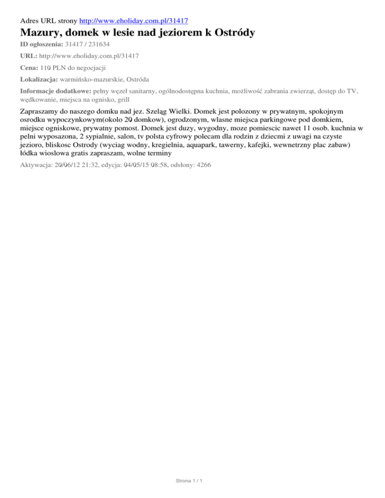 Adres URL strony http://www.eholiday.com.pl/31417 Mazury, domek w lesie nad jeziorem k Ostródy ID ogłoszenia: 31417 / 231634 URL: http://www.eholiday.com.pl/31417 Cena: 110 PLN do negocjacji Lokalizacja: warmińsko-mazurskie, Ostróda Informacje dodatkowe: pełny węzeł sanitarny, ogólnodostępna kuchnia, możliwość zabrania zwierząt, dostęp do TV, wędkowanie, miejsca na ognisko, grill Zapraszamy do naszego domku nad jez. Szeląg Wielki. Domek jest polozony w prywatnym, spokojnym osrodku wypoczynkowym(okolo 20 domkow), ogrodzonym, wlasne miejsca parkingowe pod domkiem, miejsce ogniskowe, prywatny pomost. Domek jest duzy, wygodny, moze pomiescic nawet 11 osob. kuchnia w pelni wyposazona, 2 sypialnie, salon, tv polsta cyfrowy polecam dla rodzin z dziecmi z uwagi na czyste jezioro, bliskosc Ostrody (wyciag wodny, kregielnia, aquapark, tawerny, kafejki, wewnetrzny plac zabaw) łódka wioslowa gratis zapraszam, wolne terminy Aktywacja: 20/06/12 21:32, edycja: 04/05/15 08:58, odsłony: 4266 Strona 1 / 1