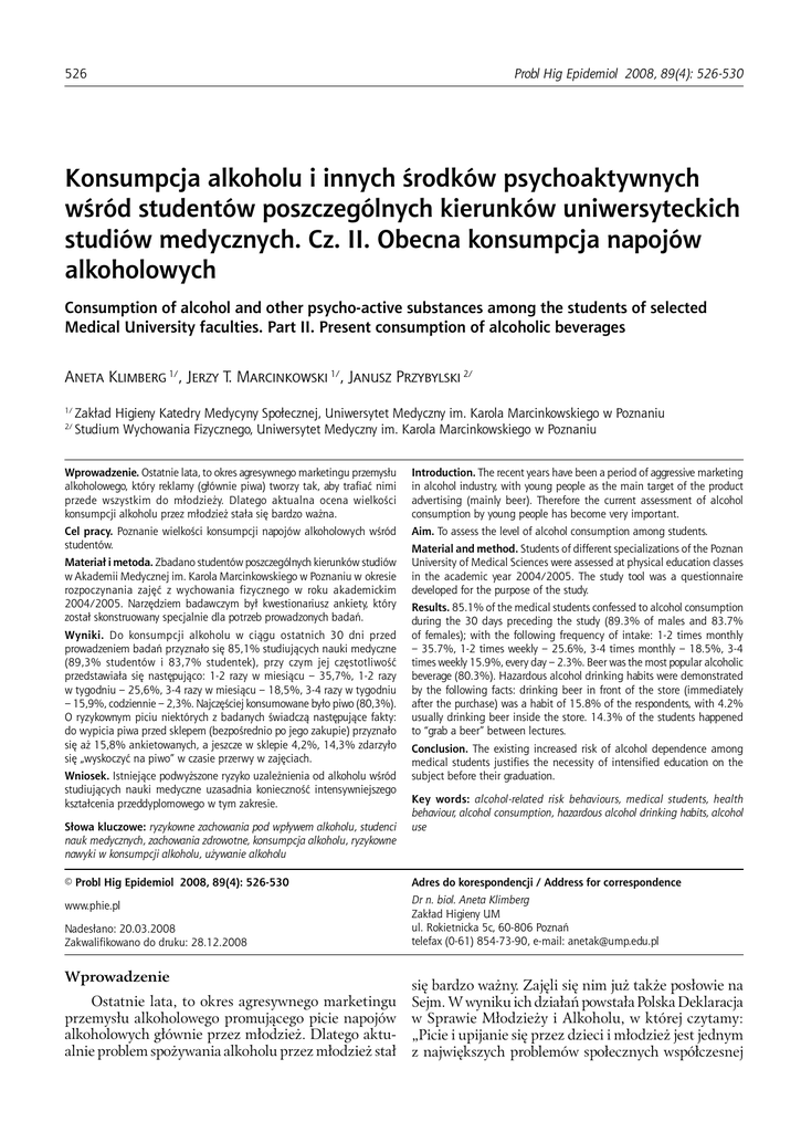 526 Probl Hig Epidemiol 2008, 89(4): 526-530 Konsumpcja alkoholu i innych środków psychoaktywnych wśród studentów poszczególnych kierunków uniwersyteckich studiów medycznych. Cz. II. Obecna konsumpcja napojów alkoholowych Consumption of alcohol and other psycho-active substances among the students of selected Medical University faculties. Part II. Present consumption of alcoholic beverages ANETA KLIMBERG 1/, JERZY T. MARCINKOWSKI 1/, JANUSZ PRZYBYLSKI 2/ 1/ 2/ Zakład Higieny Katedry Medycyny Społecznej, Uniwersytet Medyczny im. Karola Marcinkowskiego w Poznaniu Studium Wychowania Fizycznego, Uniwersytet Medyczny im. Karola Marcinkowskiego w Poznaniu Wprowadzenie. Ostatnie lata, to okres agresywnego marketingu przemysłu alkoholowego, który reklamy (głównie piwa) tworzy tak, aby trafiać nimi przede wszystkim do młodzieży. Dlatego aktualna ocena wielkości konsumpcji alkoholu przez młodzież stała się bardzo ważna. Introduction. The recent years have been a period of aggressive marketing in alcohol industry, with young people as the main target of the product advertising (mainly beer). Therefore the current assessment of alcohol consumption by young people has become very important. Cel pracy. Poznanie wielkości konsumpcji napojów alkoholowych wśród studentów. Aim. To assess the level of alcohol consumption among students. Materiał i metoda. Zbadano studentów poszczególnych kierunków studiów w Akademii Medycznej im. Karola Marcinkowskiego w Poznaniu w okresie rozpoczynania zajęć z wychowania fizycznego w roku akademickim 2004/2005. Narzędziem badawczym był kwestionariusz ankiety, który został skonstruowany specjalnie dla potrzeb prowadzonych badań. Wyniki. Do konsumpcji alkoholu w ciągu ostatnich 30 dni przed prowadzeniem badań przyznało się 85,1% studiujących nauki medyczne (89,3% studentów i 83,7% studentek), przy czym jej częstotliwość przedstawiała się następująco: 1-2 razy w miesiącu – 35,7%, 1-2 razy w tygodniu – 25,6%, 3-4 razy w miesiącu – 18,5%, 3-4 razy w tygodniu – 15,9%, codziennie – 2,3%. Najczęściej konsumowane było piwo (80,3%). O ryzykownym piciu niektórych z badanych świadczą następujące fakty: do wypicia piwa przed sklepem (bezpośrednio po jego zakupie) przyznało się aż 15,8% ankietowanych, a jeszcze w sklepie 4,2%, 14,3% zdarzyło się „wyskoczyć na piwo” w czasie przerwy w zajęciach. Wniosek. Istniejące podwyższone ryzyko uzależnienia od alkoholu wśród studiujących nauki medyczne uzasadnia konieczność intensywniejszego kształcenia przeddyplomowego w tym zakresie. Słowa kluczowe: ryzykowne zachowania pod wpływem alkoholu, studenci nauk medycznych, zachowania zdrowotne, konsumpcja alkoholu, ryzykowne nawyki w konsumpcji alkoholu, używanie alkoholu Material and method. Students of different specializations of the Poznan University of Medical Sciences were assessed at physical education classes in the academic year 2004/2005. The study tool was a questionnaire developed for the purpose of the study. Results. 85.1% of the medical students confessed to alcohol consumption during the 30 days preceding the study (89.3% of males and 83.7% of females); with the following frequency of intake: 1-2 times monthly – 35.7%, 1-2 times weekly – 25.6%, 3-4 times monthly – 18.5%, 3-4 times weekly 15.9%, every day – 2.3%. Beer was the most popular alcoholic beverage (80.3%). Hazardous alcohol drinking habits were demonstrated by the following facts: drinking beer in front of the store (immediately after the purchase) was a habit of 15.8% of the respondents, with 4.2% usually drinking beer inside the store. 14.3% of the students happened to “grab a beer” between lectures. Conclusion. The existing increased risk of alcohol dependence among medical students justifies the necessity of intensified education on the subject before their graduation. Key words: alcohol-related risk behaviours, medical students, health behaviour, alcohol consumption, hazardous alcohol drinking habits, alcohol use © Probl Hig Epidemiol 2008, 89(4): 526-530 Adres do korespondencji / Address for correspondence www.phie.pl Dr n. biol. Aneta Klimberg Zakład Higieny UM ul. Rokietnicka 5c, 60-806 Poznań telefax (0-61) 854-73-90, e-mail: [email protected] Nadesłano: 20.03.2008 Zakwalifikowano do druku: 28.12.2008 Wprowadzenie Ostatnie lata, to okres agresywnego marketingu przemysłu alkoholowego promującego picie napojów alkoholowych głównie przez młodzież. Dlatego aktualnie problem spożywania alkoholu przez młodzież stał się bardzo ważny. Zajęli się nim już także posłowie na Sejm. W wyniku ich działań powstała Polska Deklaracja w Sprawie Młodzieży i Alkoholu, w której czytamy: „Picie i upijanie się przez dzieci i młodzież jest jednym z największych problemów społecznych współczesnej Klimberg A i wsp. Konsumpcja alkoholu i innych środków psychoaktywnych wśród studentów poszczególnych ... Polski. Można i trzeba przeciwstawić się mu z całym zdecydowaniem. W drugiej połowie lat 90. nastąpił znaczny wzrost spożycia alkoholu przez polską młodzież. Jest ona poddawana przez biznes alkoholowy agresywnym, zaplanowanym i skutecznym oddziaływaniom promującym picie alkoholu. Pijaństwo i alkoholizm burzą życie rodzinne i prowadzą do licznych tragedii... Wzywamy administrację rządową i samorządową, instytucje publiczne i organizacje pozarządowe oraz wszystkich obywateli do powszechnego i skutecznego współdziałania w realizowaniu zadań określonych w Narodowym Programie Rozwiązywania Problemów Alkoholowych oraz Ustawie o wychowywaniu w trzeźwości i przeciwdziałaniu alkoholizmowi…” [1]. Cel pracy Poznanie wielkości konsumpcji napojów alkoholowych wśród studentów poszczególnych kierunków uniwersyteckich studiów medycznych. Materiał i metody Materiał do badań stanowiły anonimowe ankiety wypełnione przez wszystkich studentów poszczególnych kierunk