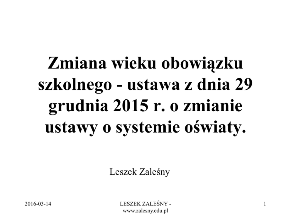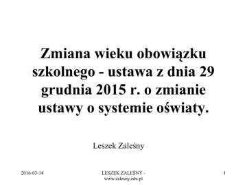 Zmiana wieku obowiązku szkolnego - ustawa z dnia 29 grudnia 2015 r. o zmianie ustawy o systemie oświaty. Leszek Zaleśny 2016-03-14 LESZEK ZALEŚNY www.zalesny.edu.pl 1 Przepisy 8 stycznia 2016 r. opublikowano w Dz. U. - poz. 35 ustawę z dnia 29 grudnia 2015 r. o zmianie ustawy o systemie oświaty oraz niektórych innych ustaw - weszła w życie 23 stycznia 2016 r. 2016-03-14 LESZEK ZALEŚNY www.zalesny.edu.pl 2 Zmiany Najważniejsze zmiany dotyczą: • obowiązku szkolnego od siódmego roku życia, • prawa do rozpoczęcia edukacji szkolnej od szóstego roku życia, • obowiązku przedszkolnego dla dziecka 6–letniego, • prawa dziecka w wieku od 3 do 5 roku życia do korzystania z wychowania przedszkolnego, • wzmocnienia roli kuratora oświaty. 2016-03-14 LESZEK ZALEŚNY www.zalesny.edu.pl 3 Zmiany art. 14.1. Wychowanie przedszkolne obejmuje dzieci od początku roku szkolnego w roku kalendarzowym, w którym dziecko kończy 3 lata, do końca roku szkolnego w roku kalendarzowym, w którym dziecko kończy 7 lat. Wychowanie przedszkolne jest realizowane w przedszkolach oraz w innych formach wychowania przedszkolnego. 1a. W przypadku dzieci posiadających orzeczenie o potrzebie kształcenia specjalnego wychowaniem przedszkolnym może być objęte dziecko w wieku powyżej 7 lat, nie dłużej jednak niż do końca roku szkolnego w roku kalendarzowym, w którym dziecko kończy 9 lat. Obowiązek szkolny tych dzieci odracza się zgodnie art. 16a. 2016-03-14 LESZEK ZALEŚNY www.zalesny.edu.pl 4 Zmiany art. 14. 3. Dziecko w wieku 6 lat jest obowiązane odbyć roczne przygotowanie przedszkolne w przedszkolu lub w innej formie wychowania przedszkolnego. 3a. Obowiązek, o którym mowa w ust. 3, rozpoczyna się z początkiem roku szkolnego w roku kalendarzowym, w którym dziecko kończy 6 lat. W przypadku dziecka, o którym mowa w ust. 1a, obowiązek ten rozpoczyna się z początkiem roku szkolnego poprzedzającego rok szkolny, w którym dziecko rozpocznie spełnianie obowiązku szkolnego. 3b. Dzieci w wieku 3–5 lat mają prawo do korzystania z wychowania przedszkolnego w przedszkolu lub innej formie wychowania przedszkolnego. 2016-03-14 LESZEK ZALEŚNY www.zalesny.edu.pl 5 Zmiany art. 16. 1. Na wniosek rodziców naukę w szkole podstawowej może także rozpocząć dziecko, które w danym roku kalendarzowym kończy 6 lat. 1a. Dyrektor szkoły podstawowej przyjmuje dziecko, o którym mowa w ust. 1, jeżeli dziecko: • 1) korzystało z wychowania przedszkolnego w roku szkolnym poprzedzającym rok szkolny, w którym ma rozpocząć naukę w szkole podstawowej, albo • 2) posiada opinię o możliwości rozpoczęcia nauki w szkole podstawowej, wydaną przez poradnię psychologicznopedagogiczną. 2016-03-14 LESZEK ZALEŚNY www.zalesny.edu.pl 6 Zmiany art. 16. 2. Dziecko, które zostało wcześniej przyjęte do szkoły podstawowej, jest zwolnione z rocznego obowiązku przedszkolnego. 3. Dyrektor publicznej szkoły podstawowej, w obwodzie której dziecko mieszka, na wniosek rodziców, odracza rozpoczęcie spełniania przez dziecko obowiązku szkolnego o jeden rok szkolny. 4. Wniosek, o którym mowa w ust. 3, składa się w roku kalendarzowym, w którym dziecko kończy 7 lat, nie później niż do dnia 31 sierpnia. Odroczenie dotyczy roku szkolnego, w którym dziecko ma rozpocząć spełnianie obowiązku szkolnego. 4c. Dziecko, któremu odroczono rozpoczęcie spełniania obowiązku szkolnego, kontynuuje przygotowanie przedszkolne w przedszkolu. 2016-03-14 LESZEK ZALEŚNY www.zalesny.edu.pl 7 Zmiany art. 16a. 1. W przypadku dzieci posiadających orzeczenie o potrzebie kształcenia specjalnego rozpoczęcie spełniania obowiązku szkolnego może być odroczone nie dłużej niż do końca roku szkolnego w roku kalendarzowym, w którym dziecko kończy 9 lat. 2. Dyrektor publicznej szkoły podstawowej, w obwodzie której dziecko mieszka, na wniosek rodziców, odracza rozpoczęcie spełniania przez dziecko obowiązku szkolnego w danym roku szkolnym. 3. Wniosek, o którym mowa w ust. 2, składa się w roku kalendarzowym, w którym dziecko kończy 7 lat. Wniosek można złożyć ponownie w roku kalendarzowym, w którym dziecko kończy 8 lat. Wniosek składa się nie później niż do dnia 31 sierpnia. Odroczenie dotyczy roku szkolnego, w którym dziecko ma rozpocząć spełnianie obowiązku szkolnego. 2016-03-14 LESZEK ZALEŚNY www.zalesny.edu.pl 8 Zmiany art. 16a. 4. Do wniosku, o którym mowa w ust. 2, dołącza się orzeczenie o potrzebie kształcenia specjalnego oraz opinię, z której wynika potrzeba odroczenia spełniania przez dziecko obowiązku szkolnego w danym roku szkolnym, wydaną przez poradnię psychologiczno-pedagogiczną. 5. Dziecko, któremu odroczono rozpoczęcie spełniania obowiązku szkolnego zgodnie z ust. 2, kontynuuje przygotowanie przedszkolne w przedszkolu (…), a dziecko posiadające orzeczenie o potrzebie kształcenia specjalnego wydane ze względu na niepełnosprawności sprzężone, z których jedną z niepełnosprawności jest upośledzenie umysłowe w stopniu umiarkowanym lub znacznym, także w ośrodku umożliwiającym dzieciom i młodzieży, o których mowa w art. 16 ust. 7, a także dzieciom i młodzieży z upośledzeniem umysłowym z niepełnosprawnościami sprzężonymi realizację odpowiednio obowiązku, o którym mowa w art. 14 ust. 3, obowiązku szkolnego i obowiązku nauki. 2016-03-14 LESZEK ZALEŚNY www.zalesny.edu.pl 9 Zmiany Wybór kuratora oświaty Kurator oświaty będzie powoływany i odwoływany przez ministra edukacji w drodze konkursu ogłoszonego przez wojewodę. Na wniosek kuratora oświaty i po zasięgnięciu opinii wojewody, minister edukacji będzie powoływał i odwoływał wicekuratorów oświaty. Wzmocnienie roli kuratora oświaty Przywrócona została kontrola kuratorów oświaty nad działaniami samorządów w kształtowaniu sieci szkół i przedszkoli. 1. Ustalenie przez radę gminy sieci publicznych przedszkoli, oddziałów przedszkolnych w szk