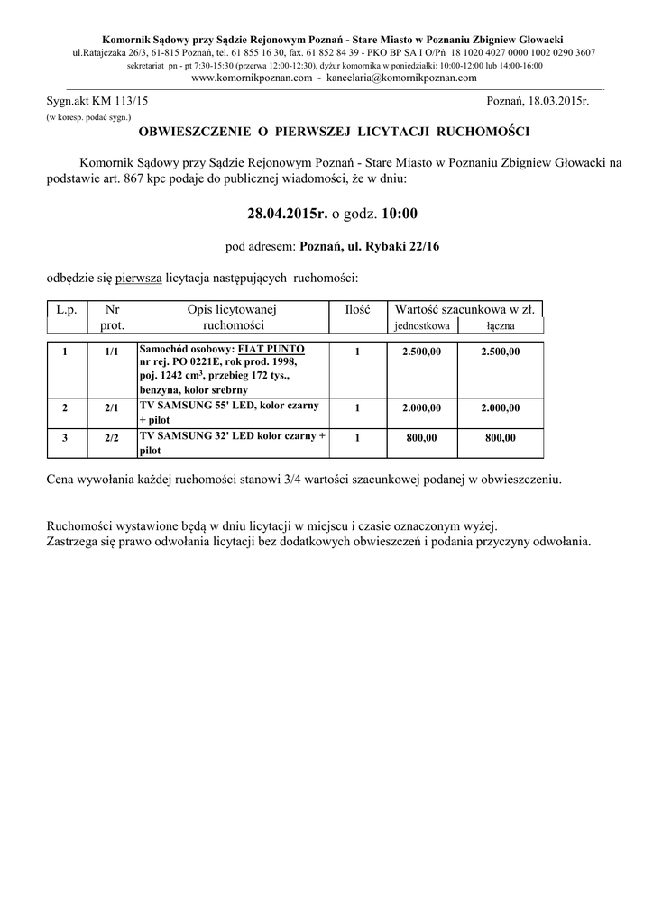 Komornik Sądowy przy Sądzie Rejonowym Poznań - Stare Miasto w Poznaniu Zbigniew Głowacki ul.Ratajczaka 26/3, 61-815 Poznań, tel. 61 855 16 30, fax. 61 852 84 39 - PKO BP SA I O/Pń 18 1020 4027 0000 1002 0290 3607 sekretariat pn - pt 7:30-15:30 (przerwa 12:00-12:30), dyżur komornika w poniedziałki: 10:00-12:00 lub 14:00-16:00 www.komornikpoznan.com - [email protected] Sygn.akt KM 113/15 Poznań, 18.03.2015r. (w koresp. podać sygn.) OBWIESZCZENIE O PIERWSZEJ LICYTACJI RUCHOMOŚCI Komornik Sądowy przy Sądzie Rejonowym Poznań - Stare Miasto w Poznaniu Zbigniew Głowacki na podstawie art. 867 kpc podaje do publicznej wiadomości, że w dniu: 28.04.2015r. o godz. 10:00 pod adresem: Poznań, ul. Rybaki 22/16 odbędzie się pierwsza licytacja następujących ruchomości: L.p. Nr prot. Opis licytowanej ruchomości Ilość 1 1/1 2 2/1 3 2/2 Samochód osobowy: FIAT PUNTO nr rej. PO 0221E, rok prod. 1998, poj. 1242 cm3, przebieg 172 tys., benzyna, kolor srebrny TV SAMSUNG 55' LED, kolor czarny + pilot TV SAMSUNG 32' LED kolor czarny + pilot Wartość szacunkowa w zł. jednostkowa łączna 1 2.500,00 2.500,00 1 2.000,00 2.000,00 1 800,00 800,00 Cena wywołania każdej ruchomości stanowi 3/4 wartości szacunkowej podanej w obwieszczeniu. Ruchomości wystawione będą w dniu licytacji w miejscu i czasie oznaczonym wyżej. Zastrzega się prawo odwołania licytacji bez dodatkowych obwieszczeń i podania przyczyny odwołania.