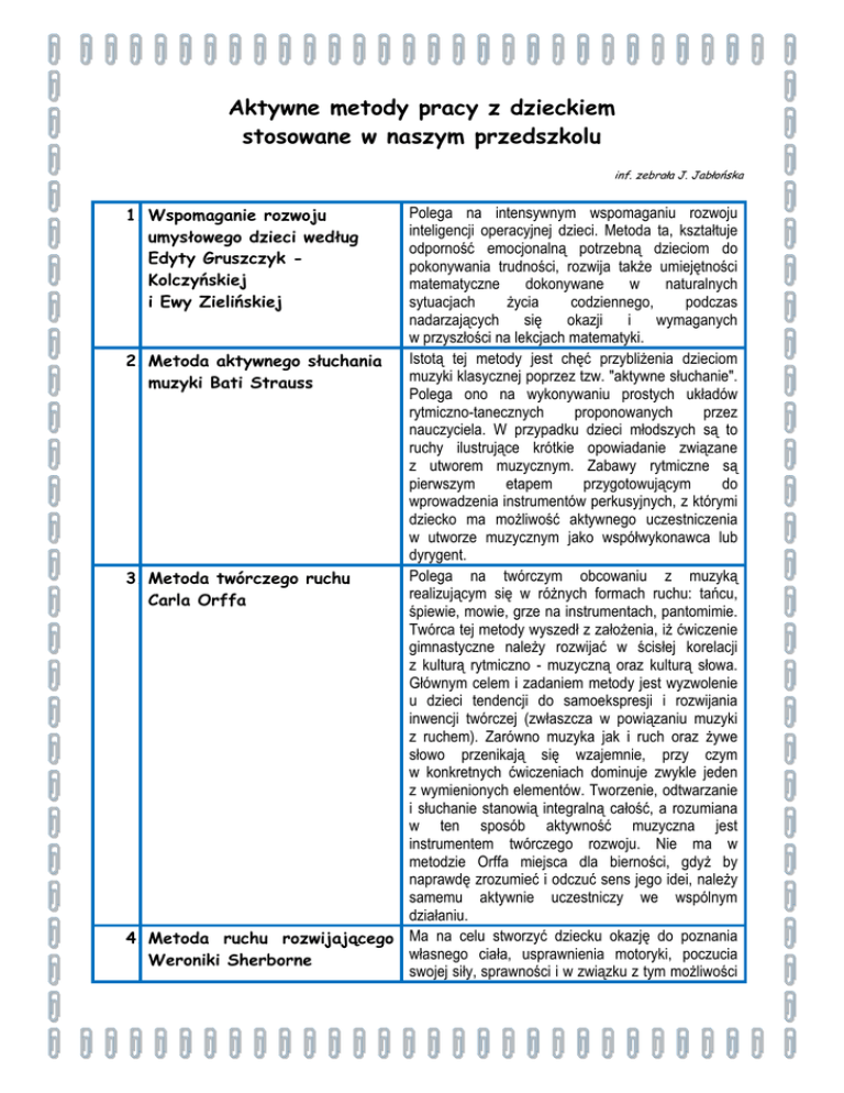 Aktywne metody pracy z dzieckiem stosowane w naszym przedszkolu inf. zebrała J. Jabłońska 1. Wspomaganie rozwoju umysłowego dzieci według Edyty Gruszczyk Kolczyńskiej i Ewy Zielińskiej Polega na intensywnym wspomaganiu rozwoju inteligencji operacyjnej dzieci. Metoda ta, kształtuje odporność emocjonalną potrzebną dzieciom do pokonywania trudności, rozwija także umiejętności matematyczne dokonywane w naturalnych sytuacjach życia codziennego, podczas nadarzających się okazji i wymaganych w przyszłości na lekcjach matematyki. Istotą tej metody jest chęć przybliżenia dzieciom 2. Metoda aktywnego słuchania muzyki klasycznej poprzez tzw. "aktywne słuchanie". muzyki Bati Strauss Polega ono na wykonywaniu prostych układów rytmiczno-tanecznych proponowanych przez nauczyciela. W przypadku dzieci młodszych są to ruchy ilustrujące krótkie opowiadanie związane z utworem muzycznym. Zabawy rytmiczne są pierwszym etapem przygotowującym do wprowadzenia instrumentów perkusyjnych, z którymi dziecko ma możliwość aktywnego uczestniczenia w utworze muzycznym jako współwykonawca lub dyrygent. Polega na twórczym obcowaniu z muzyką 3. Metoda twórczego ruchu realizującym się w różnych formach ruchu: tańcu, Carla Orffa śpiewie, mowie, grze na instrumentach, pantomimie. Twórca tej metody wyszedł z założenia, iż ćwiczenie gimnastyczne należy rozwijać w ścisłej korelacji z kulturą rytmiczno - muzyczną oraz kulturą słowa. Głównym celem i zadaniem metody jest wyzwolenie u dzieci tendencji do samoekspresji i rozwijania inwencji twórczej (zwłaszcza w powiązaniu muzyki z ruchem). Zarówno muzyka jak i ruch oraz żywe słowo przenikają się wzajemnie, przy czym w konkretnych ćwiczeniach dominuje zwykle jeden z wymienionych elementów. Tworzenie, odtwarzanie i słuchanie stanowią integralną całość, a rozumiana w ten sposób aktywność muzyczna jest instrumentem twórczego rozwoju. Nie ma w metodzie Orffa miejsca dla bierności, gdyż by naprawdę zrozumieć i odczuć sens jego idei, należy samemu aktywnie uczestniczy we wspólnym działaniu. 4. Metoda ruchu rozwijającego Ma na celu stworzyć dziecku okazję do poznania własnego ciała, usprawnienia motoryki, poczucia Weroniki Sherborne swojej siły, sprawności i w związku z tym możliwości 5. Metoda gimnastyki twórczej (ekspresyjnej) Rudolfa Labana 6. Metoda dobrego startu Marty Bogdanowicz ruchowych. Dziecko zaczyna mieć zaufanie do siebie, zyskuje też poczucie bezpieczeństwa. Podczas ćwiczeń ruchowych dziecko może poznać przestrzeń, w której się znajduje, przestaje ona być dla niego groźna. Czuje się ono w niej bezpiecznie, staje się aktywne, przejawia większą inicjatywę, może być twórcze. Dzielenie przestrzeni z drugą osobą nie musi być zagrażające, może stać się źródłem nawiązania bliskiego kontaktu, opartego na zaufaniu i współpracy, daje możliwość poczucia wspólnoty i przeżycia szczęścia. Warunkiem prowadzenia zajęć jest zabawowa, radosna atmosfera, możliwość osiągania sukcesu w każdym ćwiczeniu i wspólna satysfakcja z pokonywania trudności. To improwizacja ruchowa bez pokazania wzorca ruchu przez nauczyciela. Ważną rolę odgrywa tu inwencja twórcza ćwiczących, ich pomysłowość, fantazja doświadczenie ruchowe. W metodzie tej posługuje się różnymi formami ruchu, takimi jak: odkrywanie, naśladowanie, inscenizacja, gimnastyka wykorzystująca ruch naturalny, pantomima, ćwiczenia muzyczno-ruchowe, taniec, opowieść ruchowa, itp. Nauczyciel staje się współuczestnikiem i współpartnerem zabaw. Metoda ruchowa ekspresji twórczej daje możliwość rozwijania się w zakresie między innymi: wyczucia własnego ciała, wyczucia przestrzeni, wyczucia ciężaru ciała (siły), doskonaleniu płynności ruchu, w zakresie kształtowania umiejętności współdziałania z partnerem lub grupą. Jej założeniem jest jednoczesne rozwijanie funkcji językowych i funkcji spostrzeżeniowych: wzrokowych, słuchowych, dotykowych, kinestetycznych i motorycznych oraz współdziałania między tymi funkcjami, czyli integracji percepcyjnomotorycznej. Metoda dobrego startu wszechstronnie oddziaływuje na rozwój psychomotoryczny dziecka i ułatwia naukę czytania i pisania. Może być wykorzystywana w pracy z dziećmi prawidłowo rozwijającymi się w celu stymulowania rozwoju, jak i z dziećmi o zaburzonym rozwoju w celu rehabilitacji zaburzeń. Metoda spełnia również rolę profilaktyczną. Zapobiega występowaniu dysleksji rozwojowych, czyli specyficznych trudności w czytaniu i pisaniu, a tym samym niepowodzeniom szkolnym. Elementem uatrakcyjniającym zajęcia są odpowiednio dobrane do ćwiczeń piosenki o tematyce dziecięcej. 7. Metoda pedagogiki zabawy W pedagogice zabawy bardzo istotne jest to, iż z repertuaru tradycyjnych zabaw wybiera się tylko te, które nie stwarzają napięcia powodowanego nadmierną rywalizacją i nie ośmieszają jej uczestników. Proponowane zabawy sprzyjają aktywności wszystkich członków grupy. Metoda ta posługuje się różnymi środkami, takimi jak: słowo pisane i mówione, gest, ruch, taniec, malowanie, dotyk, dźwięk, odgrywanie ról, pantomima. Sytuacje stwarzane w trakcie zabawy uczą dzieci wypowiadania swoich uczuć na forum publicznym i poszanowania uczuć innych. Pomagają także dostrzec wartość i różnorodność członków grupy wynikającą z ich dotychczasowych doświadczeń, zdolności, umiejętności, wrażliwości, wyobraźni czy wiedzy. Pedagogika zabawy pozwala na zmniejszanie lęku, obaw, dystansu między wszystkimi członkami grupy, w tym także między prowadzącym, np. wychowawcą a grupą. Spośród wielu znanych z różnych źródeł zabaw wybiera się i modyfikuje tylko te, które są przyjazne dla dziecka.