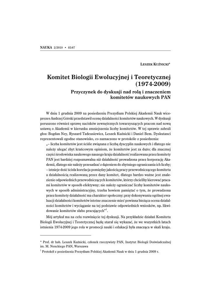 NAUKA 2/2010 • 83-87 LESZEK KUŹNICKI* Komitet Biologii Ewolucyjnej i Teoretycznej (1974-2009) Przyczynek do dyskusji nad rolą i znaczeniem komitetów naukowych PAN W dniu 1 grudnia 2009 na posiedzeniu Prezydium Polskiej Akademii Nauk wiceprezes Andrzej Górski przedstawił ocenę działalności komitetów naukowych. W dyskusji poruszono również sprawę nacisków zewnętrznych towarzyszących pracom nad nową ustawą o Akademii w kierunku zmniejszenia liczby komitetów. W tej sprawie zabrali głos: Bogdan Ney, Ryszard Tadeusiewicz, Leszek Kuźnicki i Daniel Bem. Dyskutanci reprezentowali zgodne stanowisko, co zaznaczono w protokóle z posiedzenia: „– liczba komitetów jest ściśle związana z liczbą dyscyplin naukowych i dlatego nie należy ulegać zbyt krańcowym opiniom, że komitetów jest za dużo; dla znacznej części środowiska naukowego naszego kraju działalność realizowana przez komitety PAN jest bardziej rozpoznawalna niż działalność prowadzona przez korporację Akademii, dlatego nie należy przesadzać z dążeniem do zbytniego ograniczania ich liczby; – istnieje dość ścisła korelacja pomiędzy jakością pracy przewodniczącego komitetu a działalnością realizowaną przez dany komitet, dlatego bardzo ważne jest znalezienie odpowiednich przewodniczących komitetów, którzy chcieliby kierować pracami komitetów w sposób efektywny; nie należy ograniczać liczby komitetów naukowych w sposób administracyjny, trzeba bowiem pamiętać o tym, że prowadzona przez komitety działalność ma charakter społeczny; przy dokonywaniu ogólnej ewaluacji działalności komitetów istotne znaczenie mieć powinna bieżąca ocena działalności komitetów i wyciąganie na tej podstawie odpowiednich wniosków, np. likwidowanie komitetów słabo pracujących”1. Mój artykuł ma na celu rozwinięcie tej dyskusji. Na przykładzie działań Komitetu Biologii Ewolucyjnej i Teoretycznej będę starał się wykazać, że we wszystkich latach istnienia 1974-2009 jego rola w promocji nauki i edukacji była znacząca w skali kraju. * Prof. dr hab. Leszek Kuźnicki, członek rzeczywisty PAN, Instytut Biologii Doświadczalnej im. M. Nenckiego PAN, Warszawa 1 Protokół z posiedzenia Prezydium Polskiej Akademii Nauk w dniu 1 grudnia 2009 r. 84 Leszek Kuźnicki Żadna inna instytucja – uczelnia, instytut, towarzystwo naukowe analogicznych zadań w tych latach nie prowadziła i nie wydaje się, aby w ogóle mogła się ich podjąć. Na wstępie garść informacji o genezie Komitetu. W roku 1968 zaprzestała działać powołana w 1953 r. Komisja Ewolucjonizmu PAN, a w rok później zlikwidowano Ośrodek Dokumentacji Ewolucjonizmu (1955-1969). Jest prawdą, że w pierwszych trzech latach działalności Komisja Ewolucjonizmu była skażona łysenkizmem, ale jej dorobek wydawniczy w latach późniejszych, w szczególności w zakresie przekładów dzieł Karola Darwina, jak również J.B. Lamarcka, E. Haeckla i wielu XX-wiecznych uczonych był istotny dla rozwoju ewolucjonizmu w Polsce. Na Ośrodku Dokumentacji Ewolucjonizmu PAN żaden ideologiczny zarzut nie ciążył, a mimo to padł on ofiarą czystki, którą w Polskiej Akademii Nauk przeprowadzono po „Marcu 1968”2. Po paru latach podjęto próbę naprawienia skutków tej błędnej decyzji. W uchwale II Kongresu Nauki Polskiej biologia ewolucyjna została uznana za jeden z trzech preferowanych kierunków badań. Jej konsekwencją było utworzenie Komitetu Biologii Ewolucyjnej i Teoretycznej (1974). Organizatorem Komitetu j jego pierwszym przewodniczącym był Adam Urbanek, który prowadził go przez trzy kolejne kadencje, to jest do roku 1984. W tym okresie Komitet przyczynił się do integracji badań w ramach problemu międzyresortowego MR.II.6. „Procesy ewolucyjne oraz rola teorii w biologii”3. Przez dwie następne kadencje (1984-1989) przewodnictwo Komitetu przejął Leszek Kuźnicki. Komitet nadal opiniował program i oceniał postępy problemu „Mechanizmy i przebieg procesów ewolucyjnych”. W latach 1987-1989 do Komitetu dokooptowano grupę dydaktyków i nauczycieli. Wspólnymi siłami powstała ekspertyza „Nauczanie biologii w systemie edukacji”, a jej streszczenie ukazało się w piśmie „Biologia w Szkole”4. Do integracji badaczy polskich zajmujących się różnorodnymi aspektami procesów ewolucyjnych korzystnie przyczyniły się dwie ogólnopolskie konferencje. Pierwsza odbyła się w Jabłonnie 12-15 stycznia 1987 r. i została zorganizowana wspólnym wysiłkiem Komitetu oraz Zakładu Paleobiologii PAN. Referaty tamże wygłoszone zostały następnie wydrukowane w odrębnym zeszycie „Kosmosu” zatytułowanym Ewolucjonizm u progu XXI wieku 5. Druga konferencja dotyczyła wyłącznie człowieka. W ciągu trzech dni (11-13 października 1989 r.) na terenie Pałacu Staszica zajmowano się nie tylko przeszłością, ale 2 L. Kuźnicki, Ewolucjonizm w Polsce 1883-1959. „Kosmos” 2009, t. 58, nr 3-4, 297-313. L. Kuźnicki, Biologia ewolucyjna i teoretyczna w Polsce w najbliższym dwudziestoleciu. „Kosmos” 1985, t. 34, nr 3, 419-425. 4 L. Kuźnicki, Współczesna biologia a system edukacji. „Biologia w Szkole”, 1988, 210, 212-219. 5 L. Kuźnicki, H. Osmólska (red.), Ewolucjonizm u progu XXI wieku. „Kosmos” 1987, t. 36, nr 3, 295-615. 3 Komitet Biologii Ewolucyjnej i Teoretycznej (1974-2009) 85 również teraźniejszością i przyszłością Homo sapiens sapiens6. W latach 80. pod auspicjami Komitetu Adam Łomnicki prowadził w Zawoi i Szymbarku kursy dotyczące zastosowań matematyki, w szczególności modelowania w biologii. Wspierano również konwersatorium prowadzone przez Andrzeja i Alinę Wiercińskich „Osobliwość gatunkowa człowieka”. Przejęcie przez Adama Łomnickiego przewodnictwa w Komitecie 1991-2006 owocowało nowymi inicjatywami i nowymi wyzwaniami. W Polsce od lat 90. ujawnili się rodzimi kreacjoniści, wśród których szczególną aktywność wykazuje Maci