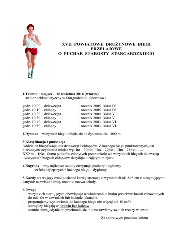 XVII POWIATOWE DRUŻYNOWE BIEGI PRZEŁAJOWE O PUCHAR STAROSTY STARGARDZKIEGO 1.Termin i miejsce – 26 kwietnia 2016 (wtorek) stadion lekkoatletyczny w Stargardzie ul. Sportowa 1 godz. 10.00 – dziewczęta godz. 10.10 – chłopcy godz. 10.20 – dziewczęta godz. 10.30 – chłopcy godz. 10.40 – dziewczęta godz. 10.50 – chłopcy - rocznik 2005 - klasa IV - rocznik 2005 - klasa IV - rocznik 2004 - klasa V - rocznik 2004 - klasa V - rocznik 2003 - klasa VI - rocznik 2003 - klasa VI 2.Dystans – wszystkie biegi odbędą się na dystansie ok. 1000 m. 3.Klasyfikacja i punktacja Oddzielna klasyfikacja dla dziewcząt i chłopców. Z każdego biegu punktowanych jest pierwszych trzydzieści miejsc wg: Im – 30pkt., IIm – 29pkt., IIIm – 28pkt., ..... XXXm – 1pkt. Suma punktów zdobytych przez szkołę we wszystkich biegach dziewcząt i wszystkich biegach chłopców decyduje o zajętym miejscu. 4.Nagrody – trzy najlepsze szkoły otrzymają puchary i dyplomy sześciu najlepszych z każdego biegu – dyplomy. 5.Każdy startujący musi posiadać kartkę startową o wymiarach ok. 8x8 cm z następującymi danymi: nazwisko i imię, rocznik, nazwa szkoły. 6.Uwagi - wszystkich startujących obowiązuje oświadczenie o braku przeciwwskazań zdrowotnych do udziału w zawodach lub badanie lekarskie - proponujemy wystawienie do każdego biegu nie więcej niż 10 osób - startujący biegają w obuwiu bez kolców - szatnie służą jedynie do przebrania się, nie zostawiamy swoich rzeczy w szatni Ze sportowym pozdrowieniem