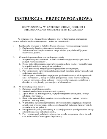 INSTRUKCJA PRZECIWPOŻAROWA OBOWIĄZUJĄCA W KATEDRZE CHEMII OGÓLNEJ I NIEORGANICZNEJ UNIWERSYTETU ŁÓDZKIEGO W związku z tym , że specyficzny charakter pracy w laboratorium chemicznym stwarza stałe niebezpieczeństwo pożaru , poleca się co następuje : I. Każda osoba pracująca w Katedrze Chemii Ogólnej i Nieorganicznej powinna : 1. Znać przepisy bezpieczeństwa przeciwpożarowego , 2. Stale czuwać nad bezpieczeństwem swego miejsca pracy i chronić je przed możliwością pożaru . II. Celem niedopuszczenia do powstania pożaru należy : 1. Nie przechowywać na stołach i w szafkach laboratoryjnych większych ilości palnych rozpuszczalników , 2. Ciecze palne niskowrzące ogrzewać wyłącznie na łaźni wodnej ( zwrócić uwagę by w pobliżu nie było palących się palników ), 3. Ciecze palne wyżej wrzące ogrzewać grzejnikami elektrycznymi, 4. Przy konieczności ogrzewania substancji palnych palnikami gazowymi zachować maksimum ostrożności , 5. Podczas prac z substancjami reagującymi gwałtownie (reakcje silnie egzotermiczne , wybuchowe ,) należy wcześniej przygotować środki ochrony osobistej ( okulary ochronne , osłonę na twarz ) i przeciwpożarowej oraz powiadomić o charakterze reakcji osoby przebywające w laboratorium . III. W przypadku pożaru należy : 1. Zachować spokój i opanowanie , 2. Studenci powinni natychmiast wezwać asystenta, 3. Zgasić palące się palniki gazowe , wyłączyć urządzenia elektryczne , usunąć substancje łatwopalne , 4. Gasić pożar odpowiednim sprzętem przeciwpożarowym : gaśnicą , kocem , piaskiem , niekiedy wodą , 5. W przypadku zapalenia się ubrania na człowieku należy ściągnąć je z niego lub zdusić ogień przez owinięcie palącego się kocem lub fartuchem ( nie używać do gaszenia wody ani gaśnic ) , 6. Po zapaleniu się cieczy łatwopalnej w szklanej aparaturze przed gaszeniem należy osłonić twarz przed odłamkami szkła , 7. Przy rozkładowych reakcjach związanych z wysoką temperaturą winno się podczas pożaru założyć maskę przeciwpożarową .