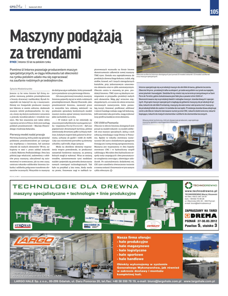 kwiecień 2012 105 fot. Intorex Maszyny podążają za trendami RYNEK | Intorex 15 lat na polskim rynku Pomimo iż Intorex pozostaje producentem maszyn specjalistycznych, w ciągu kilkunastu lat obecności na rynku polskim udało mu się zapracować na zaufanie rodzimych przedsiębiorców. Sylwia Modzelewska do dziś pracują w zakładzie, który przeszedł już w posiadanie syna pierwszego klienta. Od czasu pierwszej transakcji, maszyny Intorexu pojawiły się już w wielu rodzimych przedsiębiorstwach. Maciej Olszewski, jako przedstawiciel Intorexu, zauważył przez te wszystkie lata ciekawą zależność: na podstawie sprzedaży konkretnych modeli maszyn można opisać zmiany wzornictwa, jakie zachodziły na rynku. – W trakcie tych 15 lat zmieniały się znacznie potrzeby klientów i wymagania rynku – wspomina Maciej Olszewski. – Był czas popularności drewnianych karniszy, później dominowały drewniane gałki i uchwyty mebPierwszy model nadal pracuje lowe, kolejnym etapem była galanteria drewPierwszą maszyną, którą udało się sprzedać niana, uchwyty do pędzli i nóżki do mebli. polskiemu przedstawicielowi po nawiąza- Cały czas niezmiennie potrzebne są elementy niu współpracy z Intorexem, był automat schodów, czyli tralki, słupy i poręcze. tokarski do małych elementów TR-90, zaModa na określone elementy wyposakupiony w 1997 r. przez zakład stolarski żenia wnętrz powodowała, że producenci z okolic Makowa Podhalańskiego. Dwa lata zamawiali konkretne maszyny, za pomocą później jego właściciel, zadowolony z efek- których mogli je wykonać. Wraz ze zmianą tów pracy maszyny, zdecydował się zain- trendów, zainteresowanie tymi modelami westować w nowoczesne, jak na owe czasy, malało i pojawiała się potrzeba dostarczania centrum tokarsko-szlifierskie Intorexu (to- nowych rozwiązań technologicznych. Tak karka i szlifierka połączone transferem ele- było na przykład 4 lata temu, kiedy moda mentów toczonych). Wszystkie te maszyny na proste, frezowane nogi w meblach taJeszcze 15 lat temu Intorex był firmą zupełnie nieznaną polskim przedsiębiorcom z branży drzewnej i meblarskiej. Rynek hiszpański nie kojarzył im się z maszynami. Dzisiaj ten hiszpański producent maszyn jest liderem w swoim sektorze, doskonale znanym wśród profesjonalistów. Co więcej, cieszy się dużym zaufaniem i uznaniem z powodu wysokiej jakości i trwałości maszyn. Nie bez znaczenia jest także dobry i sprawny serwis w Polsce, który jest zasługą polskich przedstawicieli – Macieja Olszewskiego i Andrzeja Sałaciaka. REKLAMA picerowanych wymusiła na firmie Intorex skonstruowanie całkowicie nowej maszyny Obecnie w ofercie Intorexu dostępnych jest ponad 25 modeli tokarek i 15 modeli szlifierek TMC-1500. Została ona zaprojektowana do oraz maszyn specjalnych. produkcji z drewna litego kolumn, tralek, nóg stołów, krzeseł, sof i innych nieregularnych kształtów, przy jednorazowym umocowaniu elementu oraz w cyklu automatycznym. Intorex specjalizuje się w produkcji maszyn do obróbki drewna, głównie toczenia. Obecnie centra te stanowią 50 proc. proObecnie 94 proc. produkcji trafia na eksport, przede wszystkim na rynek europejski, dukcji Intorexu. TMC-1500 są idealnym rozamerykański i kanadyjski. Siedziba firmy mieści się na terenie przemysłowym w Sant wiązaniem w przypadku produkcji małych Pere de Torelló, gdzie zlokalizowana jest fabryka o powierzchni 3100 m2. serii elementów. Mają pięć wrzecion mięSkoncentrowano się na produkcji dwóch rodzajów maszyn: standardowych i specjaldzypolarnych, a w sumie do ośmiu wrzecion nych. W grupie maszyn specjalnych znajdują się głównie maszyny do produkcji drążsterowanych numerycznie, które pozwaków, tokarki do obróbki frontalnej, maszyny do wiercenia i wkręcania muf, maszyny lają toczyć, frezować, profilować, szlifować do produkcji kółek do zasłon i trzonków do narzędzi. Produkcja standardowa obejmuje i wiercić każdego rodzaju nogę lub kolumnę. centra obróbcze i tokarki sterowane numerycznie CNC, tokarki elektroniczne, tokarki Jeśli zaistnieje taka potrzeba, mogą wykonać kopiujące, tokarki do małych elementów i szlifierki do elementów toczonych. inny profil na każdej ze stron elementu. CKI 1500 w Poznaniu Obecnie w ofercie Intorexu dostępnych jest ponad 25 modeli tokarek i 15 modeli szlifierek oraz maszyn specjalnych. Jedną z nich zobaczą zwiedzający targi Drema w Poznaniu. Będzie to tokarka sterowana numerycznie CKI 1500 z dodatkowym agregatem frezującym i nową wersją oprogramowania. Maszyna jest wyposażona w dwa kopiały sterowane CNC i w hydrauliczny zespół cyklinujący. Ma także dwa hydrauliczne zespoły noży czopujących i dwa pneumatyczne urządzenia centrujące, ułatwiające załadunek. Po zainstalowaniu dodatkowej osi, CKI 1500 umożliwia równoczesne toczenie z trzema nożami i frezowanie w tym samym cyklu roboczym. L Własny dział techniczny, którym dysponuje producent, zaprojektuje maszynę zgodnie z wymaganiami klientów. fot. Intorex