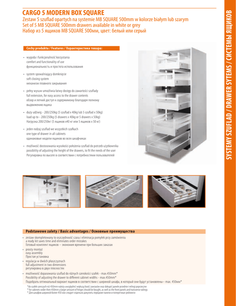 Zestaw 5 szuflad opartych na systemie MB SQUARE 500mm w kolorze białym lub szarym Set of 5 MB SQUARE 500mm drawers available in white or grey Набор из 5 ящиков MB SQUARE 500мм, цвет: белый или серый Cechy produktu / Features / Характеристика товара: • wygoda i funkcjonalność korzystania comfort and functionality of use функциональность и простота использования • system spowalniający domknięcie soft closing system механизм плавного закрывания • pełny wysuw umożliwia łatwy dostęp do zawartości szuflady full extension, for easy access to the drawer contents обзор и легкий доступ к содержимому благодаря полному выдвижению ящика • duży udźwig - 200/250kg (5 szuflad x 40kg lub 5 szuflad x 50kg) load up to - 200/250kg (5 drawers x 40kg or 5 drawers x 50kg) Нагрузка 200/250кг (5 ящиков х40 кг или 5 ящиков х 50 кг) • jeden rodzaj szuflad we wszystkich szafkach one type of drawer in all cabinets одинаковые модели ящиков во всех шкафчиках • możliwość dostosowania wysokości położenia szuflad do potrzeb użytkownika possibility of adjusting the height of the drawers, to fit the needs of the user Регулировка по высоте в соответствии с потребностями пользователей Podstawowe zalety / Basic advantages / Основные преимущества • zestaw skompletowany to oszczędnoość czasu i eliminacja pomyłek przy zamówieniu a ready kit saves time and eliminates order mistakes Готовый комплект ящиков – экономия времени при больших заказах • prosty montaż easy assembly Простая установка • regulacja w dwóch płaszczyznach full adjustment in two dimensions регулировка в двух плоскостях • możliwoość dopasowania szuflad do różnych szerokości szafek - max.450mm* Possibility of adjusting the drawer to different cabinet widths - max.450mm* Подобрать оптимальный вариант ящиков в соответствии с шириной шкафа, в который они будут установлены– max. 450мм* *do szafek szerszych niż 450mm należy uwzględnić większą iloość zawiasów oraz dokupić panele przednie i relingi poprzeczne * for cabinets wider then 450mm a larger amount of hinges should be bought, as well as the front panels and transverse railings * Для шкафов шириной более 450 мм следует отдельно докупить передние панели и поперечные рейлинги SYSTEMY SZUFLAD / DRAWER SYTEMS / СИСТЕМЫ ЯЩИКОВ CARGO 5 MODERN BOX SQUARE min. 352 32 Zawiasy w zestawie/ hinges included/ Петли прилагаются 352 32 1427 min. 1700 288 608 1075 416 352 32 787 435 37 287 384 ø5 32 5 ø3 51 33 Panel przedni oraz reling poprzeczny do przycięcia (dostarczany w odcinkach 1100 mm). Takie rozwiązanie daje możliwość indywidualnego dopasowania szuflady do szerokości korpusu. Front panel and transverse railing, are delivered in 1100mm long pieces. This gives a possibility, for individual adjustment of the drawer, to different cabinet widths. Панель и поперечные рейлинги можно обрезать (изначальная длина 1100 мм). 0 0 18 SYSTEMY SZUFLAD / DRAWER SYTEMS / СИСТЕМЫ ЯЩИКОВ Informacje montażowe/ mounting information / Особенности сборки и монтажа Przykład planowania rozstawu szuflad do szafki o wysokości min. 1700 mm przy użyciu 4 zawiasów/ Spacing between drawers example, in a cabinet at least 1700mm high, using 4 hinges/ Расстояние между боковинами ящиками и корпусом шкафа высотой как минимум 1700 мм с использованием четырех петель Wymiary elementów ścianki tylnej i dna szuflady dla płyty 16mm Mounting dimensions of drawer back and bottom for 16 mm board Монтажные размеры задней стенки и дна ящика для плиты 16 мм LW -6 4 B LW B -97 199 A A LW 1 5 NL+ LW - 86 -24 NL LW - Wewnętrzna szerokość korpusu/ Body internal width/ Внутренняя ширина корпуса NL - Długość nominalna prowadnicy/ Nominal length Bearings/ Номинальная длина Cargo 5 z szufladami MB SQUARE / 1 kpl. relingów / L500 CARGO with 5 drawers MB SQUARE / 1 set of rails / L500 Cargo 5 , ящики MB SQUARE / 1 комплект рейлингов / L500 szary/grey/ серый 50 kg / 50кг szary/grey/ серый 40 kg / 40кг biały/ white/ белый 50 kg / 50кг PB-KW-KPL500C-50 PB-KW-KPL500C-40 PB-KW-KPL500C1-50 Modern Box kwadratowy, 500mm, wysoki Modern Box Square, 500mm, high Modern Box SQUARE, 500мм, высокий 5 kpl. Złączka frontu wewnętrznego, wysoka Inner front connector, high Соединитель фронта внутренний, высокий 5 kpl. PB-D-WEWMOCC-KW PB-D-WEWMOCC-KW-10 Panel przedni do szuflady wewnętrznej, 1100mm Front panel for inner drawer 1100 mm Передняя панель для внутренней шуфляды 1100мм 2 szt. PB-D-PANELWEW PB-D-PANELWEW-10 Reling poprzeczny, 1100mm Transverse railing Relling 1100 mm Поперечный релинг 1100 мм 2 szt. PB-RP-KW1100 PB-RP-KW1100-10 Zawias hydrauliczny 155°, z prowadnikiem EURO GTV hinge 1550 , hydraulic Угловая петля GTV 1550 4 szt. ZM-HCKT155ZE Wyposażenie dodatkowe/ optional accessories/ Организация внутреннего пространства ящиков PB-D-CONREL-KW, PB-D-CONREL-KW-10 PB-D-ZR-KW-00, PB-D-ZR-KW-10 Złączka do listwy poprzecznej i do relingów