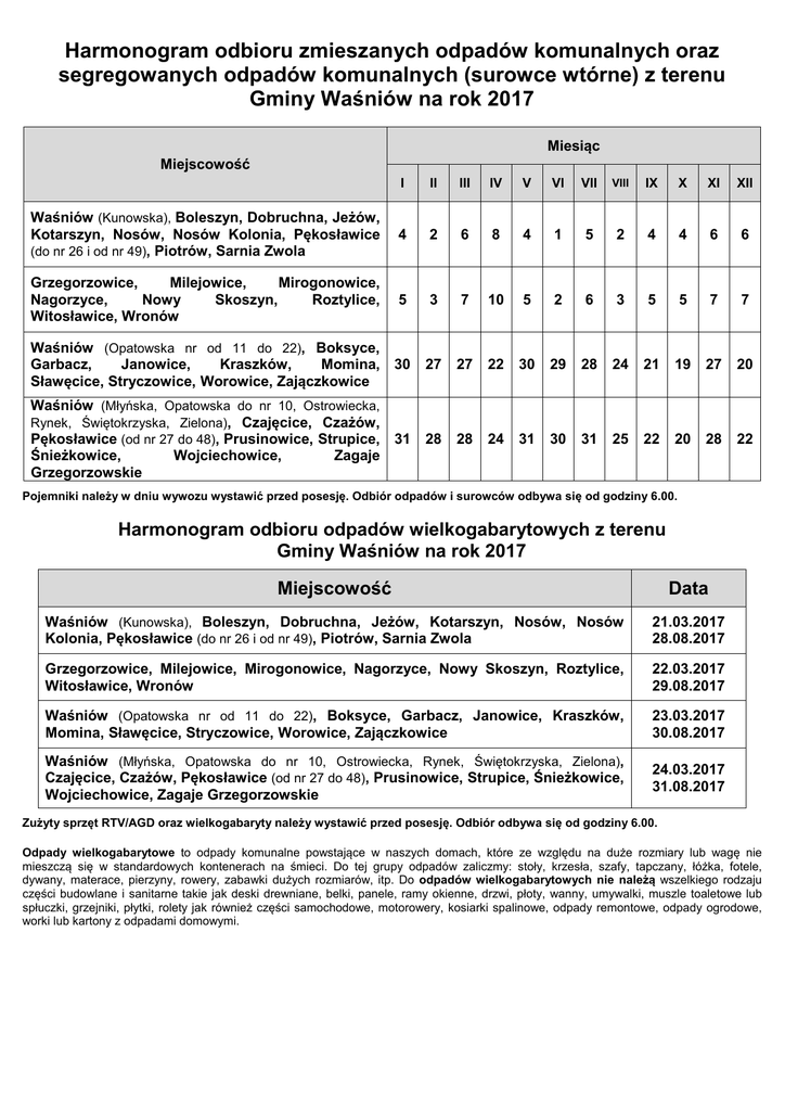 Harmonogram odbioru zmieszanych odpadów komunalnych oraz segregowanych odpadów komunalnych (surowce wtórne) z terenu Gminy Waśniów na rok 2017 Miesiąc Miejscowość I II III IV V VI VII VIII IX X XI XII Waśniów (Kunowska), Boleszyn, Dobruchna, Jeżów, Kotarszyn, Nosów, Nosów Kolonia, Pękosławice (do nr 26 i od nr 49), Piotrów, Sarnia Zwola 4 2 6 8 4 1 5 2 4 4 6 6 Grzegorzowice, Milejowice, Mirogonowice, Nagorzyce, Nowy Skoszyn, Roztylice, Witosławice, Wronów 5 3 7 10 5 2 6 3 5 5 7 7 Waśniów (Opatowska nr od 11 do 22), Boksyce, Garbacz, Janowice, Kraszków, Momina, 30 Sławęcice, Stryczowice, Worowice, Zajączkowice 27 27 22 30 29 28 24 21 19 27 20 Waśniów (Młyńska, Opatowska do nr 10, Ostrowiecka, Rynek, Świętokrzyska, Zielona), Czajęcice, Czażów, Pękosławice (od nr 27 do 48), Prusinowice, Strupice, 31 Śnieżkowice, Wojciechowice, Zagaje Grzegorzowskie 28 28 24 31 30 31 25 22 20 28 22 Pojemniki należy w dniu wywozu wystawić przed posesję. Odbiór odpadów i surowców odbywa się od godziny 6.00. Harmonogram odbioru odpadów wielkogabarytowych z terenu Gminy Waśniów na rok 2017 Miejscowość Data Waśniów (Kunowska), Boleszyn, Dobruchna, Jeżów, Kotarszyn, Nosów, Nosów Kolonia, Pękosławice (do nr 26 i od nr 49), Piotrów, Sarnia Zwola 21.03.2017 28.08.2017 Grzegorzowice, Milejowice, Mirogonowice, Nagorzyce, Nowy Skoszyn, Roztylice, Witosławice, Wronów 22.03.2017 29.08.2017 Waśniów (Opatowska nr od 11 do 22), Boksyce, Garbacz, Janowice, Kraszków, Momina, Sławęcice, Stryczowice, Worowice, Zajączkowice 23.03.2017 30.08.2017 Waśniów (Młyńska, Opatowska do nr 10, Ostrowiecka, Rynek, Świętokrzyska, Zielona), Czajęcice, Czażów, Pękosławice (od nr 27 do 48), Prusinowice, Strupice, Śnieżkowice, Wojciechowice, Zagaje Grzegorzowskie 24.03.2017 31.08.2017 Zużyty sprzęt RTV/AGD oraz wielkogabaryty należy wystawić przed posesję. Odbiór odbywa się od godziny 6.00. Odpady wielkogabarytowe to odpady komunalne powstające w naszych domach, które ze względu na duże rozmiary lub wagę nie mieszczą się w standardowych kontenerach na śmieci. Do tej grupy odpadów zaliczmy: stoły, krzesła, szafy, tapczany, łóżka, fotele, dywany, materace, pierzyny, rowery, zabawki dużych rozmiarów, itp. Do odpadów wielkogabarytowych nie należą wszelkiego rodzaju części budowlane i sanitarne takie jak deski drewniane, belki, panele, ramy okienne, drzwi, płoty, wanny, umywalki, muszle toaletowe lub spłuczki, grzejniki, płytki, rolety jak również części samochodowe, motorowery, kosiarki spalinowe, odpady remontowe, odpady ogrodowe, worki lub kartony z odpadami domowymi.