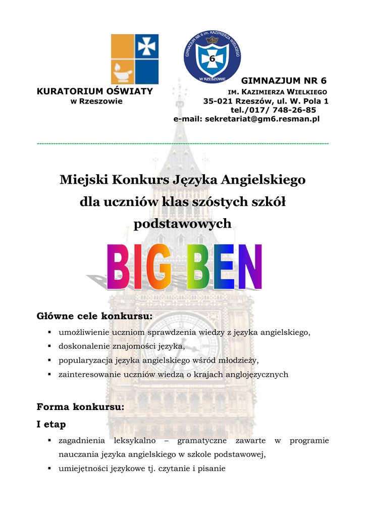 6 W RZESZOWIE KURATORIUM OŚWIATY W IM. GIMNAZJUM NR 6 KAZIMIERZA WIELKIEGO 35-021 Rzeszów, ul. W. Pola 1 tel./017/ 748-26-85 e-mail: [email protected] Rzeszowie ------------------------------------------------------------------------------------------------------------------------------ Miejski Konkurs Języka Angielskiego dla uczniów klas szóstych szkół podstawowych Główne cele konkursu: umożliwienie uczniom sprawdzenia wiedzy z języka angielskiego, doskonalenie znajomości języka, popularyzacja języka angielskiego wśród młodzieży, zainteresowanie uczniów wiedzą o krajach anglojęzycznych Forma konkursu: I etap zagadnienia leksykalno – gramatyczne zawarte nauczania języka angielskiego w szkole podstawowej, umiejętności językowe tj. czytanie i pisanie w programie II etap: zagadnienia leksykalno – gramatyczne (zakres z etapu I), umiejętności językowe (czytanie, słuchanie i pisanie), wiadomości o historii, geografii i kulturze Kanady Termin i miejsce konkursu: I etap odbędzie się 28 lutego 2017 r. o godz. 11.00 w szkołach podstawowych, w których zgłoszą się uczniowie chcący brać udział w konkursie. II etap odbędzie się 28 kwietnia 2017 r. o godz. 13.00 w Gimnazjum nr 6 im. Kazimierza Wielkiego w Rzeszowie. Zgłoszenia należy dokonać w terminie do 3 lutego 2017 r. na adres: Gimnazjum nr 6 im. Kazimierza Wielkiego ul. Wincentego Pola 1 35-021 Rzeszów z dopiskiem Big Ben lub e-mailowo: [email protected] [email protected] Organizatorzy konkursu: mgr Barbara Chuchla mgr Magdalena Kwaśniak mgr Joanna Cyran - Dzioch Dyrektor Szkoły: mgr Stanisław Filarowski Regulamin Miejskiego Konkursu Języka Angielskiego dla uczniów klas szóstych szkół podstawowych BIG BEN 1. Organizatorem konkursu jest Gimnazjum nr 6 im. Kazimierza Wielkiego w Rzeszowie. 2. W konkursie biorą udział uczniowie klas szóstych rzeszowskich szkół podstawowych. 3. Szkoły podstawowe zgłaszają chęć wzięcia udziału w konkursie na formularzu zgłoszeniowym przekazanym w załączeniu na adres: Gimnazjum nr 6 im. Kazimierza Wielkiego ul. Wincentego Pola 1 35-021 Rzeszów z dopiskiem BIG BEN lub drogą elektroniczną na jeden z poniższych adresów: [email protected] [email protected] 4. Przesłanie karty zgłoszeniowej oznacza wyrażenie przez uczestników zgody na przetwarzanie ich danych osobowych na potrzeby konkursu. 5. Zgłoszenia szkół do konkursu należy przesyłać do 3 lutego 2017 r. 6. Regulamin konkursu znajduje się na stronie internetowej Gimnazjum nr 6 [email protected] . 7. Ustala się dwa etapy konkursu: Etap I – eliminacje szkolne Etap szkolny odbędzie się 28 lutego 2017 roku o godz. 11.00 i będzie polegał na rozwiązaniu testu leksykalno - gramatycznego (czas: 60 minut). Test zostanie przesłany do szkoły na adres poczty elektronicznej na dzień przed konkursem. Szkolny organizator konkursu przesyła listę uczniów biorących w konkursie i ich prace do 3 marca 2017 r. na adres Gimnazjum nr 6. udział Lista zakwalifikowanych do II etapu (uczestników, którzy uzyskali najwyższe wyniki, nie więcej jednak niż 40 uczniów) zostanie przesłana do poszczególnych szkół podstawowych i opublikowana na stronie Gimnazjum nr 6 do 17 marca 2017r.. Etap II - finał II etap odbędzie 28 kwietnia 2017 r. o godz. 13.00 w Gimnazjum nr 6 im. Kazimierza Wielkiego w Rzeszowie. Tytuł laureata Miejskiego Konkursu Języka Angielskiego BIG BEN otrzymuje 5 uczniów, którzy w II etapie konkursu zdobyli największą liczbę punktów. Nazwiska laureatów zostaną opublikowane na stronie internetowej gimnazjum oraz przesłane do poszczególnych szkół podstawowych wraz z ich wynikami do 12 maja 2017 r. 8. Przystąpienie do konkursu jest równoznaczne z akceptacją treści regulaminu. Karta zgłoszenia udziału szkoły w konkursie BIG BEN Dane szkoły: pełna nazwa szkoły, adres, numer telefonu, adres e-mailowy Dane nauczyciela organizującego I etap: imię i nazwisko, telefon kontaktowy Dane uczestników konkursu Wyrażam zgodę na przetwarzanie przez Organizatora danych osobowych na potrzeby konkursu oraz w celach marketingowych (Ustawa o ochronie danych osobowych z dnia 29.08.1997 r.).