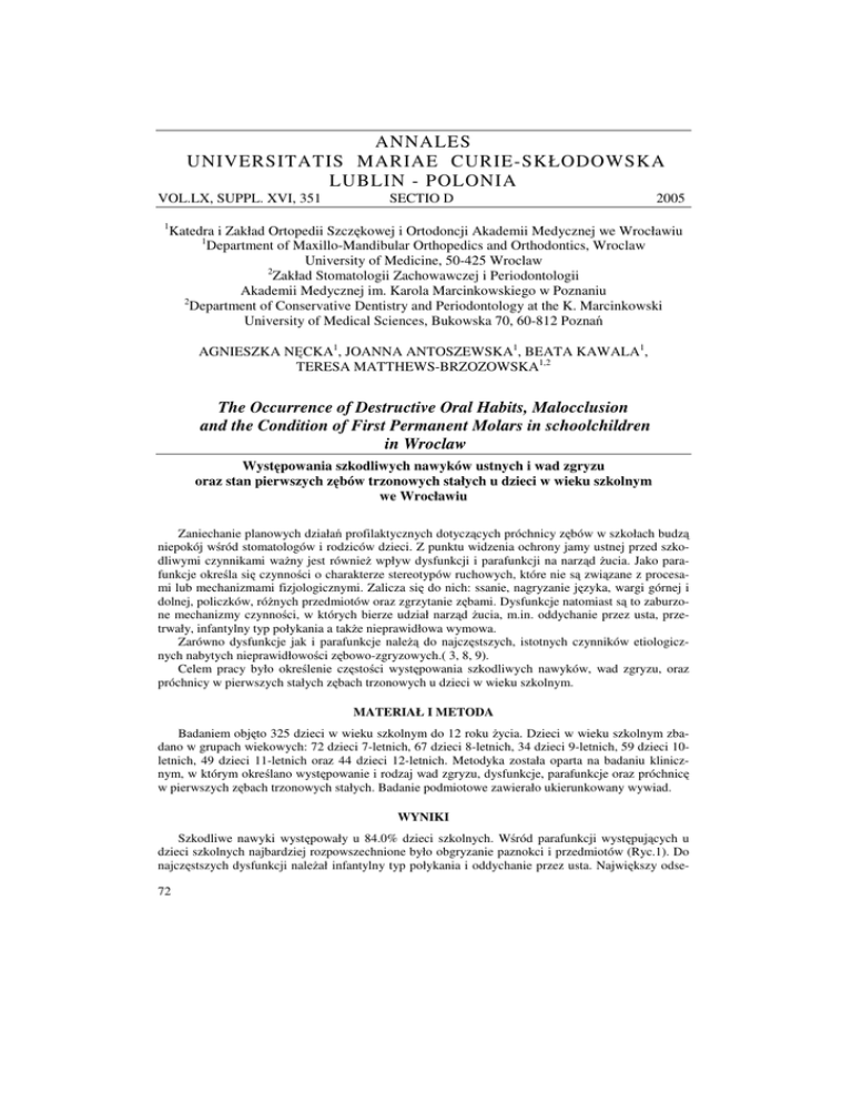 ANNALES UNIVERSITATIS MARIAE CURIE-SKŁODOWSKA LUBLIN - POLONIA VOL.LX, SUPPL. XVI, 351 SECTIO D 2005 1 Katedra i Zakład Ortopedii Szczękowej i Ortodoncji Akademii Medycznej we Wrocławiu 1 Department of Maxillo-Mandibular Orthopedics and Orthodontics, Wroclaw University of Medicine, 50-425 Wroclaw 2 Zakład Stomatologii Zachowawczej i Periodontologii Akademii Medycznej im. Karola Marcinkowskiego w Poznaniu 2 Department of Conservative Dentistry and Periodontology at the K. Marcinkowski University of Medical Sciences, Bukowska 70, 60-812 Poznań AGNIESZKA NĘCKA1, JOANNA ANTOSZEWSKA1, BEATA KAWALA1, TERESA MATTHEWS-BRZOZOWSKA1,2 The Occurrence of Destructive Oral Habits, Malocclusion and the Condition of First Permanent Molars in schoolchildren in Wroclaw Występowania szkodliwych nawyków ustnych i wad zgryzu oraz stan pierwszych zębów trzonowych stałych u dzieci w wieku szkolnym we Wrocławiu Zaniechanie planowych działań profilaktycznych dotyczących próchnicy zębów w szkołach budzą niepokój wśród stomatologów i rodziców dzieci. Z punktu widzenia ochrony jamy ustnej przed szkodliwymi czynnikami ważny jest również wpływ dysfunkcji i parafunkcji na narząd żucia. Jako parafunkcje określa się czynności o charakterze stereotypów ruchowych, które nie są związane z procesami lub mechanizmami fizjologicznymi. Zalicza się do nich: ssanie, nagryzanie języka, wargi górnej i dolnej, policzków, różnych przedmiotów oraz zgrzytanie zębami. Dysfunkcje natomiast są to zaburzone mechanizmy czynności, w których bierze udział narząd żucia, m.in. oddychanie przez usta, przetrwały, infantylny typ połykania a także nieprawidłowa wymowa. Zarówno dysfunkcje jak i parafunkcje należą do najczęstszych, istotnych czynników etiologicznych nabytych nieprawidłowości zębowo-zgryzowych.( 3, 8, 9). Celem pracy było określenie częstości występowania szkodliwych nawyków, wad zgryzu, oraz próchnicy w pierwszych stałych zębach trzonowych u dzieci w wieku szkolnym. MATERIAŁ I METODA Badaniem objęto 325 dzieci w wieku szkolnym do 12 roku życia. Dzieci w wieku szkolnym zbadano w grupach wiekowych: 72 dzieci 7-letnich, 67 dzieci 8-letnich, 34 dzieci 9-letnich, 59 dzieci 10letnich, 49 dzieci 11-letnich oraz 44 dzieci 12-letnich. Metodyka została oparta na badaniu klinicznym, w którym określano występowanie i rodzaj wad zgryzu, dysfunkcje, parafunkcje oraz próchnicę w pierwszych zębach trzonowych stałych. Badanie podmiotowe zawierało ukierunkowany wywiad. WYNIKI Szkodliwe nawyki występowały u 84.0% dzieci szkolnych. Wśród parafunkcji występujących u dzieci szkolnych najbardziej rozpowszechnione było obgryzanie paznokci i przedmiotów (Ryc.1). Do najczęstszych dysfunkcji należał infantylny typ połykania i oddychanie przez usta. Największy odse72 tek wad stanowiły tyłozgryzy (Ryc 2). Frekwencja wad zgryzu była większa u dzieci uprawiających szkodliwe nawyki ustne. U 47.08% dzieci szkolnych nie zaobserwowano wady zgryzu mimo współistnienia szkodliwych nawyków ustnych. U 46.5% dzieci w wieku szkolnym nie stwierdzono klinicznych oznak próchnicy pierwszych trzonowców stałych (Ryc.3). Choroba próchnicowa dotyczyła średnio 0.42 zęba oraz odnotowano średnio 0.93 wypełnień (pierwszego stałego zęba trzonowego). DYSKUSJA Wyniki badań potwierdzają przyjętą tezę, że stan zębów u dzieci w Polsce nie jest zadawalający. Wiąże się to z zagrożeniem przedwczesnej utraty zarówno zębów trzonowych mlecznych jak i zębów pierwszych trzonowych stałych. Częste występowanie szkodliwych nawyków u dzieci szkolnych niesie za sobą ryzyko powstania wady zgryzu, a także zaburzeń czynnościowych narządu żucia (10). W działaniach profilaktycznych należy wziąć pod uwagę rodzaj uprawianego nawyku oraz wiek dziecka. Jeśli nawyk występuje u dziecka w okresie uzębienia mlecznego nie powoduje on długofalowych skutków w narządzie żucia. Przetrwanie szkodliwego nawyku bądź jego ponowne uruchomienie w okresie uzębienia mieszanego i stałego grozi zniekształceniami w narządzie żucia (5, 6, 7). Nie można także zapominać o aspektach psychologicznych, związanych z występowaniem nawyków u dzieci. W większości przypadków parafunkcje są czynnościami służącymi rozładowaniu uczucia niepokoju, osamotnienia, bezczynności. Przetrwałe nawyki ssania stwierdza się u dzieci w związku z przebytymi chorobami, wychowywaniem w trudnych, patogennych warunkach środowiskowych, a także u dzieci nieśmiałych, trudno nawiązujących kontakty z rówieśnikami (1, 2, 4).Jednocześnie należy podkreślić, że nie zawsze zaobserwowanie nawyku u pacjenta wiązało się ze współistnieniem wady zgryzu, co pokazały nasze badania. Czas trwania niekorzystnego nawyku i zakłócania przez niego spoczynkowej równowagi sił w narządzie żucia mają podstawowe znaczenie w rozpatrywaniu nawyków jako czynników etiologicznych wad zgryzu. Wyniki powyższych badań skłaniają nas do wniosku, że istotnym zadaniem w profilaktyce narządu żucia u polskich dzieci jest nie tylko profilaktyka próchnicy, ale także wczesne wykrywanie i eliminowanie dysfunkcji oraz parafunkcji. PIŚMIENNICTWO 1. Bayardo RE, Mejia JJ, Orzoco S, Montoya K. Etiology of oral habits. ASDC J Dent Child 1996; 63(5): 350-353. 2. Fields T: Sucking for stress reduction, growth and development during infancy. Pediatr. Basics 1993; 64: 13-16. 3. Fukuta O, Braham RL, Yokoi K, Kurosu K. Damage to the primary dentition resulting from thumb and finger (digit) sucking. ASDC J Dent Child 1996; 63(6):403-407. 4. Herud B, Warnack AE. Aparat stały według Grabera do zwalczania uporczywego nawyku ssania kciuków. Postępowanie kliniczne i laboratoryjne. Czas. Stomat.1998;51(8): 555-558. 5. Karjalainen S, Rönning O, Lapinleimu H, Simell O. Association between early weaning , nonnutritive sucking habits and occlusal anomalies in 3-year-old Finnish children. Int J Peadiatr Dent 19