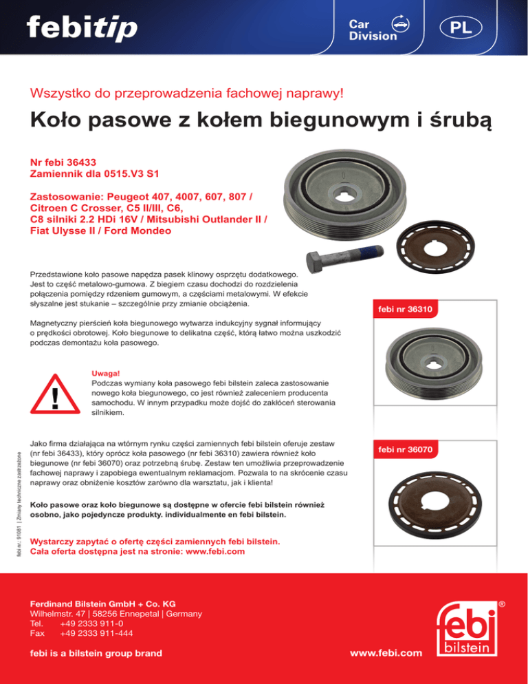 PL Wszystko do przeprowadzenia fachowej naprawy! Koło pasowe z kołem biegunowym i śrubą Nr febi 36433 Zamiennik dla 0515.V3 S1 Zastosowanie: Peugeot 407, 4007, 607, 807 / Citroen C Crosser, C5 II/III, C6, C8 silniki 2.2 HDi 16V / Mitsubishi Outlander II / Fiat Ulysse II / Ford Mondeo Przedstawione koło pasowe napędza pasek klinowy osprzętu dodatkowego. Jest to część metalowo-gumowa. Z biegiem czasu dochodzi do rozdzielenia połączenia pomiędzy rdzeniem gumowym, a częściami metalowymi. W efekcie słyszalne jest stukanie – szczególnie przy zmianie obciążenia. febi nr 36310 Magnetyczny pierścień koła biegunowego wytwarza indukcyjny sygnał informujący o prędkości obrotowej. Koło biegunowe to delikatna część, którą łatwo można uszkodzić podczas demontażu koła pasowego. febi nr.: 91081 | Zmiany techniczne zastrzeżone Uwaga! Podczas wymiany koła pasowego febi bilstein zaleca zastosowanie nowego koła biegunowego, co jest również zaleceniem producenta samochodu. W innym przypadku może dojść do zakłóceń sterowania silnikiem. Jako firma działająca na wtórnym rynku części zamiennych febi bilstein oferuje zestaw (nr febi 36433), który oprócz koła pasowego (nr febi 36310) zawiera również koło biegunowe (nr febi 36070) oraz potrzebną śrubę. Zestaw ten umożliwia przeprowadzenie fachowej naprawy i zapobiega ewentualnym reklamacjom. Pozwala to na skrócenie czasu naprawy oraz obniżenie kosztów zarówno dla warsztatu, jak i klienta! Koło pasowe oraz koło biegunowe są dostępne w ofercie febi bilstein również osobno, jako pojedyncze produkty. individualmente en febi bilstein. Wystarczy zapytać o ofertę części zamiennych febi bilstein. Cała oferta dostępna jest na stronie: www.febi.com Ferdinand Bilstein GmbH + Co. KG Wilhelmstr. 47 | 58256 Ennepetal | Germany Tel. +49 2333 911-0 Fax +49 2333 911-444 febi is a bilstein group brand febi nr 36070
