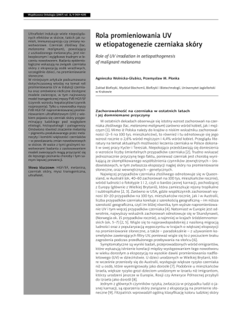 Współczesna Onkologia (2007) vol. 11; 9 (419–429) Ultrafiolet indukuje wiele niepożądanych efektów w skórze, takich jak rumień, immunosupresja czy zmiany nowotworowe. Czerniak złośliwy (łac. melanoma malignum), powstający z uszkodzonego melanocytu, jest niebezpiecznym i wyjątkowo trudnym w leczeniu nowotworem. Badania epidemiologiczne wskazują na związek czerniaka skóry z ekspozycją osób wrażliwych, szczególnie dzieci, na promieniowanie słoneczne. W niniejszym artykule podsumowano dotychczasową wiedzę na temat roli promieniowania UV w indukcji czerniaka oraz omówiono nieliczne dostępne modele zwierzęce, w tym najnowszy model transgenicznej myszy FVB HGF/SF (czynnik wzrostu hepatocytów/czynnik rozproszenia). Tylko u noworodka myszy FVB HGF/SF napromieniowanej promieniowaniem ultrafioletowym (UV) z wiekiem pojawia się czerniak skóry przypominający ludzkiego pod względem etiologii, histopatologii i patogenezy. Omówiono również znaczenie melaniny – pigmentu produkowanego przez melanocyty i komórki większości czerniaków – w powstawaniu zmian nowotworowych w skórze. W walce z tymi groźnymi nowotworami badania z zastosowaniem modeli zwierzęcych mogą przyczynić się do lepszego poznania choroby i tym samym lepszej prewencji. Słowa kluczowe: HGF/SF, melanina, czerniak skóry, mysz transgeniczna, ultrafiolet. Rola promieniowania UV w etiopatogenezie czerniaka skóry Role of UV irradiation in aetiopathogenesis of malignant melanoma Agnieszka Wolnicka-Głubisz, Przemysław M. Płonka Zakład Biofizyki, Wydział Biochemii, Biofizyki i Biotechnologii, Uniwersytet Jagielloński w Krakowie Zachorowalność na czerniaka w ostatnich latach i jej domniemane przyczyny W ostatnich dekadach obserwuje się istotny wzrost zachorowań na czerniaka złośliwego (łac. melanoma malignum) zarówno wśród kobiet, jak i mężczyzn [1]. Mimo iż Polska należy do krajów o niskim wskaźniku zachorowalności (2–5 na 100 tys. mieszkańców), to również i tu odnotowuje się jego wzrost rocznie o 2,6% wśród mężczyzn i 4,4% wśród kobiet. Przeglądu literatury na temat aktualnych możliwości leczenia czerniaka w Polsce dokonali w swej pracy Kycler i Teresiak. Niepokojąco przedstawiają się doniesienia o wzroście liczby śmiertelnych przypadków czerniaka [2]. Trudno wskazać jednoznacznie przyczynę tego faktu, ponieważ czerniak jest chorobą wynikającą ze skomplikowanego współistnienia czynników zewnętrznych – środowiskowych, w tym zwłaszcza ekspozycji nagiej skóry na promieniowanie słoneczne, oraz wewnętrznych – genetycznych. Najwięcej przypadków czerniaka złośliwego odnotowuje się w Queensland, w Australii (ok. 40–60 zachorowań na 100 tys. mieszkańców rocznie), wśród ludności o fototypie 1 i 2, czyli o bardzo jasnej karnacji, pochodzącej z Europy (głównie z Wielkiej Brytanii), która zamieszkuje rejony tropikalne i subtropikalne [2, 3]. Zarówno w USA, gdzie współczynnik zachorowań wynosi 10–20 przypadków na 100 tys. mieszkańców rocznie, jak i w Australii, liczba przypadków czerniaka koreluje z szerokością geograficzną – im niższa szerokość geograficzna, czyli im bliżej równika, tym wyższe napromieniowanie UV i tym więcej przypadków czerniaka [4]. Natomiast w Europie jest odwrotnie, najwyższy wskaźnik zachorowań odnotowuje się w Skandynawii, (Norwegia ok. 15 przypadków rocznie), a najmniej w krajach śródziemnomorskich (ok. 5–7) [2, 5]. Wiąże się to najprawdopodobniej z nasiloną migracją ludności oraz z popularyzacją wypoczynku w krajach o większej ekspozycji na promieniowanie słoneczne, a także – paradoksalnie – z używaniem kosmetyków zawierających filtry UV, ponieważ wiąże się to z poczuciem braku zagrożenia podczas przedłużonego przebywania na słońcu [6]. Symptomatyczne są wyniki badań, przeprowadzonych wśród emigrantów, które wykazują istnienie korelacji między występowaniem tego nowotworu w wieku dorosłym a ekspozycją na wysokie dawki promieniowania nadfioletowego (UV) w dzieciństwie. U dzieci urodzonych w Wielkiej Brytanii, które wcześnie przeniosły się do Australii, występuje większe ryzyko czerniaka niż u osób, które wyemigrowały jako dorosłe [7]. Podobnie u mieszkańców Izraela, większe ryzyko grozi dzieciom urodzonym w Izraelu niż imigrantom, którzy urodzeni jeszcze w Europie, Rosji czy Ameryce Północnej przybyli do Izraela jako dorośli [8]. Jednym z głównych czynników ryzyka, zwłaszcza w przypadku ludzi o jasnej karnacji, są oparzenia skóry związane z ekspozycją na promienie słoneczne [9]. Fitzpatrick wprowadził ogólną klasyfikację koloru ludzkiej skóry Współczesna Onkologia (2007) vol. 11; 9 (419–429) UV irradiation has multiple effects on skin including erythema, immunosuppression and the induction of keratinocyte-derived skin cancers and cutaneous malignant melanoma. Cutaneous malignant melanoma, which arises from damage to the melanocytes, the pigment cells of the skin, is the most lethal of the skin cancers, known for its intractability to current therapies. Cutaneous malignant melanoma is associated in epidemiological studies with sun exposure of susceptible populations, especially children. In this review, we summarize the experimental information available on the role of UV radiation in melanoma and give an overview of a new melanoma model. Neonatally irradiated with UV, HGF/SF (hepatocyte growth factor/scatter factor) transgenic mice with age develop melanoma which recapitulates the aetiology, the histopathology and molecular pathogenesis of human disease. We also describe the role of melanin in the process of skin carcinogenesis. Melanin is the basic skin pigment present also in most types of melanoma. Studies on animal models for melanoma, especially HGF/SF transgenic mice, may help not only in understanding this lethal disease but also help to prevent it. Key words: HGF/SF, melanin, melanoma, transgeni