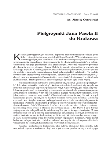 PEREGRINUS CRACOVIENSIS Zeszyt 20, 2009 ks. Maciej Ostrowski Pielgrzymki Jana Pawła II do Krakowa K raków jest wyjątkowym miastem. Zapewne żadne inne miejsce – chyba poza Italią – nie gościło tyle razy widzialnej Głowy Kościoła. W trzydziestą rocznicę pierwszej pielgrzymki Jana Pawła II do Krakowa warto poświęcić nieco miejsca przypomnieniu papieskiego pielgrzymowania do „królewskiego miasta”, a zwłaszcza refleksji nad jego przesłaniem tutaj przekazanym. Autor nie rości sobie pretensji do ukazania wyczerpującego obrazu. Byłoby to zresztą niemożliwe w ramach tak krótkiego artykułu. Chciałby jedynie wskazać kilka istotnych wątków, które – jak mu się wydaje – stanowiły przewodnią nić kolejnych papieskich odwiedzin. Nie podaje również zbyt szczegółowej kroniki spotkań, ograniczając się do najważniejszych wydarzeń oraz komentarza tekstów papieskich przemówień drukowanych w oficjalnych publikatorach. Trzeba pamiętać, iż nieoficjalnych spotkań było wiele więcej. Na początku chce zaznaczyć, iż świadomie używa słowa „papieskie pielgrzymki” lub „duszpasterskie odwiedziny”. Wolno naturalnie doszukiwać się innych, na przykład politycznych aspektów papieskich wizyt. Ojciec Święty, jak można się wielokrotnie przekonać, motyw religijny i duszpasterski stawiał zdecydowanie na pierwszym miejscu. Wypełniał w ten sposób zadanie ciążące nad każdym biskupem, który jako pasterz czuwa nad swą trzodą1. Obowiązek wizytowania swej diecezji, w myśl kościelnego prawa, spoczywa na każdym biskupie kierującym diecezją2. Celem tej czynności jest nie tylko kontrola podległych mu instytucji, ale bardziej pielęgnowanie łączności z wiernymi i kapłanami, poznanie potrzeb swojej diecezji oraz duszpasterska troska o nią. Sobór Watykański II mówi o ich posłudze, jako „dobrych pasterzy, którzy znają swoje owce, a których one również znają” . Jan Paweł II jako biskup stojący na czele całego Kościoła, miał szczególne poczucie tego obowiązku. Można przypuszczać też, że potrzebę bezpośredniego odwiedzania wiernych przyniósł do stolicy Kościoła ze swojej krakowskiej archidiecezji. W Krakowie był znany z tego, iż starał się przy każdej okazji być wśród swoich kapłanów i diecezjan. Kiedy został biskupem całego Kościoła, chciał też udawać się regularnie z duszpasterskimi odwiedzinami do lokalnych Kościołów na wszystkich kontynentach. Kraków i archidiecezja krakowska, jako byłemu biskupowi tego miasta, były mu jednak zapewne najbliższe. Stąd też – jak można przekonać się z treści jego 122 ks. Maciej Ostrowski przemówień – znał najlepiej tutejsze problemy i leżały mu one na sercu. Przyjeżdżał do Krakowa siedem razy w latach 1979, 1983, 1987, 1991, 1997, 1999 i 20024. Słuchacze jego krakowskich wystąpień byli świadkami wielu „programowych” przemówień, ważkich nie tylko dla tego miejsca, lecz dla całego, powszechnego Kościoła. Ale padało też wiele osobistych, nacechowanych głębokimi uczuciami słów, świadczących o ciągłym duchowym związku z krakowską ziemią. Znakiem tego były choćby osobiste wtrącenia w oficjalne teksty przemówień, a nawet całkowita ich zamiana5. Przejdźmy zatem do syntetycznej charakterystyki kolejnych papieskich pielgrzymek. 6–10 czerwca 1979 r. Atmosfera tej pielgrzymki była szczególnie radosna. Jan Paweł wracał na chwilę do swojej diecezji, gdzie był dobrze znany. Papież wnosił wiele nadziei w serca Polaków, a szczególnie wierzących, przygnębionych ograniczeniami religijnej wolności okresu komunizmu. Wtedy wydawało się, że nie ma już dróg wyjścia z istniejącej sytuacji. Ojciec Święty wygłosił w Krakowie 11 przemówień6. Pomijamy tu szereg wystąpień skierowanych do mniejszych grup, ale też ważne wypowiedzi, które miały miejsce w orbicie Krakowa stolicy Małopolski, w Nowym Targu, Kalwarii Zebrzydowskiej, Wadowicach i Auschwitz. Już we wstępnym przemówieniu ujawnił się głęboki związek Jana Pawła z tym „miastem kultury i historii”, w którym zawarta jest w pewien sposób historia całej Polski i z „umiłowaną archidiecezją”. Papież dwukrotnie udał się do katedry wawelskiej. Za pierwszym razem spotkał się z duchowieństwem tam zgromadzonym. Wyraził dobitnie swój związek ze wszystkimi grupami, wchodzącymi w skład lokalnego Kościoła krakowskiego, a który to Kościół w pewnym sensie widocznie przedstawia każda katedra biskupia. Jak wielu pielgrzymów przyniósł do narodowego sanktuarium specjalnego rodzaju dary. Były nimi umieszczenie wspomnienia św. Stanisława w kalendarzu Kościoła powszechnego oraz zatwierdzenie przez Stolicę Apostolską formularza Mszy św. ku czci bł. Jadwigi Królowej, co równało się z oficjalnym zatwierdzeniem trwającego już od wieków jej kultu. Po raz drugi papież przybył do katedry w związku z uroczystym zakończeniem krakowskiego synodu duszpasterskiego, którego sam był promotorem jako biskup krakowski. Synod przez swe dokumenty dawał impuls do odnowy lokalnego Kościoła i był praktyczną realizacją wskazań Soboru Watykańskiego II. Warto dodać, że to właśnie biskup Wojtyła był jednym z bardzo aktywnych ojców soborowych i redaktorem ważnych dokumentów. Cały jego papieski pontyfikat stał się poniekąd drogą praktycznej realizacji licznych postulatów Vaticanum II. Krakowska Skałka była świadkiem dwóch ważnych spotkań. Jak i wiele razy później, papież dążył do kontaktów z ludźmi nauki i kultury. Obecne przemieniło się bardziej w osobiste wspomnienia papieża, które jednak pośrednio wskazywały, jak bardzo doceniał to środowisko, które w pewnym sensie stanowi wielkie duchowe bogactwo narodu. W bliskim powiązaniu z owym wspomnieniem trzeba widzieć inne pomówienie do Rady Papieskiego Wydziału Teologicznego. Dążność do wysokiego Pielgrzymki Jana Pawła II do