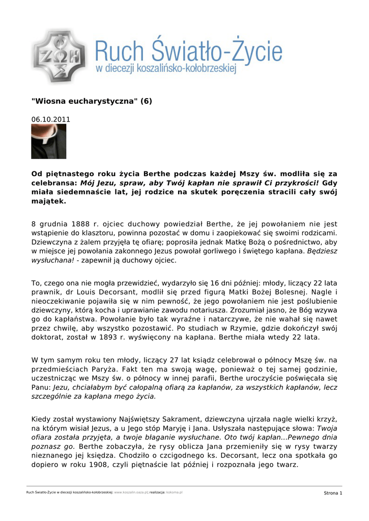 "Wiosna eucharystyczna" (6) 06.10.2011 Od piętnastego roku życia Berthe podczas każdej Mszy św. modliła się za celebransa: Mój Jezu, spraw, aby Twój kapłan nie sprawił Ci przykrości! Gdy miała siedemnaście lat, jej rodzice na skutek poręczenia stracili cały swój majątek. 8 grudnia 1888 r. ojciec duchowy powiedział Berthe, że jej powołaniem nie jest wstąpienie do klasztoru, powinna pozostać w domu i zaopiekować się swoimi rodzicami. Dziewczyna z żalem przyjęła tę ofiarę; poprosiła jednak Matkę Bożą o pośrednictwo, aby w miejsce jej powołania zakonnego Jezus powołał gorliwego i świętego kapłana. Będziesz wysłuchana! - zapewnił ją duchowy ojciec. To, czego ona nie mogła przewidzieć, wydarzyło się 16 dni później: młody, liczący 22 lata prawnik, dr Louis Decorsant, modlił się przed figurą Matki Bożej Bolesnej. Nagle i nieoczekiwanie pojawiła się w nim pewność, że jego powołaniem nie jest poślubienie dziewczyny, którą kocha i uprawianie zawodu notariusza. Zrozumiał jasno, że Bóg wzywa go do kapłaństwa. Powołanie było tak wyraźne i natarczywe, że nie wahał się nawet przez chwilę, aby wszystko pozostawić. Po studiach w Rzymie, gdzie dokończył swój doktorat, został w 1893 r. wyświęcony na kapłana. Berthe miała wtedy 22 lata. W tym samym roku ten młody, liczący 27 lat ksiądz celebrował o północy Mszę św. na przedmieściach Paryża. Fakt ten ma swoją wagę, ponieważ o tej samej godzinie, uczestnicząc we Mszy św. o północy w innej parafii, Berthe uroczyście poświęcała się Panu: Jezu, chciałabym być całopalną ofiarą za kapłanów, za wszystkich kapłanów, lecz szczególnie za kapłana mego życia. Kiedy został wystawiony Najświętszy Sakrament, dziewczyna ujrzała nagle wielki krzyż, na którym wisiał Jezus, a u Jego stóp Maryję i Jana. Usłyszała następujące słowa: Twoja ofiara została przyjęta, a twoje błaganie wysłuchane. Oto twój kapłan...Pewnego dnia poznasz go. Berthe zobaczyła, że rysy oblicza Jana przemieniły się w rysy twarzy nieznanego jej księdza. Chodziło o czcigodnego ks. Decorsant, lecz ona spotkała go dopiero w roku 1908, czyli piętnaście lat później i rozpoznała jego twarz. Ruch Światło-Życie w diecezji koszalińsko-kołobrzeskiej: www.koszalin.oaza.pl; realizacja: kokoma.pl Strona 1 za: Kongregacja ds. duchowieństwa. Adoracja eucharystyczna w intencji uświęcenia kapłanów i duchowe macierzyństwo. Ruch Światło-Życie w diecezji koszalińsko-kołobrzeskiej: www.koszalin.oaza.pl; realizacja: kokoma.pl Strona 2