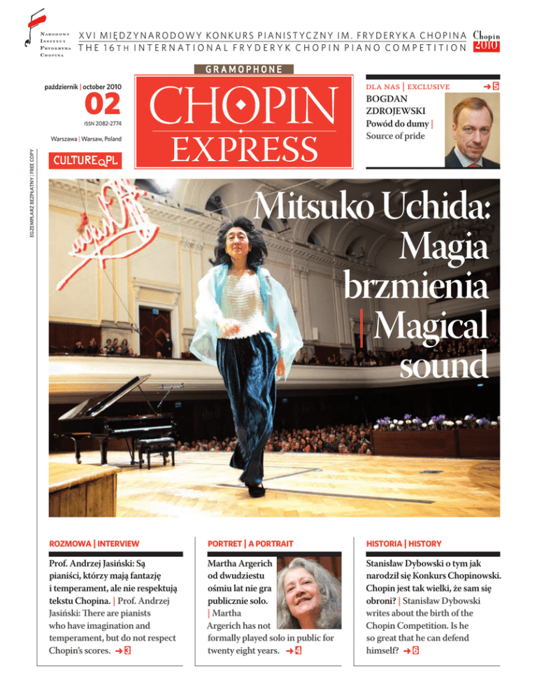 X V I M i ę d z y n a r o d o w y Ko n k u r s P i a n i s t yc z n y im . F r y d e r y k a C h o pi n a t h e 1 6 t h I n t e r n a t i o n a l F r y d e r y k C h o pi n P i a n o C o mp e t i t i o n dla nas | exclusive Bogdan zdrojewski Powód do dumy | Source of pride 02 październik | october 2010 issn 2082-2774 egzemplarz bezpłatny | free copy Warszawa | Warsaw, Poland >5 Mitsuko Uchida: Magia brzmienia | Magical sound rozmowa | interview portret | a portrait historia | history Prof. Andrzej Jasiński: Są pianiści, którzy mają fantazję i temperament, ale nie respektują tekstu Chopina. | Prof. Andrzej Jasiński: There are pianists who have imagination and temperament, but do not respect Chopin’s scores. > 3 Martha Argerich od dwudziestu ośmiu lat nie gra publicznie solo. | Martha Argerich has not formally played solo in public for twenty eight years. > 4 Stanisław Dybowski o tym jak narodził się Konkurs Chopinowski. Chopin jest tak wielki, że sam się obroni? | Stanisław Dybowski writes about the birth of the Chopin Competition. Is he so great that he can defend himself? > 6 archiwum AL chopin express rozmowa | interview I etap – kolejność uczestników | 1. stage – auditions order niedziela, 3 października | Sunday, 3rd October : ČČ 10.00, Peng Cheng He, China ČČ 10.30, Marianna Prjevalskaya, Spain ČČ 11.00, Esther Park, USA ČČ 11.30, Maiko Mine, Japan ČČ 12.00 – 12.30 PRZERWA | INTERMISSION ČČ 12.30, Miroslav Kultyshev, Russia ČČ 13.00, Takaya Sano, Japan ČČ 13.30, Hyung-Min Suh, Republic of Korea ČČ 14.00, Leonard Gilbert, Canada ČČ 17.00, Mariko Nogami, Japan ČČ 17.30, Daniil Trifonov, Russia ČČ 18.00, Eri Mantani, Japan ČČ 18.30, Anke Pan, Germany ČČ 19.00 – 19.30 PRZERWA | INTERMISSION ČČ 19.30, Antoine de Grolée, France ČČ 20.00, Sheng-Yuan Kuan, Chinese Taipei ČČ 20.30, Kotaro Nagano, Japan ČČ 21.00, Jayson Gillham, Australia poniedziałek, 4 października | Monday, 4th October : ČČ 10.00, Shih-Wei Huang, Chinese Taipei ČČ 10.30, Hélène Tysman, France ČČ 11.00, Anna Fedorova, Ukraine ČČ 11.30, Leonora Armellini, Italy ČČ 12.00 – 12.30 PRZERWA | INTERMISSION ČČ 12.30, Airi Katada, Japan ČČ 13.00, Aljoša Jurinić, Croatia ČČ 13.30, Fei-Fei Dong, China ČČ 14.00, Claire Huangci, USA ČČ 17.00, Da Sol Kim, Republic of Korea ČČ 17.30, Soo Jung Ann, Republic of Korea ČČ 18.00, Ching-Yun Hu, Chinese Taipei ČČ 18.30, Naomi Kudo, Japan/USA ČČ 19.00 – 19.30 PRZERWA | INTERMISSION ČČ 19.30, Nimrod David Pfeffer, Israel ČČ 20.00, Rina Sudo, Japan ČČ 20.30, Paweł Wakarecy, Poland ČČ 21.00, Yaron Kohlberg, Israel wtorek, 5 października | Tuesday, 5th October ČČ 10.00, Eri Goto, Japan ČČ 10.30, Joanna Różewska, Poland ČČ 11.00, Yuma Osaki, Japan ČČ 11.30, Evgeni Bozhanov, Bulgaria ČČ 12.00 – 12.30 PRZERWA | INTERMISSION ČČ 12.30, Fares Marek Basmadji, Poland/Syria ČČ 13.00, Wai-Ching Rachel Cheung, China ČČ 13.30, Ishay Shaer, Israel ČČ 14.00, Guillaume Masson, France ČČ 17.00, Jiayi Sun, China ČČ 17.30, Hannah Sun, Australia mecenas roku chopinowskiego main sponsor of the chopin year Uchem jurora |A judge’s ear »»Marcin Majchrowski, (Polskie Radio): W tym roku w jury zasiada dwanaście osób, w tym ośmioro laureatów Konkursów Chopinowskich. To Pana autorski wybór? Andrzej Jasiński: Nie, dyrekcja Narodowego Instytutu Fryderyka Chopina wysuwała propozycje zaproszeń do jury Konkursu. Zatwierdzała je natomiast grupa wybitnych profesorów pianistyki. Akceptuję ostateczny kształt jury, choć mogłoby być większe – im więcej głosów, tym łatwiej wszystkim uznać wyniki. Najlepsze byłoby małe jury, złożone z pięciu, sześciu laureatów pierwszej nagrody Konkursu, ale takie grono zebrać bardzo trudno. Pollini nigdy nie chciał być jurorem, Zimerman najpierw utrzymywał, że jest za młody, później, że trudno mu oceniać występy. Ohlsson ma w tym roku inne zobowiązania. Widziałbym w tym jury na przykład Bernarda Ringeissena, w swoim czasie idola naszej publiczności, albo Hiroko Nakamurę, pierwszą damę japońskiej pianistyki. Liczyłem na Vladimira Ashkenazy’ego, ale nie miał czasu na cały Konkurs. Można by wymieniać dalej. Cieszę się, że ci, którzy są tutaj – wybitni eksperci i artyści rozumiejący Chopina – przyjęli zaproszenia. »»Od 2000 roku zarzucono wyciąganie średniej arytmetycznej. Czy to rewolucyjna zmiana? Bardzo dobra, bo – upraszczając – polega na głosowaniu „TAK” lub „NIE”. Decyduje demokratyczna większość, jak w wyborach. Mamy jednak pomocniczy system punktacji, do którego można się odwołać w przypadkach ex aequo. Przypominam, że jurorzy nie mogą oceniać swoich uczniów, wtedy jest mniej głosów. Można wówczas sięgnąć do tej „zapasowej” punktacji. »»Tak jest do III etapu włącznie. W finale ma decydować ogólna liczba punktów, a więc nie będzie głosowania większościowego nad kolejnością laureatów? Podobał mi się ostatni system, w którym tak właśnie pracowaliśmy, ale zgodziłem się z wolą większości. Uzasadniano, że ktoś, kto zagrał bardzo dobrze koncert z orkiestrą, a był gorszy w poprzednich etapach, może zająć zbyt wysokie miejsce, i odwrotnie – gorszy występ w finale mógłby skutkować nieproporcjonalnie niskim miejscem. Zwracałem uwagę, że można przecież korzystać z notatek, ale przeważyła opinia, że tak będzie lepiej, i że dzięki temu jurorzy będą zmuszeni dokładniej słuchać każdego z etapów. »»Sposób interpretacji muzyki Chopina zmienia się. Czy na Konkursie widać to wyraźniej? Owszem, z biegiem lat zmieniają się wzorce interpretacji. Dawniej młodym pianistom w kraju zarzucano, że nie respektują wielkiej, polskiej tradycji chopinowskiej. Ale jeśli posłuchamy na przykład nagrań Paderewskiego, 2 | XVI Międzynarodowy Konkurs Pianistyczny im. Fryderyka Chopina | dzień drugi | Młody pianis