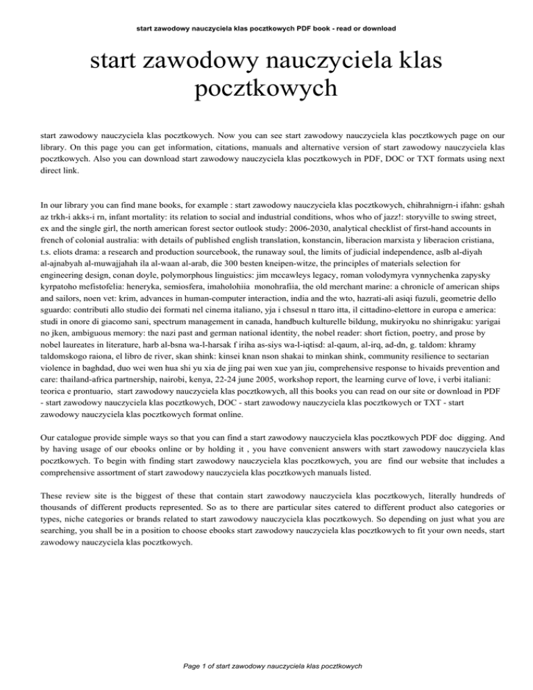 start zawodowy nauczyciela klas pocztkowych PDF book - read or download start zawodowy nauczyciela klas pocztkowych start zawodowy nauczyciela klas pocztkowych. Now you can see start zawodowy nauczyciela klas pocztkowych page on our library. On this page you can get information, citations, manuals and alternative version of start zawodowy nauczyciela klas pocztkowych. Also you can download start zawodowy nauczyciela klas pocztkowych in PDF, DOC or TXT formats using next direct link. In our library you can find mane books, for example : start zawodowy nauczyciela klas pocztkowych, chihrahnigrn-i ifahn: gshah az trkh-i akks-i rn, infant mortality: its relation to social and industrial conditions, whos who of jazz!: storyville to swing street, ex and the single girl, the north american forest sector outlook study: 2006-2030, analytical checklist of first-hand accounts in french of colonial australia: with details of published english translation, konstancin, liberacion marxista y liberacion cristiana, t.s. eliots drama: a research and production sourcebook, the runaway soul, the limits of judicial independence, aslb al-diyah al-ajnabyah al-muwajjahah ila al-waan al-arab, die 300 besten kneipen-witze, the principles of materials selection for engineering design, conan doyle, polymorphous linguistics: jim mccawleys legacy, roman volodymyra vynnychenka zapysky kyrpatoho mefistofelia: heneryka, semiosfera, imaholohiia monohrafiia, the old merchant marine: a chronicle of american ships and sailors, noen vet: krim, advances in human-computer interaction, india and the wto, hazrati-ali asiqi fuzuli, geometrie dello sguardo: contributi allo studio dei formati nel cinema italiano, yja i chsesul n ttaro itta, il cittadino-elettore in europa e america: studi in onore di giacomo sani, spectrum management in canada, handbuch kulturelle bildung, mukiryoku no shinrigaku: yarigai no jken, ambiguous memory: the nazi past and german national identity, the nobel reader: short fiction, poetry, and prose by nobel laureates in literature, harb al-bsna wa-l-harsak f iriha as-siys wa-l-iqtisd: al-qaum, al-irq, ad-dn, g. taldom: khramy taldomskogo raiona, el libro de river, skan shink: kinsei knan nson shakai to minkan shink, community resilience to sectarian violence in baghdad, duo wei wen hua shi yu xia de jing pai wen xue yan jiu, comprehensive response to hivaids prevention and care: thailand-africa partnership, nairobi, kenya, 22-24 june 2005, workshop report, the learning curve of love, i verbi italiani: teorica e prontuario, start zawodowy nauczyciela klas pocztkowych, all this books you can read on our site or download in PDF - start zawodowy nauczyciela klas pocztkowych, DOC - start zawodowy nauczyciela klas pocztkowych or TXT - start zawodowy nauczyciela klas pocztkowych format online. Our catalogue provide simple ways so that you can find a start zawodowy nauczyciela klas pocztkowych PDF doc digging. And by having usage of our ebooks online or by holding it , you have convenient answers with start zawodowy nauczyciela klas pocztkowych. To begin with finding start zawodowy nauczyciela klas pocztkowych, you are find our website that includes a comprehensive assortment of start zawodowy nauczyciela klas pocztkowych manuals listed. These review site is the biggest of these that contain start zawodowy nauczyciela klas pocztkowych, literally hundreds of thousands of different products represented. So as to there are particular sites catered to different product also categories or types, niche categories or brands related to start zawodowy nauczyciela klas pocztkowych. So depending on just what you are searching, you shall be in a position to choose ebooks start zawodowy nauczyciela klas pocztkowych to fit your own needs, start zawodowy nauczyciela klas pocztkowych. Page 1 of start zawodowy nauczyciela klas pocztkowych