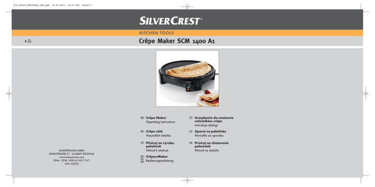 CV_66222_SCM1400A1_LB4.qxd 19.04.2011 16:27 Uhr Seite 1 KITCHEN TOOLS Crêpe Maker SCM 1400 A1 4 KOMPERNASS GMBH BURGSTRASSE 21 · D-44867 BOCHUM www.kompernass.com ID-Nr.: SCM 1400 A1-03/11-V1 IAN: 66222 Crêpe Maker Operating instructions Urządzenie do smażenia naleśników crêpe Instrukcja obsługi Crêpe sütő Használati utasítás Aparat za palačinke Navodila za uporabo Přístroj na výrobu palačinek Návod k obsluze Prístroj na zhotovenie palaciniek Návod na obsluhu Crêpes-Maker Bedienungsanleitung CV_66222_SCM1400A1_LB4.qxd 19.04.2011 16:27 Uhr Seite 4 SCM 1400 A1 1 2 3 4 0 9 8 7 5 6 IB_66222_SCM1400A1_LB4 19.04.2011 15:20 Uhr Content Seite 1 Page Intended Use 2 Safety instructions 2 Items supplied 2 Technical data 2 Description of the appliance 3 Before the First Use 3 Baking crêpes 3 Cleaning and care 4 Storage 5 Recipes 5 Basic crêpe recipe . . . . . . . . . . . . . . . . . . . . . . . . . . . . . . . . . . . . . . . . . . . . . . . . . . . . . . . . . . .5 Basic galette recipe . . . . . . . . . . . . . . . . . . . . . . . . . . . . . . . . . . . . . . . . . . . . . . . . . . . . . . . . . .5 Crêpes with sugar and lemon . . . . . . . . . . . . . . . . . . . . . . . . . . . . . . . . . . . . . . . . . . . . . . . . . .5 Crêpes Normandy style . . . . . . . . . . . . . . . . . . . . . . . . . . . . . . . . . . . . . . . . . . . . . . . . . . . . . .6 Ham and egg galette . . . . . . . . . . . . . . . . . . . . . . . . . . . . . . . . . . . . . . . . . . . . . . . . . . . . . . . .6 Galettes with smoked salmon . . . . . . . . . . . . . . . . . . . . . . . . . . . . . . . . . . . . . . . . . . . . . . . . . .6 Disposal 7 Warranty and Service 7 Importer 7 Read the operating instructions carefully before using the device for the first time and preserve this booklet for later reference. Pass this manual on to whoever might acquire the device at a future date. -1- IB_66222_SCM1400A1_LB4 19.04.2011 15:20 Uhr CRÊPE MAKER Seite 2 To avoid the risks of fire or injury: • Ensure that the switched-ondevice is at all times located at a minimumdistance of 50 cm from walls, furniture and other objects. • Baked foods can burn! Thus, DO NOT place the appliance under inflammable objects, especially curtains and drapes. • Never leave the appliance unattended when it is in use. • Do not use an external timing switch or a separate remote control system to operate the appliance. • This appliance is not intended for use by individuals (including children) with restricted physical, physiological or intellectual abilities or deficiences in experience and/or knowledge unless they are supervised by a person responsible for their safety or receive from this person instruction in how the appliance is to be used. • Children should be supervised to ensure that they do not play with the appliance. Intended Use This appliance is intended exclusively for the baking of crêpes. Use this crêpe maker only in domestic households and indoors. This appliance is not designed for commercial or industrial applications. Safety instructions To avoid potentially fatal electric shocks: • Ensure that the appliance never comes into contact with water when the plug is inserted into a power socket, especially if it is being used in the kitchen and close to the sink. • Make sure that the power cable never becomes wet or damp during operation. Lay the cable so that it cannot be trapped or otherwise damaged. • Always remove the power plug from the wall socket after use. • To avoid potentially fatal risks, arrange for a defective power plug and/or cable to be replaced at once by qualified technicians or our Customer Service Department. • Do not operate the appliance if it has sustained a fall or is damaged. Arrange for the appliance to be checked and, if necessary, repaired by qualified technicians. This symbol on the appliance warns you of the risk of burns caused by hot surfaces. Important! Hot surfaces! Items supplied Crêpe Maker Pastry spreader Crêpe turner Operating instructions Technical data Voltage : 220-240 V~50 Hz/60 Hz Power consumption : 1400 W -2- IB_66222_SCM1400A1_LB4 19.04.2011 15:20 Uhr Description of the appliance Seite 3 Note: On the first usage, the generation of light smoke and a slight smell can occur, this is due to production residues. This is completely normal and is not dangerous. Provide for sufficient ventilation, for example, open a window. 1 Baking plate 2 Power cable with power plug 3 Heating elements 4 Base 5 Crêpe turner 6 Pastry spreader 7 Thermostat 8 red control lamp 9 green control lamp “Ready" 0 Cable winder with plug storage • Place the thermostat 7 back to “0” and remove the plug 2 from the mains power socket. The control lamps 8 9 extinguish. • Allow the appliance to cool down and once again wipe the baking plate 1 with a moist cloth. Before the First Use The appliance is now ready for use. • Remove all packaging materials from the appliance. • Wipe the baking plate 1 with a moist cloth. • Place the base 4 on a heat resistant and level surface. • Position the baking plate 1 on the base 4 so that it sits well and is stable. • Connect the plug 2 to a mains power socket. The control lamp 8 glows. Baking crêpes 1. Insert the power plug 2 into a wall socket. The control lamp 8 glows. 2. Place the thermostat 7 at the desired heating level. The higher the temperature level, the darker the crêpes. Wait until the green control lamp "Ready" 9 glows. This indicates that the appliance is heated up. 3. Place a scoop full of pastry onto the baking plate 1. Note: If you set the thermostat 7 at "0" the green control lamp "Ready" 9 glows constantly. In this way you can check that the green control lamp "Ready" 9 is functioning. The appliance is not heated up in this position. Note: You can determine the browning of the crêpe with the help of the thermostat 7 or with the baking time. • Adjust the thermostat 7 to MAX and allow the appliance to heat 