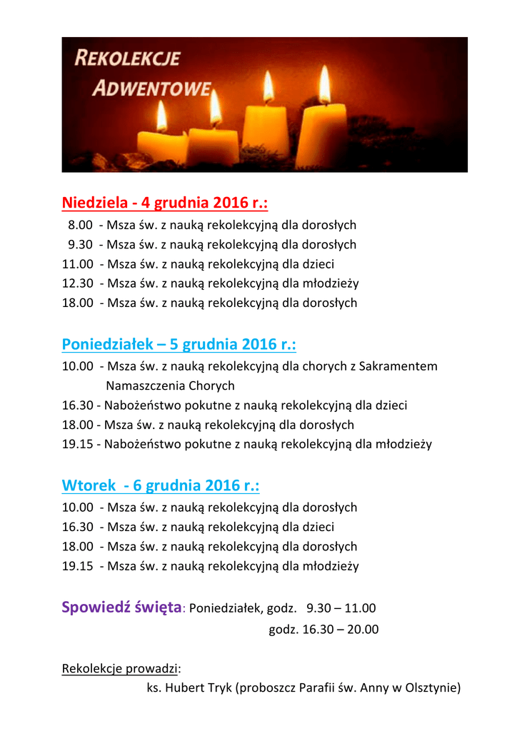 Niedziela-4grudnia2016r.: 8.00-Mszaśw.znaukąrekolekcyjnądladorosłych 9.30-Mszaśw.znaukąrekolekcyjnądladorosłych 11.00-Mszaśw.znaukąrekolekcyjnądladzieci 12.30-Mszaśw.znaukąrekolekcyjnądlamłodzieży 18.00-Mszaśw.znaukąrekolekcyjnądladorosłych Poniedziałek–5grudnia2016r.: 10.00-Mszaśw.znaukąrekolekcyjnądlachorychzSakramentem NamaszczeniaChorych 16.30-Nabożeństwopokutneznaukąrekolekcyjnądladzieci 18.00-Mszaśw.znaukąrekolekcyjnądladorosłych 19.15-Nabożeństwopokutneznaukąrekolekcyjnądlamłodzieży Wtorek-6grudnia2016r.: 10.00-Mszaśw.znaukąrekolekcyjnądladorosłych 16.30-Mszaśw.znaukąrekolekcyjnądladzieci 18.00-Mszaśw.znaukąrekolekcyjnądladorosłych 19.15-Mszaśw.znaukąrekolekcyjnądlamłodzieży Spowiedźświęta:Poniedziałek,godz.9.30–11.00 godz.16.30–20.00 Rekolekcjeprowadzi: ks.HubertTryk(proboszczParafiiśw.AnnywOlsztynie)