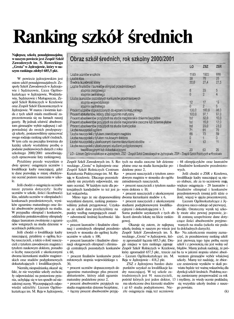Ranking szkół średnich Najlepszą szkołą ponadgimnazjalną w naszym powiecie jest Zespół Szkół Zawodowych im. S. Roweckiego „Grota" w Jędrzejowie, który w na szym rankingu zdobył 685,5 pkt. W powiecie jędrzejowskim jest osiem szkół ponadgimnazjalnych: Ze społy Szkół Zawodowych w Jędrzejo wie i Sędziszowie, Licea Ogólno kształcące w Jędrzejowie, Wodzisła wiu, Sędziszowie i Małogoszczu, Ze spół Szkół Rolniczych w Krzelowie oraz Zespół Szkół Ekonomicznych w Jędrzejowie. W marcu i kwietniu każ da z tych szkół miała możliwość za prezentowania się na łamach naszej gazety. By jednak ułatwić absolwen tom gimnazjów wybór najlepszej i od powiedniej do swoich predyspozy cji szkoły, postanowiliśmy opracować swego rodzaju ranking szkół s'rednich. W tym celu na początku kwietnia do każdej szkoły wysłaliśmy prośbę o podanie podstawowych danych z roku szkolnego 2000/2001 umożliwiają cych opracowanie listy rankingowej. Pytaliśmy przede wszystkim o dwie sprawy: osiągnięcia uczniów i kwalifikacje kadry nauczającej, gdyż te dane pozwalają w miarę obiektyw nie ocenić poziom nauczania w szko le. Jeśli chodzi o osiągnięcia uczniów nasze pytania dotyczyły: liczby uczniów w szkole, ilości i liczebnos'ci klas, udziału uczniów w olimpiadach i konkursach przedmiotowych, wyni ków egzaminu maturalnego oraz ilo ści absolwentów przyjętych na studia. W przypadku olimpiad i konkursów, oddzielnie potraktowaliśmy olimpiady dające laureatom zwolnienie z egzami nów wstępnych na studia dziennie w uczelniach publicznych. Jeśli chodzi o kwalifikacje kadry nauczającej, pytaliśmy o ogólną licz bę nauczycieli, a także o ilość nauczy cieli z tytułem zawodowym magistra i tytułem naukowym doktora, ponadto o liczbę nauczycieli z ukończonymi dwoma kierunkami studiów magister skich oraz studiów podyplomowych dokształcających i kwalifikacyjnych. Niemiłą niespodzianką okazał się fakt, że nie wszystkie szkoły zechcia ły odpowiedzieć na postawione pyta nia, uchylając się w ten sposób od nie zależnej oceny. Wyczerpujących odpo wiedzi udzieliły: Liceum Ogólno kształcące im. M. Reja w Jędrzejowie, Zespół Szkól Zawodowych im. S. Ro- tych na studia zaoczne lub dzienne - 44 olimpijczyków oraz laureatów weckiego „Grota" w Jędrzejowie oraz płatne oraz na studia licencjackie po- i finalistów konkursów przedmiotoZespół Szkół Rolniczych Centrum dzielone przez 2, wych. Kształcenia Praktycznego im. M. Ra- • procent nauczycieli z tytułem zawoJeśli chodzi o ZSR z Krzelowa, tają w Krzelowie. Dlaczego pozostałe dowym magistra w stosunku do ogółu kwalifikacje kadry nauczającej są nieszkoły nie przysłały odpowiedzi, nie zatrudnionych nauczycieli, co słabsze, ale za to uczniowie mają nam oceniać. W każdym razie dla po- • procent nauczycieli z tytułem nauko- większe osiągnięcia - 29 laureatów i tencjalnych kandydatów to też jest ja- wym doktora x 10, finalistów olimpiad i konkursów kaś wskazówka. • procent nauczycieli z ukończonymi przedmiotowych (mniej jeśli idzie o Mimo tego że nie dysponowaliśmy dwoma kierunkami studiów x 6, ilość, więcej w ujęciu procentowym), wszystkimi danymi, ranking postano- • procent nauczycieli z ukończonymi Liceum Ogólnokształcące z Jęwiliśmy jednak przygotować. Uzyska- studiami podyplomowymi kwalifika- drzejowa nieco odstaje od pierwsyej :. ne ze szkół dane przeliczyliśmy na cyjnymi i dokształcającymi x 3. dwójki. Ostateczny wynik tej szkopunkty według następujących zasad: Suma punktów uzyskanych z tych ob- ly może ulec pewnej poprawie, je• odwrotność średniej liczebności kla- liczeń dawała lokatę na liście rankin- śli zostaną uzupełnione dane dotysyxl00, gowej. czące ilości absolwentów przyjmo• procent laureatów i finalistów elimiOkazuje się zatem, że najlepszą wanych na studia (szkoła nie podanacj i centralnych olimpiad przedmio- szkołą średnią w naszym po wiecie jest ła dokładnych danych). towych w stosunku do ogólnej liczby Zespół Szkół Zawodowych im. S. Ro- Na zakończenie musimy zaznauczniów w szkole x 100, weckiego „Grota" w Jędrzejowie, któ- czyć, że przedstawiony ranking szkól • procent laureatów i finalistów elimi- ry zgromadził łącznie 685,5 pkt. Dru- jest pierwszą tego typu próbą oceny nacji okręgowych olimpiad i elimina- gie miejsce w tym rankingu zajmuje szkół i z pewnością nie jest wolny od cji centralnych pozostałych konkursów Zespół Szkół Rolniczych w Krzelowie, błędów. Mamy jednak nadzieję, że próx 60, który zgromadził 657,5 pkt., trzecie zaś ba ta w jakimś stopniu ułatwi absol• procent finalistów konkursów przed- - Liceum Ogólnokształcące im. M. wentom gimnazjów wybór właściwej młotowych stopnia wojewódzkiego x Reja w Jędrzejowie - 418,2 pkt. szkoły. Mamy też nadzieję, że zbior30, ZSZ z Jędrzejowa bardzo dużo cze zestawienie wyników w skali po• procent uczniów dopuszczonych do punktów uzyskał za kwalifikacje ka- wiatu będzie też ważną wskazówką dla egzaminu maturalnego plus procent dry nauczającej. W tej szkole za- dyrekcji szkół średnich. Podobną oceabiturientów, którzy zdali egzamin trudnionych jest 91 nauczycieli, nę zamierzamy przeprowadzić za rok maturalny podzielone przez 2, pośród których jest jeden doktor, 13 i myślimy, że wtedy ocenie poddadzą • procent absolwentów przyjętych na ma ukończone dwa kierunki studiów się wszystkie szkoły średnie z naszestudia magisterskie dzienne bezpłatne, i aż 63 studia podyplomowe. Nie- go powiatu. • łączny procent absolwentów przyję- złe osiągnięcia mają też uczniowie (k)