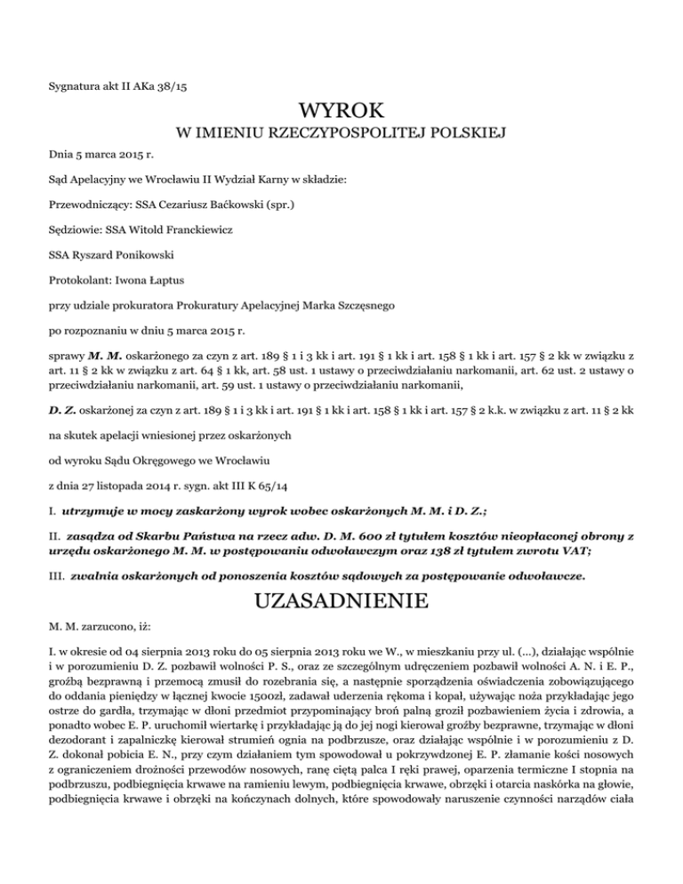 Sygnatura akt II AKa 38/15 WYROK W IMIENIU RZECZYPOSPOLITEJ POLSKIEJ Dnia 5 marca 2015 r. Sąd Apelacyjny we Wrocławiu II Wydział Karny w składzie: Przewodniczący: SSA Cezariusz Baćkowski (spr.) Sędziowie: SSA Witold Franckiewicz SSA Ryszard Ponikowski Protokolant: Iwona Łaptus przy udziale prokuratora Prokuratury Apelacyjnej Marka Szczęsnego po rozpoznaniu w dniu 5 marca 2015 r. sprawy M. M. oskarżonego za czyn z art. 189 § 1 i 3 kk i art. 191 § 1 kk i art. 158 § 1 kk i art. 157 § 2 kk w związku z art. 11 § 2 kk w związku z art. 64 § 1 kk, art. 58 ust. 1 ustawy o przeciwdziałaniu narkomanii, art. 62 ust. 2 ustawy o przeciwdziałaniu narkomanii, art. 59 ust. 1 ustawy o przeciwdziałaniu narkomanii, D. Z. oskarżonej za czyn z art. 189 § 1 i 3 kk i art. 191 § 1 kk i art. 158 § 1 kk i art. 157 § 2 k.k. w związku z art. 11 § 2 kk na skutek apelacji wniesionej przez oskarżonych od wyroku Sądu Okręgowego we Wrocławiu z dnia 27 listopada 2014 r. sygn. akt III K 65/14 I. utrzymuje w mocy zaskarżony wyrok wobec oskarżonych M. M. i D. Z.; II. zasądza od Skarbu Państwa na rzecz adw. D. M. 600 zł tytułem kosztów nieopłaconej obrony z urzędu oskarżonego M. M. w postępowaniu odwoławczym oraz 138 zł tytułem zwrotu VAT; III. zwalnia oskarżonych od ponoszenia kosztów sądowych za postępowanie odwoławcze. UZASADNIENIE M. M. zarzucono, iż: I. w okresie od 04 sierpnia 2013 roku do 05 sierpnia 2013 roku we W., w mieszkaniu przy ul. (...), działając wspólnie i w porozumieniu D. Z. pozbawił wolności P. S., oraz ze szczególnym udręczeniem pozbawił wolności A. N. i E. P., groźbą bezprawną i przemocą zmusił do rozebrania się, a następnie sporządzenia oświadczenia zobowiązującego do oddania pieniędzy w łącznej kwocie 1500zł, zadawał uderzenia rękoma i kopał, używając noża przykładając jego ostrze do gardła, trzymając w dłoni przedmiot przypominający broń palną groził pozbawieniem życia i zdrowia, a ponadto wobec E. P. uruchomił wiertarkę i przykładając ją do jej nogi kierował groźby bezprawne, trzymając w dłoni dezodorant i zapalniczkę kierował strumień ognia na podbrzusze, oraz działając wspólnie i w porozumieniu z D. Z. dokonał pobicia E. N., przy czym działaniem tym spowodował u pokrzywdzonej E. P. złamanie kości nosowych z ograniczeniem drożności przewodów nosowych, ranę ciętą palca I ręki prawej, oparzenia termiczne I stopnia na podbrzuszu, podbiegnięcia krwawe na ramieniu lewym, podbiegnięcia krwawe, obrzęki i otarcia naskórka na głowie, podbiegnięcia krwawe i obrzęki na kończynach dolnych, które spowodowały naruszenie czynności narządów ciała i rozstrój zdrowia trwające nie dłużej niż dni siedem, a u pokrzywdzonej A. N. obrzęk okolicy potylicznej prawej, pęknięcie korony zęba 11, podbiegnięcia krwawe na przedramieniu prawym i kończynach dolnych, które spowodowały naruszenie czynności narządów ciała i rozstrój zdrowia trwające nie dłużej niż dni siedem, przy czym zarzuconego czynu dopuścił się w warunkach powrotu przestępstwa będąc uprzednio skazany wyrokiem Sądu Okręgowego we Wrocławiu sygn. akt III K 247/06 z dnia 8 III 2007 r. za czyny z art. 156§3 kk i art. 157§2 kk na karę pięciu lat pozbawienia wolności, która odbywał w okresie od 18 V 2006 r. do 17 XI 2008 r. i od 31 VII 2010 r. do 23 II 2011 r. tj. o przestępstwo z art. 189 § 1 i 3 kk i art. 191 § 1 kk i art. 158 § 1 kk i 157 § 2 kk w zw. z art 11 § 2 kk w zw. z art. 64 § 1 kk; II. w dniu 04 sierpnia 2013r. we W. na ul. (...) wbrew przepisom ustawy o przeciwdziałaniu narkomanii, udzielił A. N., E. P. P. S. i nieustalonemu mężczyźnie środek psychotropowy w postaci amfetaminy, tj. o czyn z art. 58 ust.1 ustawy o przeciwdziałaniu narkomanii; III. w dniu 05 sierpnia 2013 roku we W. przy ul. (...), posiadał wbrew przepisom Ustawy o przeciwdziałaniu narkomanii środki psychotropowe w postaci amfetaminy, w ilości 31,1 grama netto, tj. o czyn z art. 62 ust. 2 Ustawy o przeciwdziałaniu narkomanii; IV. w dniu 03 sierpnia 2013 roku we W. wbrew przepisom ustawy o przeciwdziałaniu narkomanii, w celu osiągnięcia korzyści majątkowej udzielił E. P. środek psychotropowy w postaci amfetaminy w ilości 1 grama za kwotę 35 złotych, tj. o czyn z art. 59 ust.1 ustawy o przeciwdziałaniu narkomanii; D. Z. została oskarżona o to, że: V. w okresie od 4 sierpnia 2013 roku do 5 sierpnia 2013 roku we W., w mieszkaniu przy ul. (...), działając wspólnie i w porozumieniu M. M. pozbawiła wolności P. S., oraz ze szczególnym udręczeniem pozbawiła wolności A. N. i E. P., groźbą bezprawną i przemocą zmusiła do rozebrania się, a następnie sporządzenia oświadczenia zobowiązującego do oddania pieniędzy w łącznej kwocie 1500zł na rzecz M. M., zadawała uderzenia rękoma i kopała, nożem używając przemocy obcięła włosy E. P., używając noża przykładając jego ostrze do gardła, trzymając w dłoni przedmiot przypominający broń palną groziła pozbawieniem życia i zdrowia, oraz działając wspólnie i w porozumieniu z M. M. dokonała pobicia A. N. i E. P., powodując u pokrzywdzonej E. P. złamanie kości nosowych z ograniczeniem drożności przewodów nosowych, ranę ciętą palca I ręki prawej, oparzenia termiczne I stopnia na podbrzuszu, podbiegnięcia krwawe na ramieniu lewym, podbiegnięcia krwawe, obrzęki i otarcia naskórka na głowie, podbiegnięcia krwawe i obrzęki na kończynach dolnych, które spowodowały naruszenie czynności narządów ciała i rozstrój zdrowia trwające nie dłużej niż dni siedem, a u pokrzywdzonej A. N. obrzęk okolicy potylicznej prawej, pęknięcie korony zęba 11, podbiegnięcia krwawe na przedramieniu prawym i kończynach dolnych, które spowodowały naruszenie czynności narządów ciała i rozstrój zdrowia trwające nie dłużej niż dni siedem, tj. o przestępstwo z art.189 § 1 i 3 kk i art. 191§1 kk i art. 158 § 