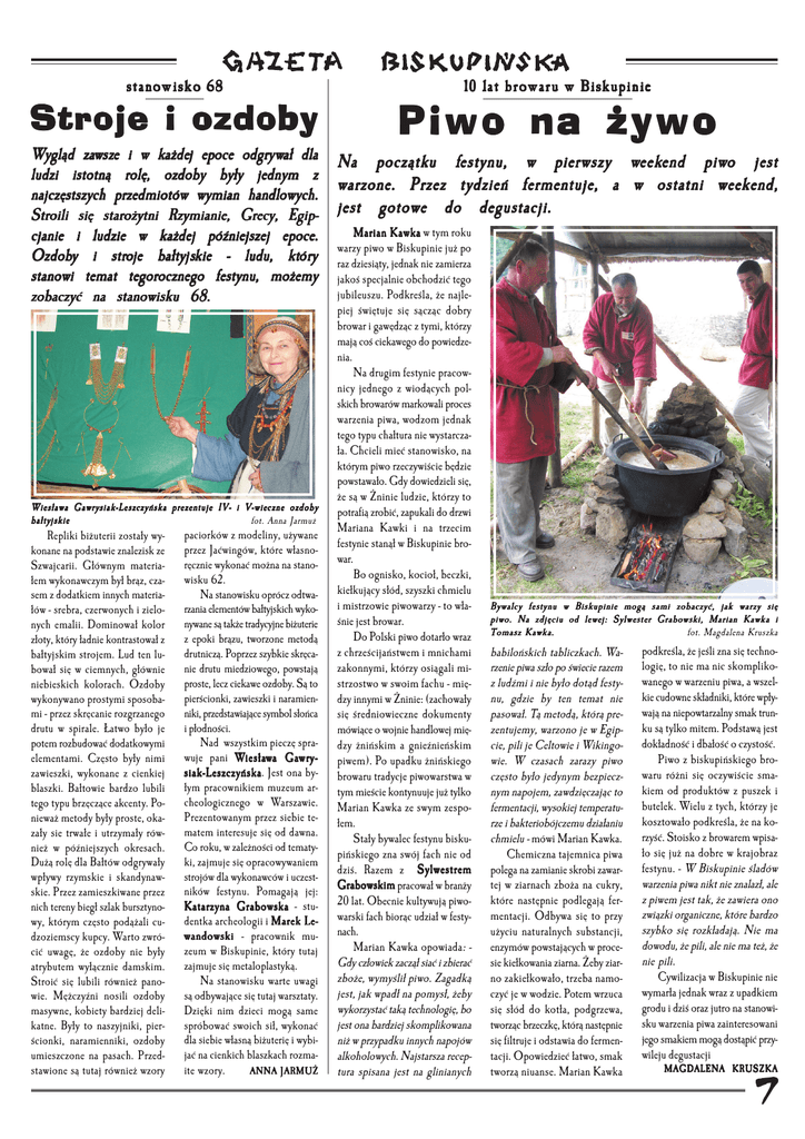 stanowisko 68 10 lat browaru w Biskupinie Stroje i ozdoby Piwo na żywo zaw szee i w kkażde ażdejj epoce odgr odgryw ywał Wygląd za wsz ażde yw ał dla ludzi istotną rolę, ozdoby były jednym z najczęstszych przedmiotów wymian handlowych. Stroili się starożytni Rzymianie, Grecy, Egipcjanie i ludzie w każdej późniejszej epoce. Ozdobyy i str strooje bałt bałtyyjs jskie któr óryy kie - ludu, kt ór Ozdob stanowi temat tegorocznego festynu, możemy zobaczyć na stanowisku 68. początkuu ffest estynu, pierw eekend piwoo jest N a początk est ynu, w pier w szy wweek eek end piw warzone. Przez tydzień fermentuje, a w ostatni weekend, jest gotowe do degustacji. Wiesława Gawrysiak-Leszczyńska prezentuje IV- i V-wieczne ozdoby bałtyjskie fot. Anna Jarmuż Repliki biżuterii zostały wykonane na podstawie znalezisk ze Szwajcarii. Głównym materiałem wykonawczym był brąz, czasem z dodatkiem innych materiałów - srebra, czerwonych i zielonych emalii. Dominował kolor złoty, który ładnie kontrastował z bałtyjskim strojem. Lud ten lubował się w ciemnych, głównie niebieskich kolorach. Ozdoby wykonywano prostymi sposobami - przez skręcanie rozgrzanego drutu w spirale. Łatwo było je potem rozbudować dodatkowymi elementami. Często były nimi zawieszki, wykonane z cienkiej blaszki. Bałtowie bardzo lubili tego typu brzęczące akcenty. Ponieważ metody były proste, okazały sie trwałe i utrzymały również w późniejszych okresach. Dużą rolę dla Bałtów odgrywały wpływy rzymskie i skandynawskie. Przez zamieszkiwane przez nich tereny biegł szlak bursztynowy, którym często podążali cudzoziemscy kupcy. Warto zwrócić uwagę, że ozdoby nie były atrybutem wyłącznie damskim. Stroić się lubili również panowie. Mężczyźni nosili ozdoby masywne, kobiety bardziej delikatne. Były to naszyjniki, pierścionki, naramienniki, ozdoby umieszczone na pasach. Przedstawione są tutaj również wzory paciorków z modeliny, używane przez Jaćwingów, które własnoręcznie wykonać można na stanowisku 62. Na stanowisku oprócz odtwarzania elementów bałtyjskich wykonywane są także tradycyjne biżuterie z epoki brązu, tworzone metodą drutniczą. Poprzez szybkie skręcanie drutu miedziowego, powstają proste, lecz ciekawe ozdoby. Są to pierścionki, zawieszki i naramienniki, przedstawiające symbol słońca i płodności. Nad wszystkim pieczę sprawa Ga wr wuje pani Wiesła iesław Gawr wryy siak-Leszczyńska siak-Leszczyńska. Jest ona byłym pracownikiem muzeum archeologicznego w Warszawie. Prezentowanym przez siebie tematem interesuje się od dawna. Co roku, w zależności od tematyki, zajmuje się opracowywaniem strojów dla wykonawców i uczestników festynu. Pomagają jej: Katarzyna Grabowska - studentka archeologii i Marek Lewandowski - pracownik muzeum w Biskupinie, który tutaj zajmuje się metaloplastyką. Na stanowisku warte uwagi są odbywające się tutaj warsztaty. Dzięki nim dzieci mogą same spróbować swoich sił, wykonać dla siebie własną biżuterię i wybijać na cienkich blaszkach rozmaANNA JARMUŻ ite wzory. Marian Kawka w tym roku warzy piwo w Biskupinie już po raz dziesiąty, jednak nie zamierza jakoś specjalnie obchodzić tego jubileuszu. Podkreśla, że najlepiej świętuje się sącząc dobry browar i gawędząc z tymi, którzy mają coś ciekawego do powiedzenia. Na drugim festynie pracownicy jednego z wiodących polskich browarów markowali proces warzenia piwa, wodzom jednak tego typu chałtura nie wystarczała. Chcieli mieć stanowisko, na którym piwo rzeczywiście będzie powstawało. Gdy dowiedzieli się, że są w Żninie ludzie, którzy to potrafią zrobić, zapukali do drzwi Mariana Kawki i na trzecim festynie stanął w Biskupinie browar. Bo ognisko, kocioł, beczki, kiełkujący słód, szyszki chmielu i mistrzowie piwowarzy - to właśnie jest browar. Do Polski piwo dotarło wraz z chrześcijaństwem i mnichami zakonnymi, którzy osiągali mistrzostwo w swoim fachu - między innymi w Żninie: (zachowały się średniowieczne dokumenty mówiące o wojnie handlowej między żnińskim a gnieźnieńskim piwem). Po upadku żnińskiego browaru tradycje piwowarstwa w tym mieście kontynuuje już tylko Marian Kawka ze swym zespołem. Stały bywalec festynu biskupińskiego zna swój fach nie od dziś. Razem z Sylwestrem Grabowskim pracował w branży 20 lat. Obecnie kultywują piwowarski fach biorąc udział w festynach. Marian Kawka opowiada: Gdy człowiek zaczął siać i zbierać zboże, wymyślił piwo. Zagadką jest, jak wpadł na pomysł, żeby wykorzystać taką technologię, bo jest ona bardziej skomplikowana niż w przypadku innych napojów alkoholowych. Najstarsza receptura spisana jest na glinianych Bywalcy festynu w Biskupinie mogą sami zobaczyć, jak warzy się piwo. Na zdjęciu od lewej: Sylwester Grabowski, Marian Kawka i Tomasz Kawka. fot. Magdalena Kruszka babilońskich tabliczkach. Warzenie piwa szło po świecie razem z ludźmi i nie było dotąd festynu, gdzie by ten temat nie pasował. Tą metodą, którą prezentujemy, warzono je w Egipcie, pili je Celtowie i Wikingowie. W czasach zarazy piwo często było jedynym bezpiecznym napojem, zawdzięczając to fermentacji, wysokiej temperaturze i bakteriobójczemu działaniu chmielu - mówi Marian Kawka. Chemiczna tajemnica piwa polega na zamianie skrobi zawartej w ziarnach zboża na cukry, które następnie podlegają fermentacji. Odbywa się to przy użyciu naturalnych substancji, enzymów powstających w procesie kiełkowania ziarna. Żeby ziarno zakiełkowało, trzeba namoczyć je w wodzie. Potem wrzuca się słód do kotła, podgrzewa, tworząc brzeczkę, którą następnie się filtruje i odstawia do fermentacji. Opowiedzieć łatwo, smak tworzą niuanse. Marian Kawka podkreśla, że jeśli zna się technologię, to nie ma nic skomplikowanego w warzeniu piwa, a wszelkie cudowne składniki, które wpływają na niepowtarzalny smak trunku są tylko m