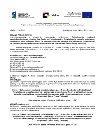 Fundusze Europejskie dla rozwoju regionu łódzkiego Projekt współfinansowany przez Unię Europejską z Europejskiego Funduszu Rozwoju Regionalnego IGKM.271.6.2015 Poddębice, dnia 24 luty 2015 roku ZMIANA TREŚCI SIWZ (1) dot.:postępowania o udzielenie zamówienia publicznego: Dokończenie realizacji przedsięwzięcia pn. „Kraina Bez Barier w Poddębicach – Rewitalizacja zespołu pałacowo parkowego oraz nabrzeża Neru” w zakresie dostawy pojazdu inwalidzkiego (samochodu) do przewozu osób niepełnosprawnych w plener dla potrzeb Domu Pracy Twórczej Gmina Poddębice działając na podstawie art. 38 ust 4 ustawy z dnia 29 stycznia 2004 roku Prawo zamówień publicznych (Dz. U. z 2013 r. poz. 907 z późn. zm.) Gmina Poddębice zawiadamia o zmianie treści SIWZ Nazwa (firma) i adres zamawiającego: Nazwa zamawiającego: Gmina Poddębice Ulica: Łódzka 17/21 Kod Miejscowość: 99-200 Poddębice tel ,43 678 25 80 fax 43 678 39 95 Strona WWW: www.gmina.poddebice.pl E-mail: [email protected] Godziny urzędowania: od poniedziałku do piątku od 8.00-16.00 I. Dotyczy części X. Opis sposobu przygotowania ofert, Pkt 3. Sposób zaadresowania oferty: W SIWZ jest: 2) Koperta / opakowanie zawierające ofertę winno być zaadresowane do zamawiającego na adres podany w punkcie I niniejszej specyfikacji i opatrzone nazwą, dokładnym adresem wykonawcy oraz oznaczone w sposób następujący: Oferta – Dokończenie realizacji przedsięwzięcia pn. „Kraina Bez Barier w Poddębicach – Rewitalizacja zespołu pałacowo - parkowego oraz nabrzeża Neru” w zakresie dostawy pojazdu inwalidzkiego (samochodu) do przewozu osób niepełnosprawnych w plener dla potrzeb Domu Pracy Twórczej „Nie otwierać przed 17 marca 2015 roku, godz. 11.00” W SIWZ powinno być: 2) Koperta / opakowanie zawierające ofertę winno być zaadresowane do zamawiającego na adres podany w punkcie I niniejszej specyfikacji i opatrzone nazwą, dokładnym adresem wykonawcy oraz oznaczone w sposób następujący: Oferta – Dokończenie realizacji przedsięwzięcia pn. „Kraina Bez Barier w Poddębicach – Rewitalizacja zespołu pałacowo - parkowego oraz nabrzeża Neru” w zakresie dostawy pojazdu inwalidzkiego (samochodu) do przewozu osób niepełnosprawnych w plener dla potrzeb Domu Pracy Twórczej „Nie otwierać przed 19 marca 2015 roku, godz. 11.00” II. Dotyczy części XI. Miejsce i termin składania i otwarcia ofert. W SIWZ jest: XI. Miejsce i termin składania i otwarcia ofert. 1. Oferty należy składać do dnia: 17 marca 2015 r. do godz. 10:45 w siedzibie zamawiającego: Urząd Miejski w Poddębicach ul. Łódzka 17/21 99-200 Poddębice Pokój nr: 116 2.Oferty zostaną otwarte dnia: 17 marca 2015 r. o godz. 11:00 w siedzibie zamawiającego Urząd Miejski w Poddębicach ul. Łódzka 17/21 99-200 Poddębice Pokój nr: 201 W SIWZ powinno być: XI. Miejsce i termin składania i otwarcia ofert. 1. Oferty należy składać do dnia: 19 marca 2015 r. do godz. 10:45 w siedzibie zamawiającego: Urząd Miejski w Poddębicach ul. Łódzka 17/21 99-200 Poddębice Pokój nr: 116 2.Oferty zostaną otwarte dnia: 19 marca 2015 r. o godz. 11:00 w siedzibie zamawiającego Urząd Miejski w Poddębicach ul. Łódzka 17/21 99-200 Poddębice Pokój nr: 201 III. Dotyczy części XII. Opis sposobu obliczenia ceny W SIWZ częśc XII. Opis sposobu obliczenia ceny dodaje się pkt 9 o następującym brzmieniu: 9. Jeżeli złożono ofertę, której wybór prowadziłby do powstania obowiązku podatkowego Zamawiającego zgodnie z przepisami o podatku od towarów i usług w zakresie dotyczącym wewnątrzwspólnotowego nabycia towarów, Zamawiający w celu oceny takiej oferty doliczy do przedstawionej w niej ceny podatek od towarów i usług, który miałby obowiązek wpłacić zgodnie z obowiązującymi przepisami. Zamawiający informuje, że powyższe zmiany staje się integralną częścią specyfikacji istotnych warunków zamówienia i będą wiążące przy składaniu ofert. Burmistrz Poddębic (-) Piotr Sęczkowski