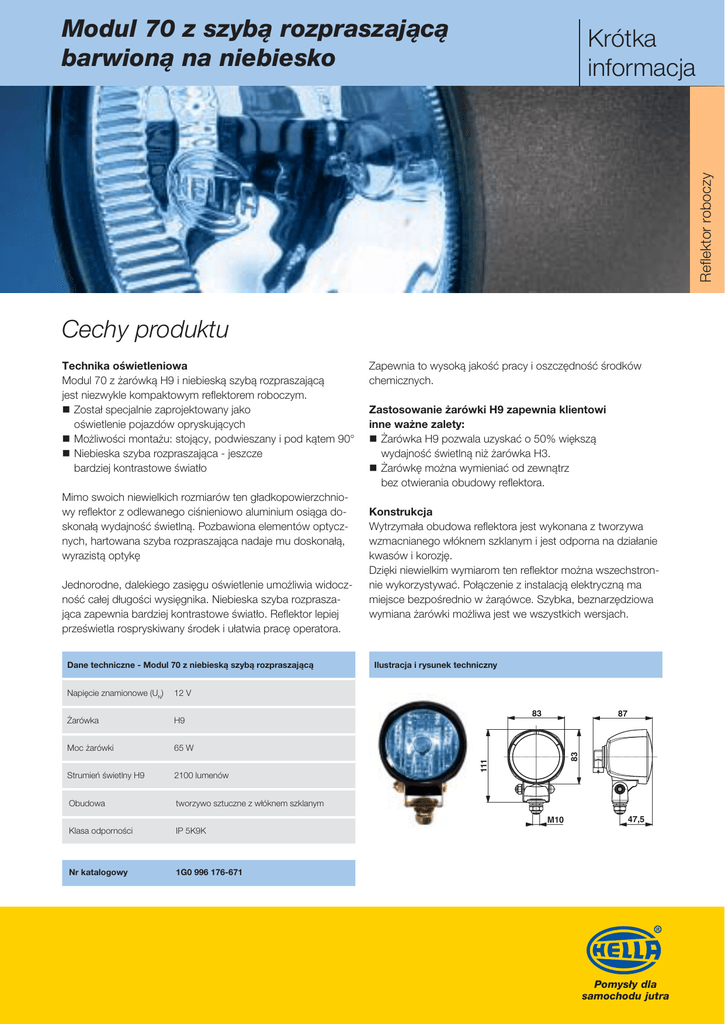 Krótka informacja Reflektor roboczy Modul 70 z szybą rozpraszającą barwioną na niebiesko Cechy produktu Technika oświetleniowa Modul 70 z żarówką H9 i niebieską szybą rozpraszającą jest niezwykle kompaktowym reflektorem roboczym. Został specjalnie zaprojektowany jako oświetlenie pojazdów opryskujących Możliwości montażu: stojący, podwieszany i pod kątem 90° Niebieska szyba rozpraszająca - jeszcze bardziej kontrastowe światło Mimo swoich niewielkich rozmiarów ten gładkopowierzchniowy reflektor z odlewanego ciśnieniowo aluminium osiąga doskonałą wydajność świetlną. Pozbawiona elementów optycznych, hartowana szyba rozpraszająca nadaje mu doskonałą, wyrazistą optykę Jednorodne, dalekiego zasięgu oświetlenie umożliwia widoczność całej długości wysięgnika. Niebieska szyba rozpraszająca zapewnia bardziej kontrastowe światło. Reflektor lepiej prześwietla rospryskiwany środek i ułatwia pracę operatora. Dane techniczne - Modul 70 z niebieską szybą rozpraszającą Napięcie znamionowe (UN) 12 V Żarówka H9 Moc żarówki 65 W Strumień świetlny H9 2100 lumenów Obudowa tworzywo sztuczne z włóknem szklanym Klasa odporności IP 5K9K Nr katalogowy 1G0 996 176-671 Zapewnia to wysoką jakość pracy i oszczędność środków chemicznych. Zastosowanie żarówki H9 zapewnia klientowi inne ważne zalety: Żarówka H9 pozwala uzyskać o 50% większą wydajność świetlną niż żarówka H3. Żarówkę można wymieniać od zewnątrz bez otwierania obudowy reflektora. Konstrukcja Wytrzymała obudowa reflektora jest wykonana z tworzywa wzmacnianego włóknem szklanym i jest odporna na działanie kwasów i korozję. Dzięki niewielkim wymiarom ten reflektor można wszechstronnie wykorzystywać. Połączenie z instalacją elektryczną ma miejsce bezpośrednio w żarąówce. Szybka, beznarzędziowa wymiana żarówki możliwa jest we wszystkich wersjach. Ilustracja i rysunek techniczny Pomysły dla samochodu jutra Rozkład światła © Hella KGaA Hueck & Co., Lippstadt 09.10 Przykład zastosowania Pomysły dla samochodu jutra