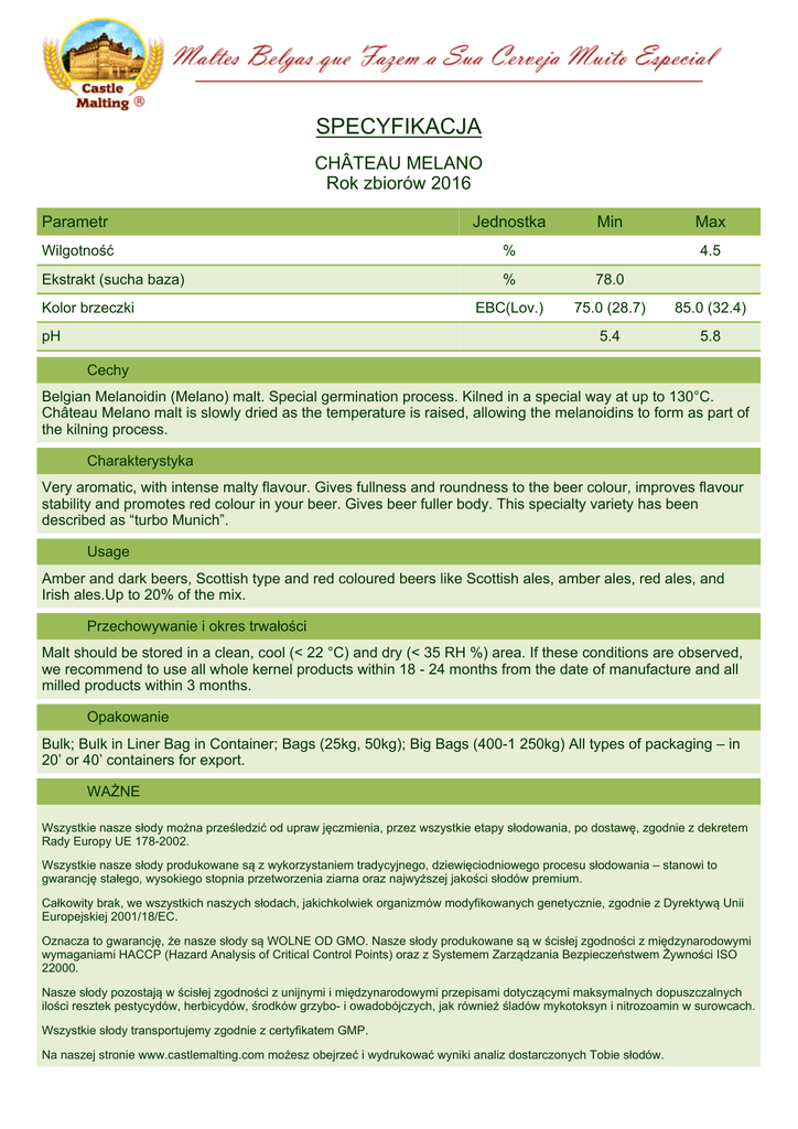SPECYFIKACJA CHÂTEAU MELANO Rok zbiorów 2016 Parametr Jednostka Min Max Wilgotność % 4.5 Ekstrakt (sucha baza) % 78.0 EBC(Lov.) 75.0 (28.7) 85.0 (32.4) 5.4 5.8 Kolor brzeczki pH Cechy Belgian Melanoidin (Melano) malt. Special germination process. Kilned in a special way at up to 130°C. Château Melano malt is slowly dried as the temperature is raised, allowing the melanoidins to form as part of the kilning process. Charakterystyka Very aromatic, with intense malty flavour. Gives fullness and roundness to the beer colour, improves flavour stability and promotes red colour in your beer. Gives beer fuller body. This specialty variety has been described as “turbo Munich”. Usage Amber and dark beers, Scottish type and red coloured beers like Scottish ales, amber ales, red ales, and Irish ales.Up to 20% of the mix. Przechowywanie i okres trwałości Malt should be stored in a clean, cool (< 22 °C) and dry (< 35 RH %) area. If these conditions are observed, we recommend to use all whole kernel products within 18 - 24 months from the date of manufacture and all milled products within 3 months. Opakowanie Bulk; Bulk in Liner Bag in Container; Bags (25kg, 50kg); Big Bags (400-1 250kg) All types of packaging – in 20’ or 40’ containers for export. WAŻNE Wszystkie nasze słody można prześledzić od upraw jęczmienia, przez wszystkie etapy słodowania, po dostawę, zgodnie z dekretem Rady Europy UE 178-2002. Wszystkie nasze słody produkowane są z wykorzystaniem tradycyjnego, dziewięciodniowego procesu słodowania – stanowi to gwarancję stałego, wysokiego stopnia przetworzenia ziarna oraz najwyższej jakości słodów premium. Całkowity brak, we wszystkich naszych słodach, jakichkolwiek organizmów modyfikowanych genetycznie, zgodnie z Dyrektywą Unii Europejskiej 2001/18/EC. Oznacza to gwarancję, że nasze słody są WOLNE OD GMO. Nasze słody produkowane są w ścisłej zgodności z międzynarodowymi wymaganiami HACCP (Hazard Analysis of Critical Control Points) oraz z Systemem Zarządzania Bezpieczeństwem Żywności ISO 22000. Nasze słody pozostają w ścisłej zgodności z unijnymi i międzynarodowymi przepisami dotyczącymi maksymalnych dopuszczalnych ilości resztek pestycydów, herbicydów, środków grzybo- i owadobójczych, jak również śladów mykotoksyn i nitrozoamin w surowcach. Wszystkie słody transportujemy zgodnie z certyfikatem GMP. Na naszej stronie www.castlemalting.com możesz obejrzeć i wydrukować wyniki analiz dostarczonych Tobie słodów. Siedziba: Chemin du Couloury 1, 4800 Lambermont, Belgia Słodownia: Rue de Mons 94, 7970 Beloeil, Belgia Tel.: + 32 (0) 87 662095; Fax: +32 (0) 87 352234; [email protected]; www.castlemalting.com Zarejestrowana Tournai 79754; VAT: BE.455013439; IBAN: BE11 3700 9054 5648; BIC. BBRUBEBB