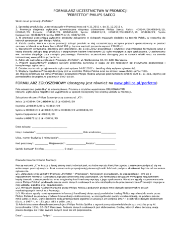 FORMULARZ UCZESTNICTWA W PROMOCJI "PERFETTO!" PHILIPS SAECO Skrót zasad promocji „Perfetto!” 1. Sprzedaż produktów uczestniczących w Promocji trwa od 4.11.2011 r. do 31.12.2011 r. 2. Promocja obejmuje wyłącznie automatyczne ekspresy ciśnieniowe Philips Saeco: Xelsis: HD8944/09,HD8943/19, HD8943/29; Exprelia: HD8856/09, HD8854/09; Syntia: HD8833/19, HD8837/09,HD8836/19, HD8836/29; Syntia Cappuccino: HD8838/09; Intelia: HD8751/19, HD8752/49. 3. W promocji uczestniczą wyłącznie produkty zakupione w sklepach mających siedzibę na terenie Polski, w stosunku do których gwarantem jest Philips Polska. 4. Każda osoba, która w czasie promocji zakupi produkt w niej uczestniczący otrzyma prezent gwarantowany w postaci zestawu szklanek oraz kawy Saeco Gold 500 g. Łączna wartość prezentu wynosi 250,00 zł. 5. Warunkiem otrzymania prezentu jest przesłanie, do 31.01.2012 prawidłowo i czytelnie wypełnionego formularza wraz z kopią dowodu zakupu tego produktu i oryginalnym kodem kreskowym (13 cyfr) wyciętym z jego opakowania. O zachowaniu ww. terminu decyduje data stempla pocztowego. Formularz uczestnictwa dostępny jest w ramach ulotki oraz na stronie internetowej www.philips.pl/perfetto. 6. Adres do nadsyłania zgłoszeń: Promocja „Perfetto!”, ul. Wolbromska 38, 03-680, Warszawa. 7. Prezent gwarantowany zostanie wysłany przesyłką kurierską w ciągu 30 dni roboczych od otrzymania poprawnego i kompletnego zgłoszenia. 8. Ostateczny termin przyjmowania zgłoszeń upływa 14.02.2012 r. (według daty wpływu zgłoszenia). 9. Wiążący regulamin Promocji dostępny jest w siedzibie Philips Polska oraz na stronie: www.philips.pl/perfetto. 10. Więcej informacji na temat Promocji i produktów Philips można uzyskać pod numerem infolinii 800 31 11 318, czynnej od poniedziałku do piątku, w godzinach 9.00-18.00. FORMULARZ ZGŁOSZENIOWY (dostępny jest również na www.philips.pl/perfetto) Pola oznaczone gwiazdką* są obowiązkowe. Prosimy o czytelne wypełnienie DRUKOWANYMI literami. Zgłoszenia niepełne lub wypełnione w sposób nieczytelny nie wezmą udziału w Promocji. Zakupiony ekspres Philips Saeco (proszę zaznaczyć „X”)*: Xelsis ❏ HD8944/09 ❏ HD8943/19 ❏ HD8943/29 Exprelia ❏ HD8856/09 ❏ HD8854/09 Syntia ❏ HD8833/19 ❏ HD8837/09 ❏ HD8836/19 ❏ HD8836/29 Syntia Cappuccino ❏ HD8838/09 Intelia ❏ HD8751/19 ❏ HD8752/49 Data zakupu: _____________________________ Imię i nazwisko*: ______________________________________ Rok urodzenia:____________ Ulica, numer budynku i mieszkania*:_______________________________________________ Kod pocztowy*: ___________ Miejscowość*: ________________Poczta*:________________ Szybki kontakt* Telefon:________________ E-mail: ___________________________________ Oświadczenia Uczestnika Promocji Proszę wstawić „X” w kratce z lewej strony treści oświadczeń, na które wyraża Pani/Pan zgodę, a następnie podpisać się we wskazanym poniżej miejscu. Brak zaznaczenia przynajmniej pierwszej kratki lub brak podpisu skutkować będzie odrzuceniem zgłoszenia. ❏ 1. Zgłaszam swój udział w Promocji „Perfetto! ” (Promocja)*. Niniejszym oświadczam, że zapoznałam (-em) się z regulaminem Promocji i akceptuję jego postanowienia bez zastrzeżeń. Do formularza dołączam wymagane regulaminem: kopię dowodu zakupu produktu oraz oryginalny kod kreskowy wycięty z jego opakowania. Wyrażam zgodę na przetwarzanie przez Philips Polska1 podanych przeze mnie danych osobowych w celu niezbędnym do przeprowadzenia Promocji i mojego w niej udziału, zgodnie z jej regulaminem. ❏ 2. Wyrażam zgodę na przetwarzanie przez Philips Polska1 podanych przeze mnie danych osobowych w celach marketingowych innych niż Promocja. ❏ 3. Wyrażam zgodę na otrzymywanie informacji handlowej dotyczącej produktów i usług Philips wysyłanej do mnie przez Philips Polska1 za pomocą środków komunikacji elektronicznej, w szczególności poczty elektronicznej, na podany przeze mnie adres e-mail. Dane osobowe będą przetwarzane zgodnie z ustawą z 29 sierpnia 1997 r. o ochronie danych osobowych (Dz.U. z 1997 r., nr 133, poz. 883 z późn. zm.). 1) Administratorem danych osobowych jest Philips Polska Spółka z ograniczoną odpowiedzialnością z siedzibą przy Al. Jerozolimskie 195b, 02-222 Warszawa. Podanie danych osobowych jest dobrowolne. Osoby, których dane dotyczą, mają prawo dostępu do treści swoich danych oraz do ich poprawiania. Data*: _______________ Podpis*: _________________________
