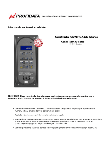 Informacje na temat produktu Centrala CDNP6ACC Slave Cena: 519,00 netto 638,00 brutto CDNP6ACC Slave - centrala domofonowa podrzędna przeznaczona do współpracy z panelami CDNP Master w prostej 2 żyłowej instalacji domofonowej Centrale domofonowe CDNP6ACC to nowoczesne urządzenia z cyfrowym wybieraniem numeru lokalu oraz kodowym otwieraniem drzwi. Posiada wbudowany czytnik breloków zbliżeniowych. Zapewnia to maksymalne zabezpieczenie przed aktami wandalizmu oraz wpływem warunków atmosferycznych. Zastosowanie nowoczesnego wyświetlacza LCD zapewnia prostą i przyjazną obsługę przez użytkowników jak i instalatorów. Centralę możemy łączyć z bardzo szeroką gamą modułów dodatkowych dzięki czemu jej funkcjonalność może sprostać indywidualnym oczekiwanion klientów. Urządzenia są w pełni dostosowane do obsługi przez osoby niewidzące i niesłyszące. Bardzo szerokie możliwości konfiguracyjne oraz programowanie zarówno z poziomu klawiatury jak i komputera sprawia, że te produkty znajdują wszechstronne zastosowanie w różnego rodzaju inwestycjach. Urządzenie pracuje w instalacji dwużyłowej i współpracuje z unifonami z cyfrowym dekodowaniem numeru, np. INS-UP, INS-UP720B lub INS-UP720M. Zastosowanie nowoczesnego podgrzewanego wyświetlacza LCD umożliwia prostą komunikację między urządzeniem a użytkownikiem. Domofony cyfrowe CDNP6ACC dają możliwość budowy złożonych systemów wielowejściowych w układach Master / Slave, składających się z wielu rozmównic, np.: zamknięte osiedla mieszkaniowe, portiernia, brama główna, wejścia do budynków, systemy hotelowe itp. Oznacza to komunikację z wybranym lokalem zarówno z wejścia na teren posesji, jak i z wejść do poszczególnych budynków czy klatek schodowych. Niezależnie od stopnia skomplikowania systemu działa on zawsze tylko na dwóch żyłach. Dodatkowym atutem jest możliwość przekierowania połączeń do portierni. Szczegółowe informacje na temat centrali zawiera karta katalogowa. Więcej produktów na www.profidata.pl PROFIDATA Grzegorz Pniak ul. Klonowa 41a 40-168 Katowice [email protected] Tel: 32 20 62 404 GSM: 509 099 412 fax: 32 20 33 119 NIP: PL634-014-18-08 REGON: 003534943 Nr konta bankowego: 561160 2202 0000 000 11439 9656 Wpis do ewidencji działalności gospodarczej prowadzonej przez Prezydenta Miasta Katowice pod numerem 12532. Powered by TCPDF (www.tcpdf.org)