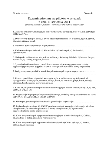 Nr kodu .............. Wersja B Egzamin pisemny na pilotów wycieczek z dnia 11 kwietnia 2011 (prosimy zakreślić „kółkami” lub wpisać prawidłowe odpowiedzi) 1. Znanymi firmami wynajmującymi samochody (rent a car) są: a) Avis, b) Amic, c) Budget, d) Hertz, e) Polo 2. Dwuosobowy pokój w hotelu, z dwom oddzielnymi łóżkami to: a) double, b) pair, c) twin, d) quatro, e) żadne z nich 3. Najstarsza polska organizacja turystyczna to: ………………………………………………. 4. Karkonosze leżą w Sudetach: a) Wschodnich, b) Środkowych, c) Zachodnich, d) Północnych 5. Na Pojezierzu Mazurskim leżą jeziora: a) Mamry, Śniardwy, Miedwie, b) Mamry, Orzysz, Raduńskie, c) Mamry, Niegocin, Nidzkie 6. Sytuacja określana mianem rynku klienta oznacza: a) przewagę popytu nad podażą, b) przewagę podaży nad popytem, c) jest to sytuacja zrównoważenia oferty turystycznej 7. Podaj pełną nazwę wielkich, wrześniowych stołecznych targów turystycznych …………… …………………………………………………………………………………………………... 8. Zaznacz prawidłową odpowiedź szeregując style w architekturze wg kolejności ich występowania: a) klasycyzm, renesans, secesja, barok, b) romański, gotyk, barok, secesja, c) rococo, barok, secesja, klasycyzm, art-deco 9. Które z tych symboli należą do statusów rezerwacyjnych biletów lotniczych: a) KS, b) PIR, c) OK, d) WL, e) LW 10. Organizacja Współpracy Gospodarczej i Rozwoju, do której należy także Polska ma skrót: a) IATA, b) UN, c) GATT, d) OECD, e) OPEC 11. Głównym gestorem polskich schronisk górskich jest organizacja: ……………………… 12. Polisa ubezpieczeniowa KL i NNW powinna zawierać następujące informacje: a) zakres ubezpieczenia, b) okres ubezpieczenia, c) kwotę ubezpieczenia, d) ograniczenie odpowiedzialności osoby ubezpieczonej 13. Które z wymienionych są systemami rezerwacyjnymi biletów lotniczych: a) Galileo, b) Amadeus, c) Sabre, d) żadne z wymienionych 14. Które z wymienionych są państwami federacyjnymi: a) Chiny, b) Rosja, c) Austria, d) Irlandia, e) Hiszpania 15. Beskidy należą do pasma: a) Pienin, b) Tatr, c) Gorców, d) Karpat, e) inne 16. Górskie Parki Narodowe to: a) Słowiński i Woliński, b) Świętokrzyski i Roztoczański, c) Gorczański i Tatrzański, d) Karkonoski i Słowiński 17. Archipelag Lofotów należy do: a) Rosji, b) Szwecji, c) Finlandii, d) Danii, e) Norwegii 18. Ozdobne zwieńczenie fasady budynku stosowane w renesansie to: a) maureska, b) biforia, c) attyka, d) portal, e) podesta 19. Cieśnina Bosfor oddziela morza: a) Czarne od Śródziemnego, b) Czarne od Marmara, c) Czarne od Azowskiego, d) Czarne od Czerwonego 20. Wolna akwizycja na wyjazd turystyczny następuje wtedy, gdy: a) produkt jest do nabycia w wielu miejscach, b) każdy wyjeżdżający zawiera umowę oddzielnie, c) żadne z wymienionych 21. Wymień (min.3) polskich laureatów literackiej Nagrody Nobla ………………………… …………………………………………………………………………………………………... 22. Faktura proforma to: a) faktura korygująca pomyłki, b) wstępna faktura sygnalizująca wielkość przyszłego obciążenia, c) inne 23. W negocjacjach należy: a) doprowadzić problem do ludzi, b) oddzielić problem od ludzi, c) skoncentrować się na stanowiskach 24. Kampingi mają (ile?) …… kategorie i są one oznaczane (czym?) ………………………… 25. Wojewoda w Polsce jest organem: a) samorządu terytorialnego, b) przełożonym starostów powiatowych na danym teranie, c) terenowej administracji państwowej 26. Zachowania niewerbalne służą: a) wyrażeniu emocji, b) przenoszeniu postaw, c) potwierdzenia prawdomówności 27. Zaplanowana przerwa w podróży, uzgodniona z przewoźnikiem, to: a) stand-by, b) brake time, c) travel free time, d) stopover, e) stop time 28. Allotment to pojęcie związane z: a) programem zwiedzania, b) odpowiedzialnością deliktową, c) hotelem, d) środkami transportu 29. Ustawa o usługach turystycznych określa następujące rodzaje obiektów hotelarskich: a) stanice wodne, b) bungalowy, c) hacjendy, d) kampingi, e) pola namiotowe 30. Cechami psychodemograficznymi turysty są: a) wiek, b) dochód, c) wykształcenie, d) orientacja seksualna, e) przynależność do organizacji społeczno-politycznych
