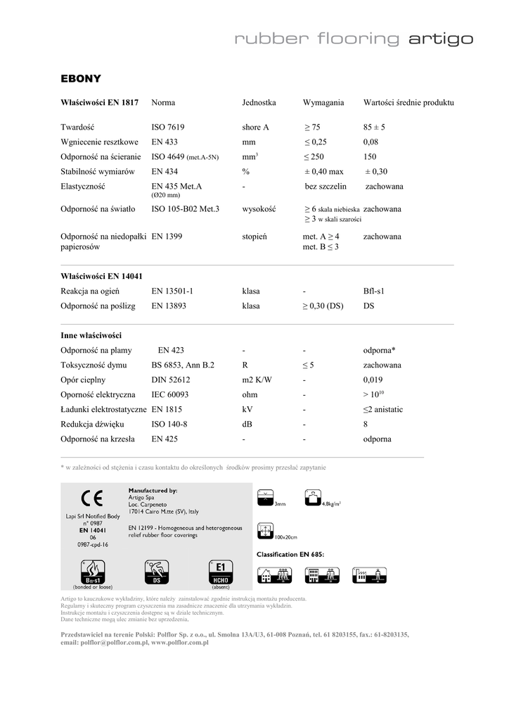 EBONY Właściwości EN 1817 Norma Jednostka Wymagania Wartości średnie produktu Twardość ISO 7619 shore A ≥ 75 85 ± 5 Wgniecenie resztkowe EN 433 mm ≤ 0,25 0,08 ≤ 250 150 3 Odporność na ścieranie ISO 4649 (met.A-5N) mm Stabilność wymiarów EN 434 % ± 0,40 max ± 0,30 Elastyczność EN 435 Met.A - bez szczelin zachowana wysokość ≥ 6 skala niebieska zachowana ≥ 3 w skali szarości stopień met. A ≥ 4 met. B ≤ 3 zachowana (Ø20 mm) Odporność na światło ISO 105-B02 Met.3 Odporność na niedopałki EN 1399 papierosów Właściwości EN 14041 Reakcja na ogień EN 13501-1 klasa - Bfl-s1 Odporność na poślizg EN 13893 klasa ≥ 0,30 (DS) DS - - odporna* Inne właściwości Odporność na plamy EN 423 Toksyczność dymu BS 6853, Ann B.2 R ≤5 zachowana Opór cieplny DIN 52612 m2 K/W - 0,019 Oporność elektryczna IEC 60093 ohm - > 1010 Ładunki elektrostatyczne EN 1815 kV - ≤2 anistatic Redukcja dźwięku ISO 140-8 dB - 8 Odporność na krzesła EN 425 - - odporna * w zależności od stężenia i czasu kontaktu do określonych środków prosimy przesłać zapytanie Artigo to kauczukowe wykładziny, które należy zainstalować zgodnie instrukcją montażu producenta. Regularny i skuteczny program czyszczenia ma zasadnicze znaczenie dla utrzymania wykładzin. Instrukcje montażu i czyszczenia dostępne są w dziale technicznym. Dane techniczne mogą ulec zmianie bez uprzedzenia. Przedstawiciel na terenie Polski: Polflor Sp. z o.o., ul. Smolna 13A/U3, 61-008 Poznań, tel. 61 8203155, fax.: 61-8203135, email: [email protected], www.polflor.com.pl