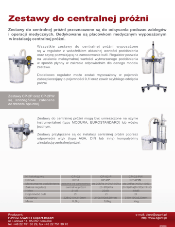 Zestawy do centralnej próżni przeznaczone są do odsysania podczas zabiegów i operacji medycznych. Dedykowane są placówkom medycznym wyposażonym w instalację centralnej próżni. Wszystkie zestawy do centralnej próżni wyposażone są w regulator z wskaźnikiem aktualnej wartości podciśnienia oraz szynę pozwalającą na zamocowanie butli. Regulator pozwala na ustalenie maksymalnej wartości wytwarzanego podciśnienia w sposób płynny w zakresie odpowiednim dla danego modelu zestawu. Dodatkowo regulator może zostać wyposażony w pojemnik zabezpieczający o pojemności 0,1l oraz zawór szybkiego odcięcia próżni. Zestawy CP-2P oraz CP-2PW s ą s zczególnie zalecane do drenażu opłucnej. Zestawy do centralnej próżni mogą być umieszczone na szynie instrumentalnej (typu MODURA, EUROSTANDARD) lub wózku jezdnym. Zestawy przyłączane są do instalacji centralnej próżni poprzez odpowiedni wtyk (typu AGA, DIN lub inny) kompatybilny z instalacją centralnej próżni. Nr katalogowy CP-02 CP-02-P CP-02-PW Nazwa CP-2 CP-2P CP-2PW Maksymalne podciśnienie zależnie od parametrów do 20kPa (+0%/-10%) do 3kPa (+0%/-10%) Zakres regulacji centralnej próżni (0÷20)kPa (0÷3)kPa(0÷30)cmH2O Hałas 21dB 22dB 48dB Pojemność butli 2l 2l 2l Gabaryty 225x210x319mm 310x190x620mm 310x190x320mm Masa 0,8kg 0,8kg 4kg Producent: P.P.H.U. OGARIT Export-Import ul. Ludowa 14, 05-092 Łomianki tel. +48 22 751 36 29, fax +48 22 751 39 76 e-mail: [email protected] http: www.ogarit.pl 20140508