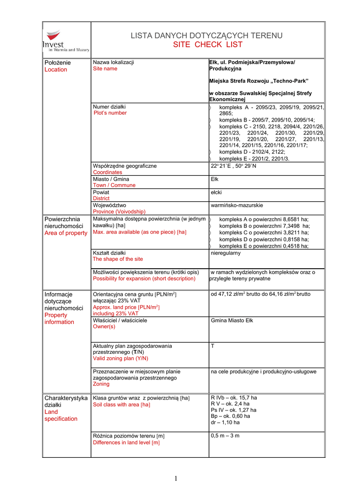 LISTA DANYCH DOTYCZĄCYCH TERENU SITE CHECK LIST Położenie Location Nazwa lokalizacji Site name Ełk, ul. Podmiejska/Przemysłowa/ Produkcyjna Miejska Strefa Rozwoju „Techno-Park” Numer działki Plot’s number Powierzchnia nieruchomości Area of property Współrzędne geograficzne Coordinates Miasto / Gmina Town / Commune Powiat District Województwo Province (Voivodship) Maksymalna dostępna powierzchnia (w jednym kawałku) ha Max. area available (as one piece) ha Kształt działki The shape of the site Możliwości powiększenia terenu (krótki opis) Possibility for expansion (short description) Informacje dotyczące nieruchomości Property information w obszarze Suwalskiej Specjalnej Strefy Ekonomicznej kompleks A - 2095/23, 2095/19, 2095/21, 2865; kompleks B - 2095/7, 2095/10, 2095/14; kompleks C - 2150, 2218, 2094/4, 2201/26, 2201/23, 2201/24, 2201/30, 2201/29, 2201/19, 2201/20, 2201/27, 2201/13, 2201/14, 2201/15, 2201/16, 2201/17; kompleks D - 2102/4, 2122; kompleks E - 2201/2, 2201/3. 22o 21`E , 50o 29`N Ełk ełcki warmińsko-mazurskie kompleks A o powierzchni 8,6581 ha; kompleks B o powierzchni 7,3498 ha; kompleks C o powierzchni 3,8211 ha; kompleks D o powierzchni 0,8158 ha; kompleks E o powierzchni 0,4518 ha; nieregularny w ramach wydzielonych kompleksów oraz o przyległe tereny prywatne Orientacyjna cena gruntu PLN/m2 włączając 23% VAT Approx. land price PLN/m2 including 23% VAT Właściciel / właściciele Owner(s) od 47,12 zł/m2 brutto do 64,16 zł/m2 brutto Aktualny plan zagospodarowania przestrzennego (T/N) Valid zoning plan (Y/N) T Przeznaczenie w miejscowym planie zagospodarowania przestrzennego Zoning na cele produkcyjne i produkcyjno-usługowe Charakterystyka Klasa gruntów wraz z powierzchnią ha Soil class with area ha działki Land specification Różnica poziomów terenu m Differences in land level m Gmina Miasto Ełk R IVb – ok. 15,7 ha R V – ok. 2,4 ha Ps IV – ok. 1,27 ha Bp – ok. 0,60 ha dr – 1,10 ha 0,5 m – 3 m 1 Obecne użytkowanie Present usage nie wykorzystane Zanieczyszczenia wód powierzchniowych i gruntowych (T/N) Soil and underground water pollution (Y/N) Poziom wód gruntowych m Underground water level m N Czy były prowadzone badania geologiczne terenu (T/N) Were geological research done (Y/N) N Ryzyko wystąpienia zalań lub obsunięć terenu (T/N) Risk of flooding or land slide (Y/N) N Przeszkody podziemne (T/N) Underground obstacles (Y/N) przez działkę o nr 2094/4 przebiegają linie energetyczne (kompleks C) brak danych Przeszkody występujące na powierzchni terenu miejscowo występujące skupiska drzew (T/N) Ground and overhead obstacles (Y/N) Połączenia transportowe Transport links Istniejące ograniczenia ekologiczne (T/N) Ecological restrictions (Y/N) brak danych Budynki i zabudowania na terenie (T/N) Buildings / other constructions on site (Y/N) N Droga dojazdowa do terenu (rodzaj drogi i jej szerokość) Access road to the plot (type and width of access road) Autostrada / droga krajowa km Nearest motorway / national road km ul. Podmiejska i ul. Produkcyjna (jezdnia o nawierzchni asfaltowej, o szerokości 7-8 m, pas drogowy o szerokości 14-28 m; drogi krajowe – 16, 65; 0,4 -1,5 km Porty rzeczne i morskie w odległości do 200 km Gdańsk/Gdynia – 335 km/360 km Sea and river ports located up to 200 km Kłajpeda (Litwa) – 400 km Istniejąca infrastruktura Kolej km Railway line km w sąsiedztwie około 2,5 km Bocznica kolejowa km Railway siding km zelektryfikowany zespół bocznic kolejowych w sąsiedztwie ok. 2,5 km. Najbliższe lotnisko międzynarodowe km Nearest international airport km Warszawa 230 km Szczytno-Szymany 104 km. Wilno 230 km Najbliższe miasto wojewódzkie km Nearest province capital km Olsztyn 164 km Białystok 100 km Elektryczność na terenie (T/N) Electricity (Y/N) T 2 Existing infrastructure Odległość przyłącza od granicy terenu Connection point (distance from boundary) m Napięcie Voltage kV w odległości od 200 m do 700 m znajduje się Główny Punkt Zasilania Dostępna moc Available capacity MW 2x16 MVA Gaz na terenie (T/N) Gas (Y/N) T Odległość przyłącza od granicy działki Connection point (distance from boundary) m Wartość kaloryczna Calorific value MJ/Nm3 ok. 1 km - 2 km Średnica rury Pipe diameter mm 200 Dostępna objętość Available capacity Nm3/h według potrzeb Osoba przygotowująca ofertę Offer prepared by 31 MJ/Nm3 Woda na terenie (T/N) Water supply (Y/N) T Odległość przyłącza od granicy terenu Connection point (distance from boundary) m Dostępna objętość Available capacity m3/24h bezpośrednio przy granicy działek Kanalizacja na terenie (T/N) Sewage discharge (Y/N) T Odległość przyłącza od granicy terenu Connection point (distance from boundary) m Dostępna objętość Available capacity m3/24h bezpośrednio przy granicy działek Oczyszczalnia ścieków na terenie bądź w bezpośrednim sąsiedztwie Treatment plant (Y/N) Telefony (T/N) Telephone (Y/N) Uwagi Comments 110kV/15kV 1700 m3/24h 1200 m3/24h T w odległości ok. 8 km w Nowej Wsi Ełckiej T Odległość przyłącza od granicy terenu przy granicy działek przebiega sieć Connection point (distance from teletechniczna boundary) m Tereny włączone do Suwalskiej Specjalnej Strefy Ekonomicznej, istnieje możliwość zwolnienia z podatku dochodowego w wysokości do 70% poniesionych nakładów inwestycyjnych na terenie SSSE. Tereny zlokalizowane w odległości ok. 150 m od planowanej trasy Via Baltica. Imię, nazwisko, stanowisko, tel., tel. komórkowy, e-mail, znajomość języków obcych Marta Herbszt, Naczelnik Wydziału Planowania Przestrzennego i Gospodarki Nieruchomościami Urzędu Miasta Ełku tel.: + 48 87 732 62 36 [email protected] Tomasz Szymański, Kierownik Referatu Gospodarki Nieruchomościami Urzędu Miasta Ełku tel.: + 48 87 732 61 55 [email protected] 3 Osoby do kontaktu Contact person Imię, nazwisko, stanowisko, tel., tel. komórkowy, e-mail, znajomość języków obcych 